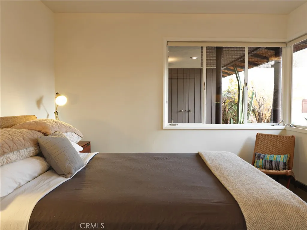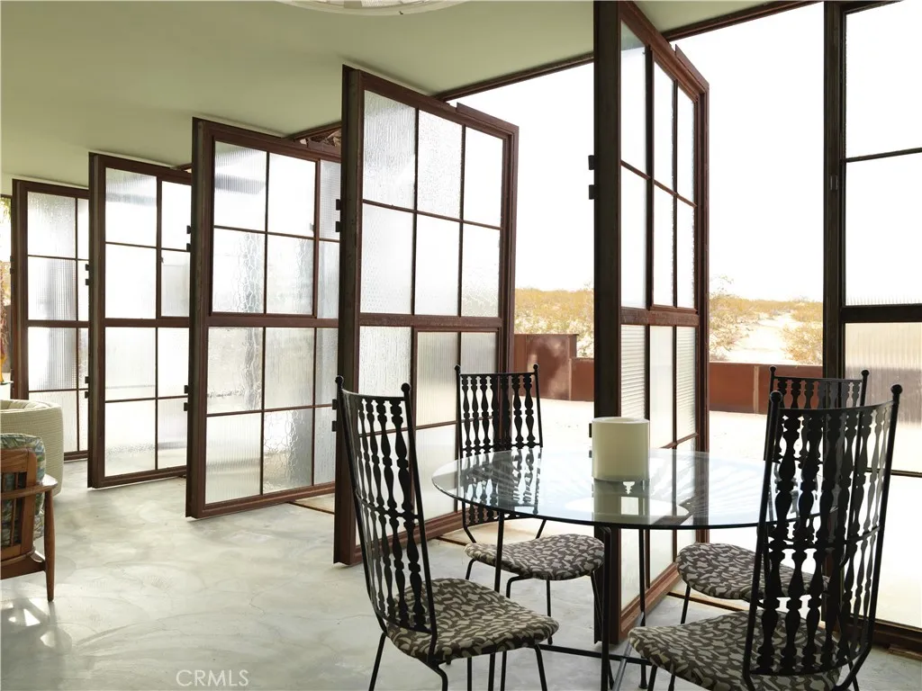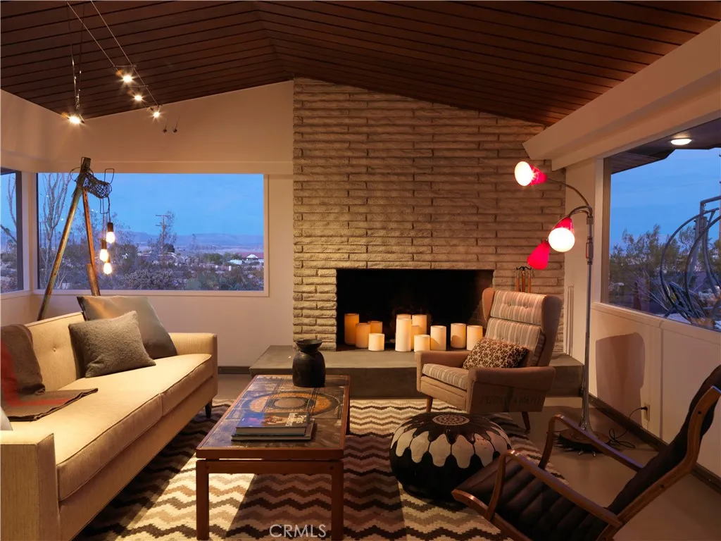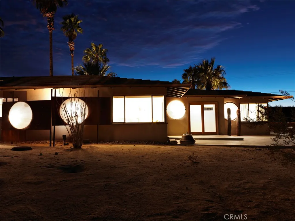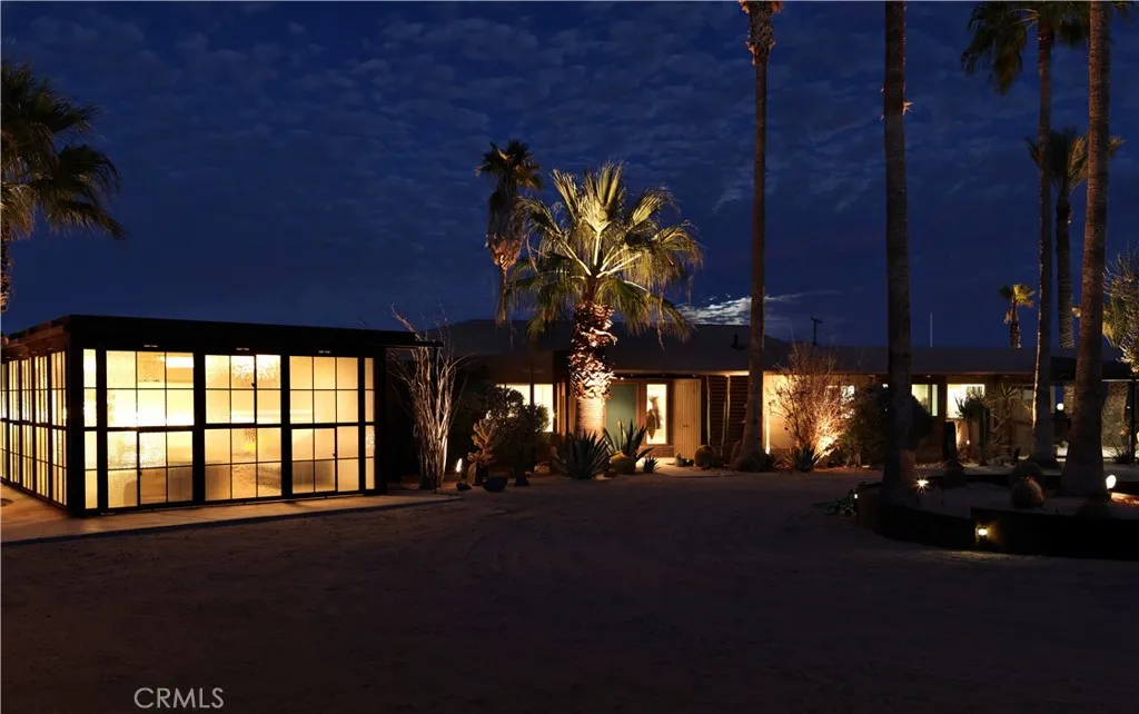 ***HUELL HOWSERS 80-ACRE MID-CENTURY RETREAT*** Formerly owned by Huell Howser, this mid-century gem is situated on 82.7 acres and has breathtaking, unobstructed views of Joshua Tree National Park and the surrounding areas. The land is comprised of 2 legal parcels, each with additional development potential, without any subdividing. The house is situated on an 11.9-acre parcel (0614-321-38) and additional structures such as an ADU could be built. The other parcel (0615-261-01) totals 70.82 acres and protects the unobstructed national park views and amazing sunrises. It is zoned for single family homes on 1-acre lots. This parcel could also be developed with another estate home or multiple homes. After the passing of Huell in 2013, the current ownership fully restored the property and turned it into a vacation rental and wedding/event space. The home is partially gated and the grounds around the home feature mature palm trees and beautiful desert gardens that are enclosed by an iconic, architecturally designed, rusted steel fence. Extensive outdoor lighting, chosen by Huell, allows the spaces to be enjoyed in both the day and the nighttime. The home has 2 bedrooms and 2 bathrooms, a galley kitchen with a breakfast table, a great room with a wood-burning fireplace, a den/TV room or third bedroom, and a beautiful glass atrium or tea room. The master bedroom is furnished with a king-size bed, and a toddler/(day) bed. The second bedroom has a queen-size bed. The third bedroom is set up as a den or TV room, with a sofa that converts to a queen-size bed, desk & TV. The galley kitc