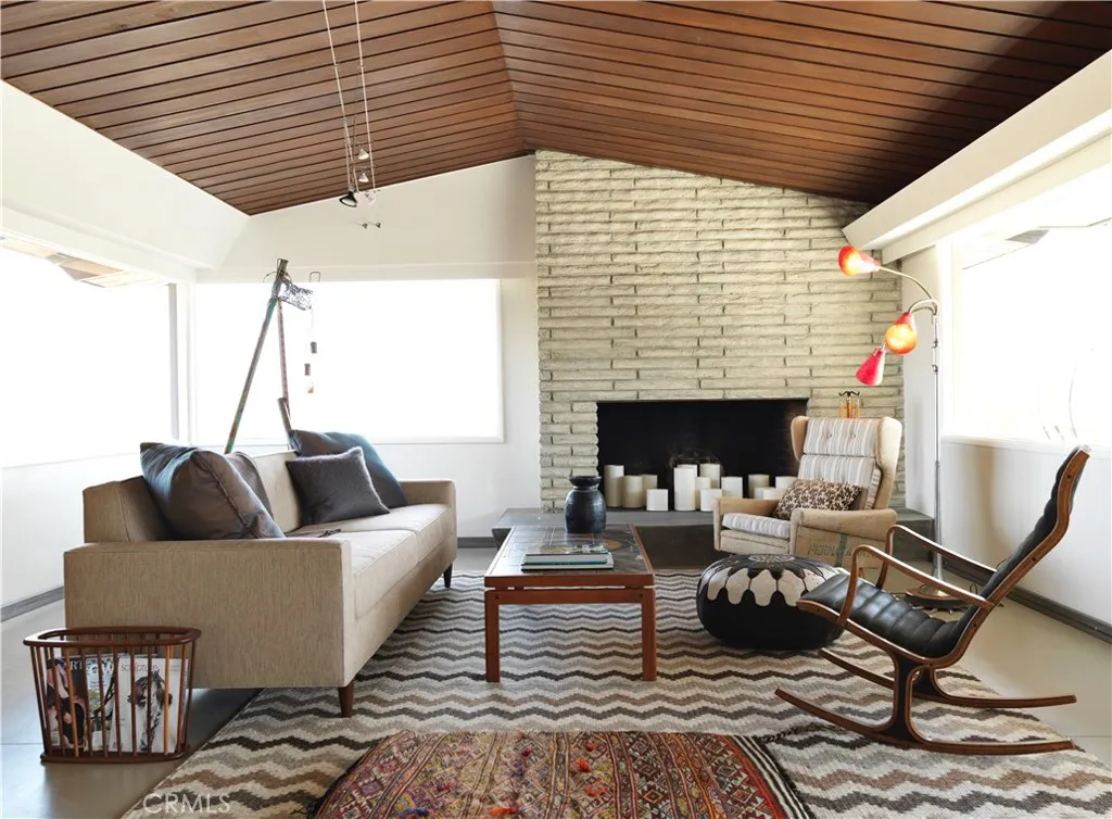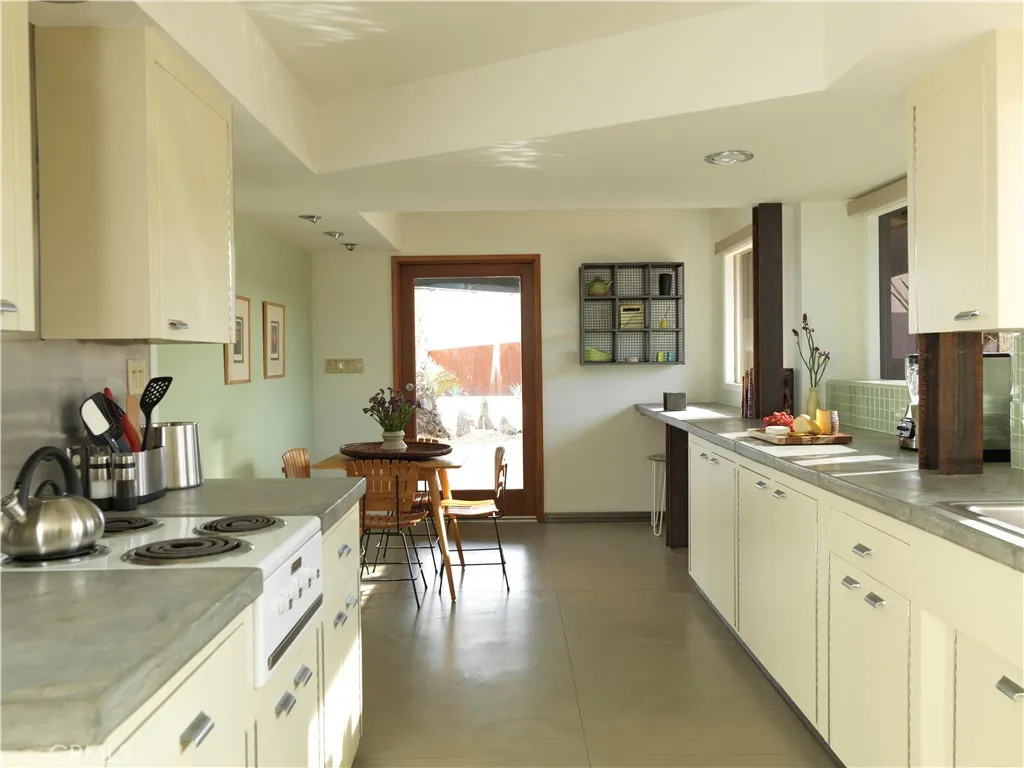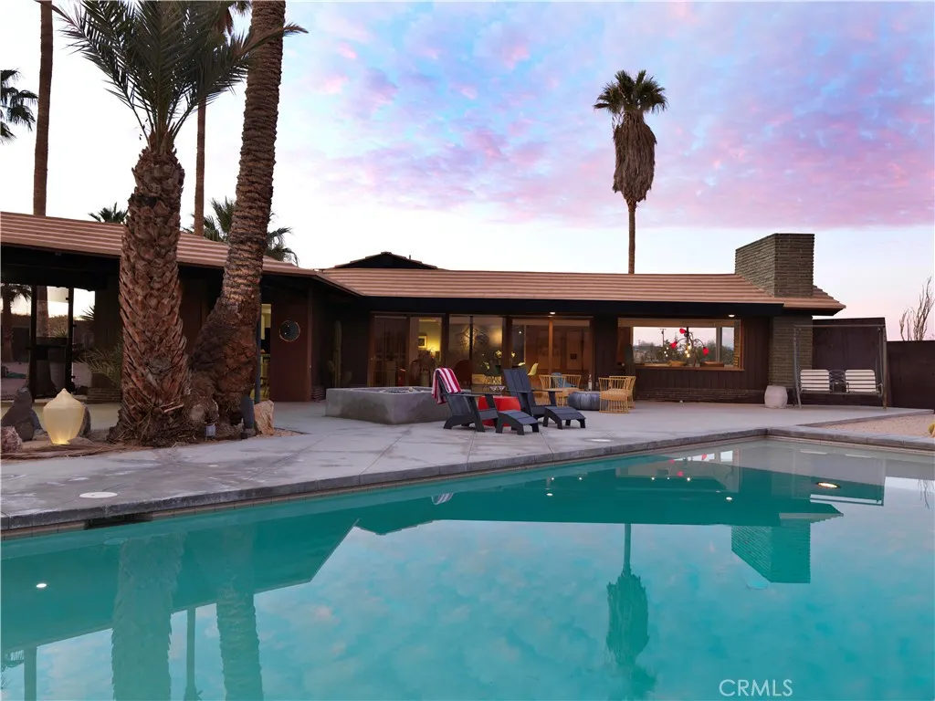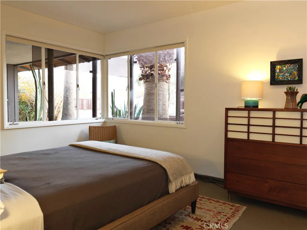 ***HUELL HOWSERS 80-ACRE MID-CENTURY RETREAT*** Formerly owned by Huell Howser, this mid-century gem is situated on 82.7 acres and has breathtaking, unobstructed views of Joshua Tree National Park and the surrounding areas. The land is comprised of 2 legal parcels, each with additional development potential, without any subdividing. The house is situated on an 11.9-acre parcel (0614-321-38) and additional structures such as an ADU could be built. The other parcel (0615-261-01) totals 70.82 acres and protects the unobstructed national park views and amazing sunrises. It is zoned for single family homes on 1-acre lots. This parcel could also be developed with another estate home or multiple homes. After the passing of Huell in 2013, the current ownership fully restored the property and turned it into a vacation rental and wedding/event space. The home is partially gated and the grounds around the home feature mature palm trees and beautiful desert gardens that are enclosed by an iconic, architecturally designed, rusted steel fence. Extensive outdoor lighting, chosen by Huell, allows the spaces to be enjoyed in both the day and the nighttime. The home has 2 bedrooms and 2 bathrooms, a galley kitchen with a breakfast table, a great room with a wood-burning fireplace, a den/TV room or third bedroom, and a beautiful glass atrium or tea room. The master bedroom is furnished with a king-size bed, and a toddler/(day) bed. The second bedroom has a queen-size bed. The third bedroom is set up as a den or TV room, with a sofa that converts to a queen-size bed, desk & TV. The galley kitc