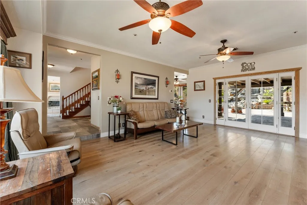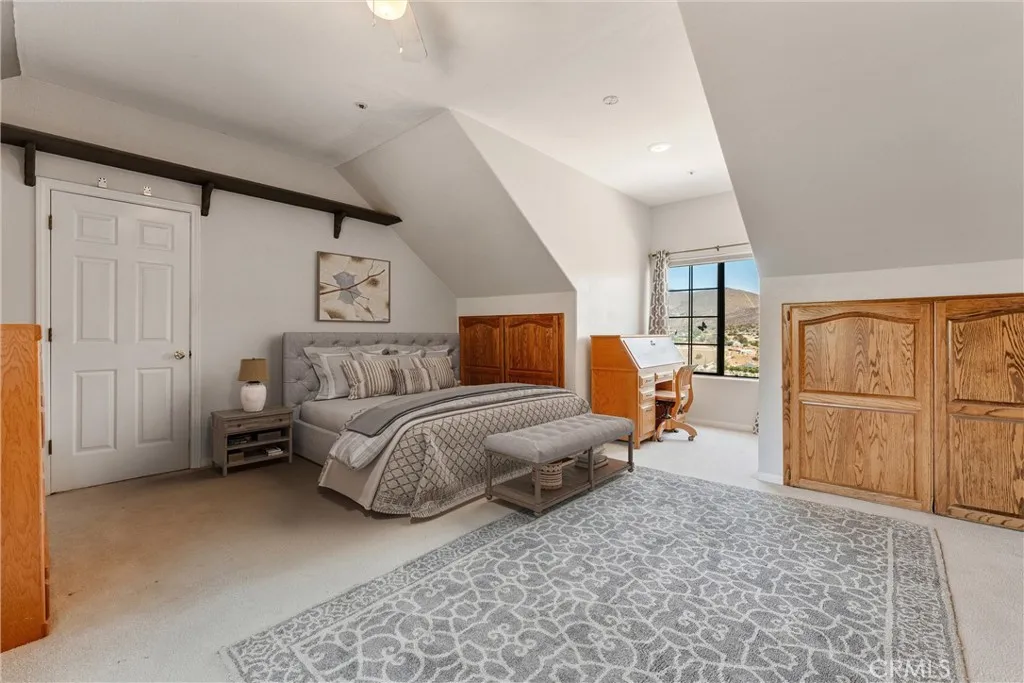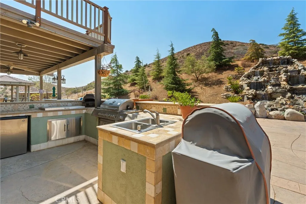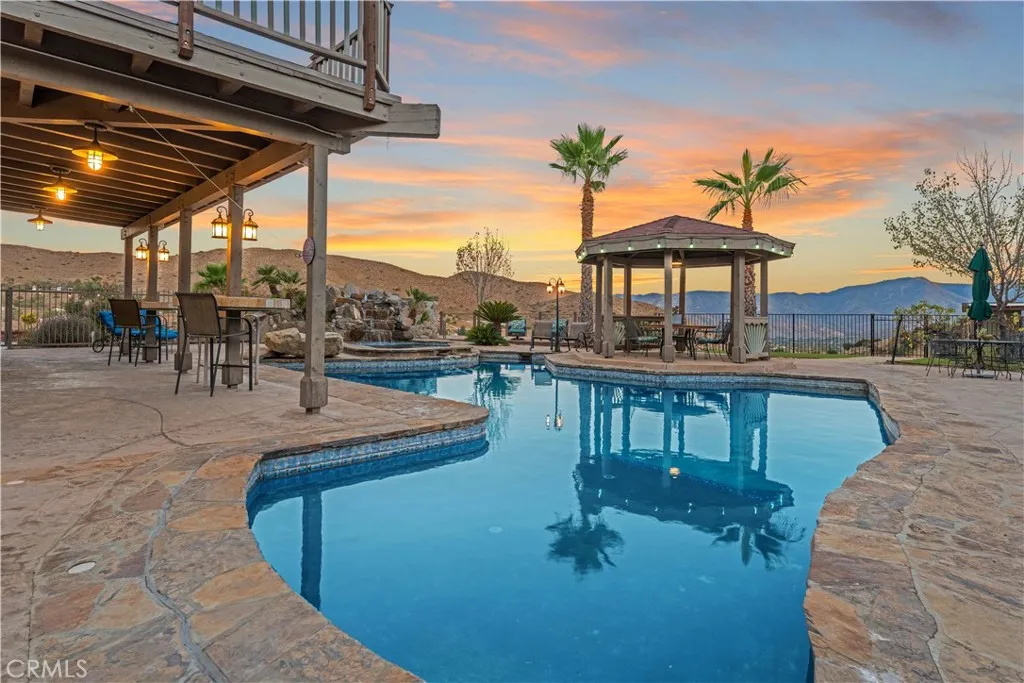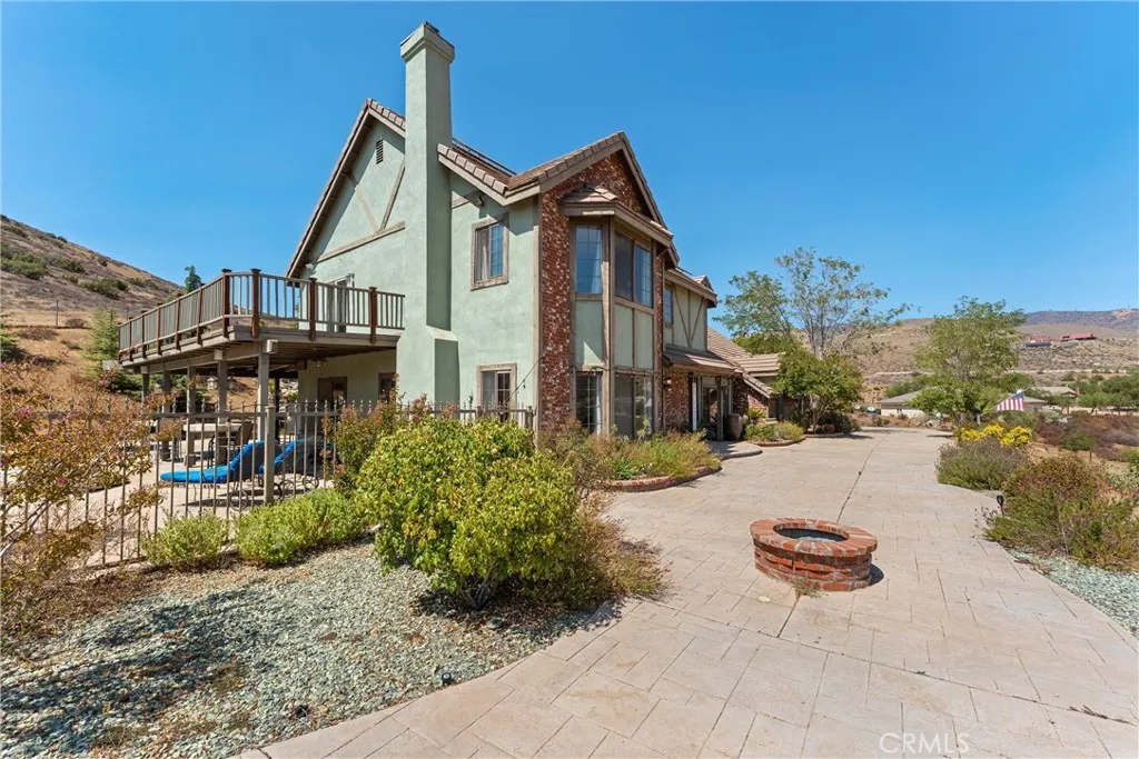 Over 5 acres of private grounds with 365 degree sweeping views of the golden California foothills. Safe and secluded, this elegant property can be your forever home, a private party location, or your equestrian estate. Located in upscale Acton, the elevated hillside terrain affords panoramic views with soft morning sunrises and stunning red sunsets. The 3194 s/f home features large picture widows and, during the day, sunbathed light in every room. With no streetlights nearby, you'll see the night sky filled with millions of stars and hear nothing but the peaceful quiet. Enjoy these breathtaking views with morning coffee or afternoon cocktails on the (12x60) deck overlooking Acton, or on the second-story wrap-around balcony! The professionally landscaped yard includes lush desert scape, mature pine trees, massive boulders, and a rock waterfall built into the hillside. These encircle a huge, finished outdoor area with heated pool, spa (seats 14 comfortable), custom built-in barbecue, and six built-in high-top tables for that elegant wedding reception, family reunion, or holiday event. The outdoor sound system and cozy fire pit will bring a warm ambience to the chilly evenings. The elegant cobblestone driveway welcomes you to the home's expansive front door and cozy wood beam and brick faade. Inside are formal and family living areas, five spacious bedrooms, four baths (large bed and full bath downstairs for guests), each of which include windows or doors that open to the magnificent views and office leads to the stunning wrap-around balcony. The newly renovated master ensuite