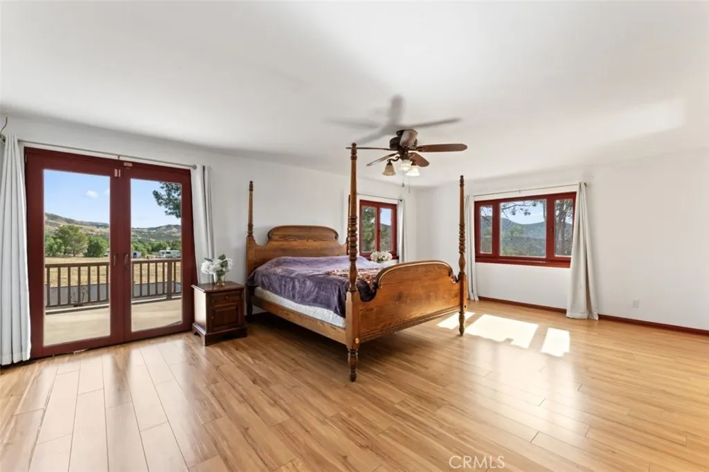 This exquisite two-story residence is situated on a flat or gently rolling 14.11 acres, encompassing two APNs: 3213-030-002 and 3213-030-029. The home boasts a generous 3,792 square feet of living space, featuring four bedrooms, two full bathrooms, and two powder rooms. Both the family room and living room are enhanced by wood-burning fireplaces. Remodeled kitchen is equipped with modern Viking appliances, including a double oven, range top, trash compactor, and a custom double sink with faucet. Custom triple-pane glass windows and doors, imported from Europe, were installed (as per the previous owner). The upper level offers balconies on three sides, providing stunning views, while the master bedroom's expansive balcony overlooks the pool, spa, and waterfall, with a private staircase granting direct access to the pool area. The rear of the house features a large wooden deck complete with a fire pit, built-in bar, making it an ideal venue for gatherings. A four-stall barn is available, which can easily serve as a workshop. The property includes RV parking, a two-car attached garage, and extra parking under a carport. For automotive enthusiasts, there is also a concrete bay on the premises. This horse property offers direct access to horse trails from the back, and one well is located on the property, all just a short distance down a dirt road, ensuring a private and tranquil setting. Paid off solar panels with 2 Tesla batteries, pool has new energy efficient pool pump recently installed. Completely covered chicken coop and duck pond behind the barn.