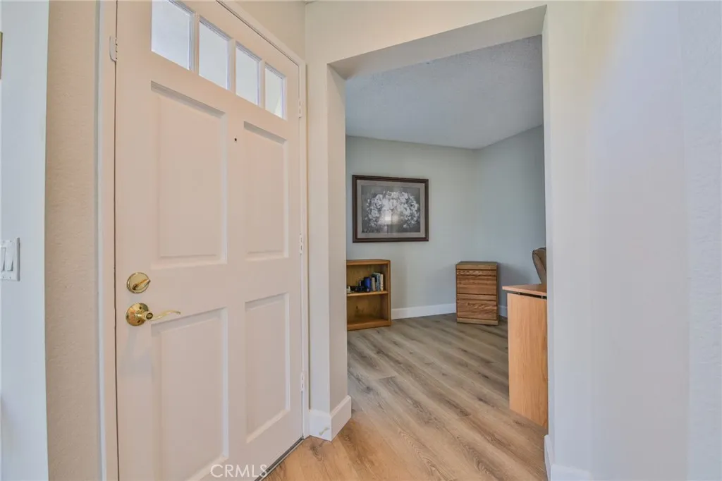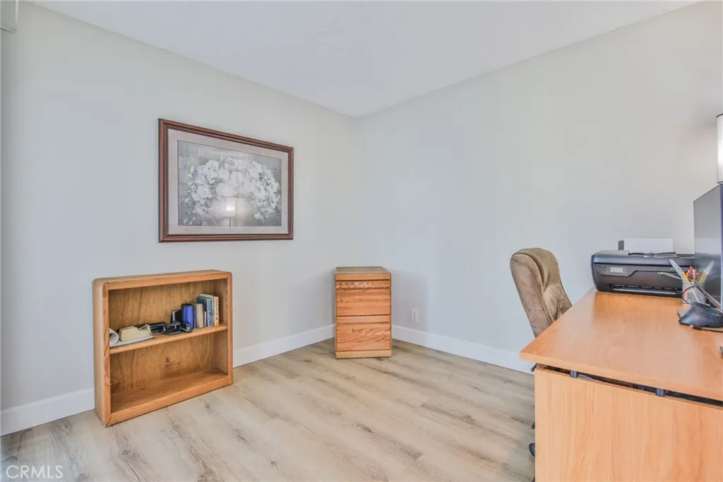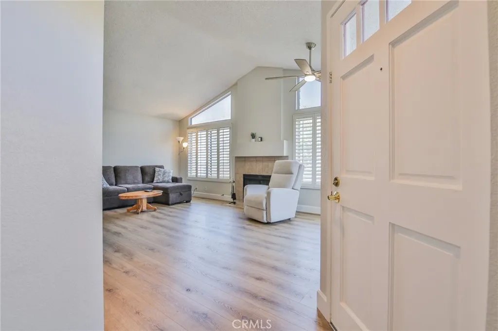 Welcome to this well-maintained upper-level corner-unit condo in the desirable Glenwood Village community of Aliso Viejo. This thoughtfully designed, diligently maintained, and beautifully updated home features 1 bedroom plus a den/officeperfect for working from home and easily convertible into a second bedroom. Recent updates include beautiful Luxury Vinyl Plank (LVP) flooring, a new AC and furnace (2020), Granite Transformations countertops in the kitchen, an updated bathroom, and new R-38 rated attic insulation with a radiant barrier and attic fan to help reduce heating and cooling costs. The unit includes its own private balcony/sitting area with private staircase access. The versatile den/office includes its own sliding door entrance. The dining area and spacious family room feature vaulted ceilings with high accent windows that bring in exceptional natural light, along with a cozy gas fireplace. The combination of soaring ceilings, tall windows, and plantation shutters creates a bright, inviting living space throughout the day. Clean LVP flooring and recessed lighting add a modern touch. The updated kitchen includes stainless steel appliances, Granite Transformations countertops, ample cabinet space, and an efficient layout. Refrigerator is included. Down the hall to the primary bedroom is a separate in-unit laundry area (washer and dryer included) and a full bathroom. The primary bedroom features vaulted ceilings, additional high windows that provide abundant natural light, and a walk-in closet. Surrounded by lush trees, green common areas, parks, and natural open sp