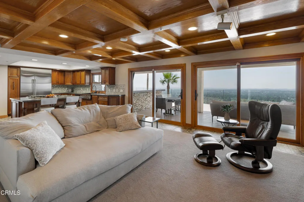 As you enter this serene enclave in the foothills of the San Gabriel Mountains, you feel the frenetic energy of the city below slip away. Impressive modern double doors open to reveal a light-filled, open floor plan and breathtaking views of the Los Angeles basin stretching all the way to Catalina Island. This entire property is designed with a seamless indoor-outdoor flow to take full advantage of those spectacular views and its privileged hilltop location in an area brimming with natural beauty, hiking trails, and wildlife. This tri-level home has been extensively remodeled. The living room and dining room feature cathedral ceilings, walls of wood-frame sliding glass doors, and hardwood floors. The tastefully designed kitchen is a chef's dream with custom cabinetry, quartz countertops, a copper sink, and premium stainless-steel appliances. An open floor plan connects the kitchen to a comfortable family room, highlighted by a coffered wood ceiling and stone fireplace. The family room opens onto a sprawling entertainer's deck, offering views that have to be experienced in person. This luxury outdoor living space boasts a motorized louvered pergola, outdoor kitchen with a built-in barbecue, refrigerator, and even a LYNX Napoli pizza oven for sunset pizza parties. A discreet elevator takes you from the main floor to the upper floor, where you'll find the gorgeous, expansive primary suite with glass doors leading to an upper deck with breathtaking views. This fully remodeled retreat includes a stunning stone fireplace and a spa-like bathroom with a vast marble shower with rain