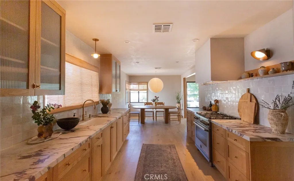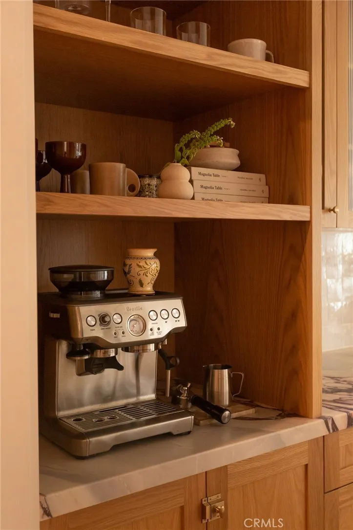 Designed to celebrate light and materiality, this home is filled with natural daylight that flows effortlessly through every space. Organic textureswarm wood, natural stone, and soft neutral tonescreate a sense of ease and timelessness. Carefully curated ambient lighting adds a gentle glow in the evenings, enhancing the homes serene and welcoming character. Living Room: An airy living space filled with natural light, accented by warm wood details and softly layered lighting for a relaxed, inviting feel. Kitchen: A beautifully curated kitchen where craftsmanship and materiality take center stage. Custom white oak cabinetry is complemented by Calacatta Viola marble slab. Italian appliances, Raw brass light fixtures, Noguchi lights, a custom hood range, and handcrafted Zia Tile backsplash elevate the space, while Roman clay walls add warmth and organic texture. A dedicated coffee station completes the kitchen with both elegance and intention. Family Room: Designed for gathering, the family room features large windows that flood the space with natural light and offer a seamless connection to the backyard. A cozy indoor gas fireplace adds warmth and comfort, making this an ideal space for both relaxing and hosting. Bathrooms: This house offers two showers, a freestanding tub provide flexibility and comfort, while custom Viola marble sinks adds sculptural elegance. Zia terrazzo flooring grounds the space, paired with Roman clay and microcement wall finishes that bring warmth, softness, and modern sophistication. Bedrooms: Each bedroom offers a comfortable layout with abundant nat