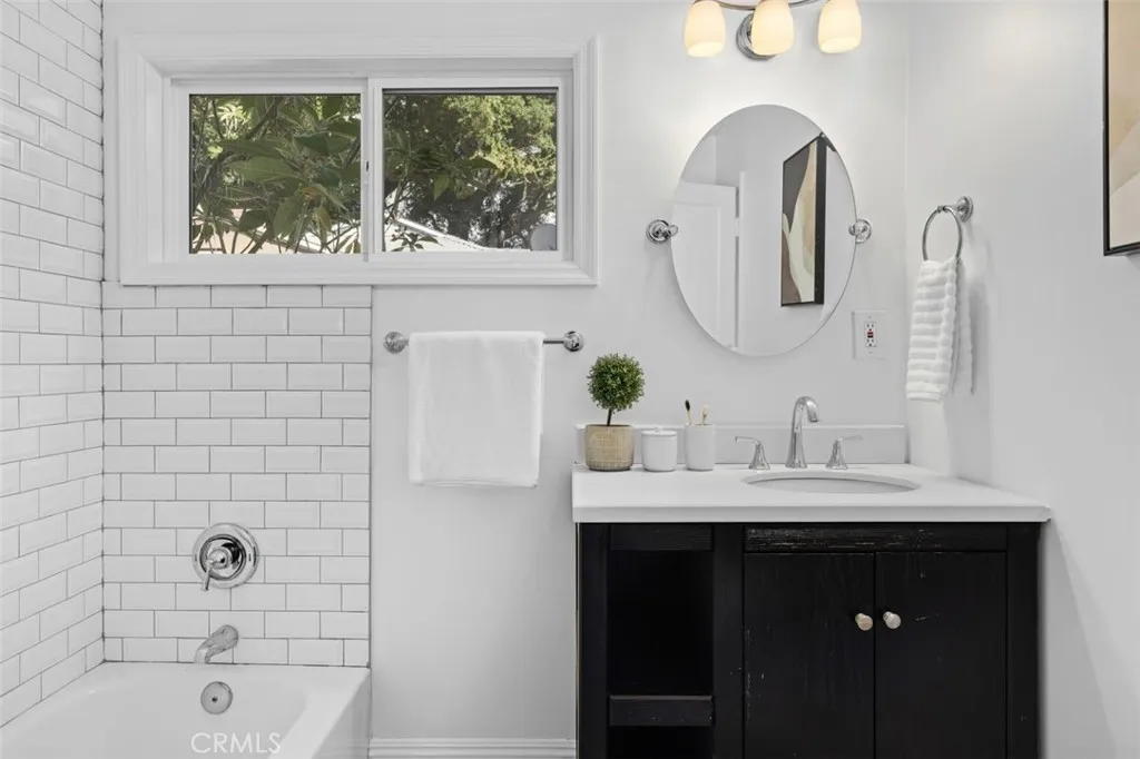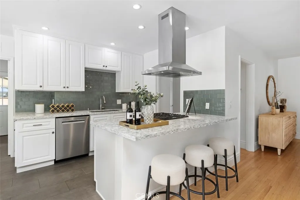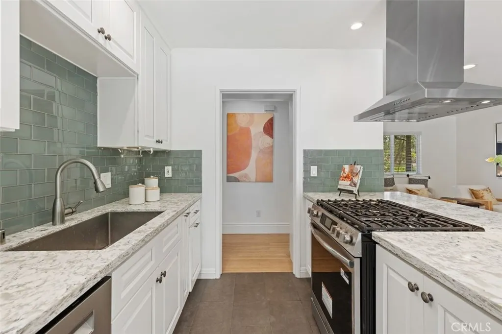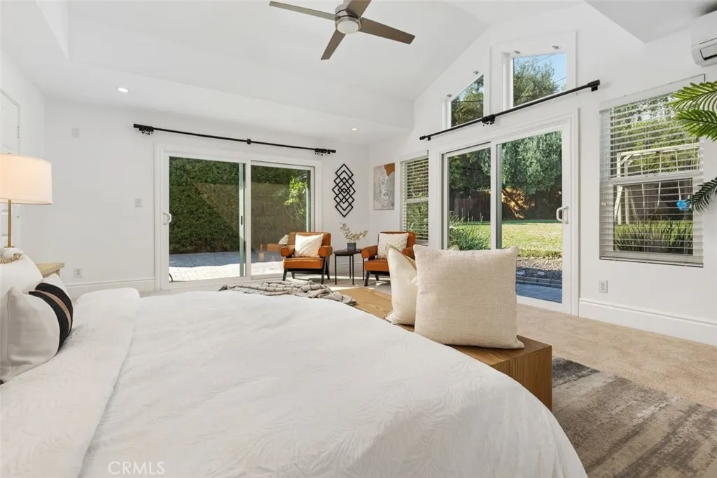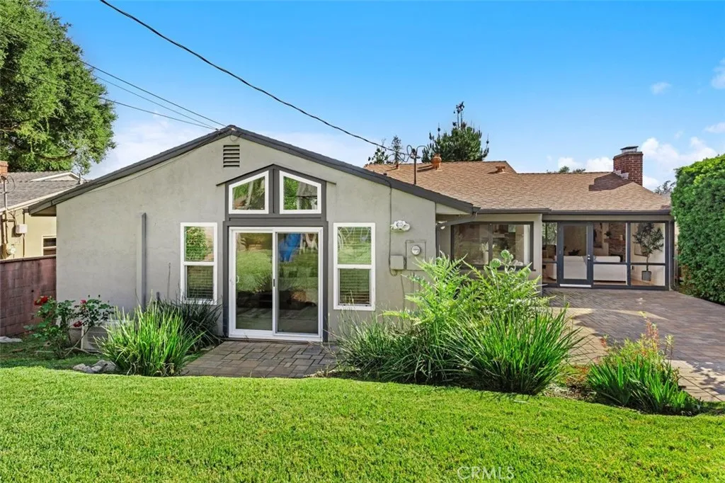 This wonderful mid-century ranch-style house, full of natural light, is perched on a large lot at the end of a quiet cul-de-sac. Step inside through the keyless entry to encounter a bright, open living area that flows seamlessly into an updated kitchen with quartz countertops and brand new, just-installed appliances. The light-filled kitchen is large enough for a dining table overlooking the lush backyard. A bonus room next to the kitchen was updated with custom white wood cabinetry and can be used as a small office and laundry room. The living area opens onto the large patio, inviting you to enjoy indoor-outdoor living. An expansive backyard offers multiple bountiful fruit trees, plus plenty of space for play or entertaining. The primary bedroom, tucked away for quiet relaxation, boasts just-installed carpeting, a vaulted ceiling, sliding glass doors, a walk in-closet, and a full bathroom. Two additional bedrooms are generously sized with ample closet space. Christmas Tree Lane is at the end of the street where you can enjoy the year-end wonder of lights strung across century-old cedar trees. This home is fully remediated and all houses on the street were untouched. Relax on the front porch swing while you enjoy life and tranquility in beautiful Altadena!