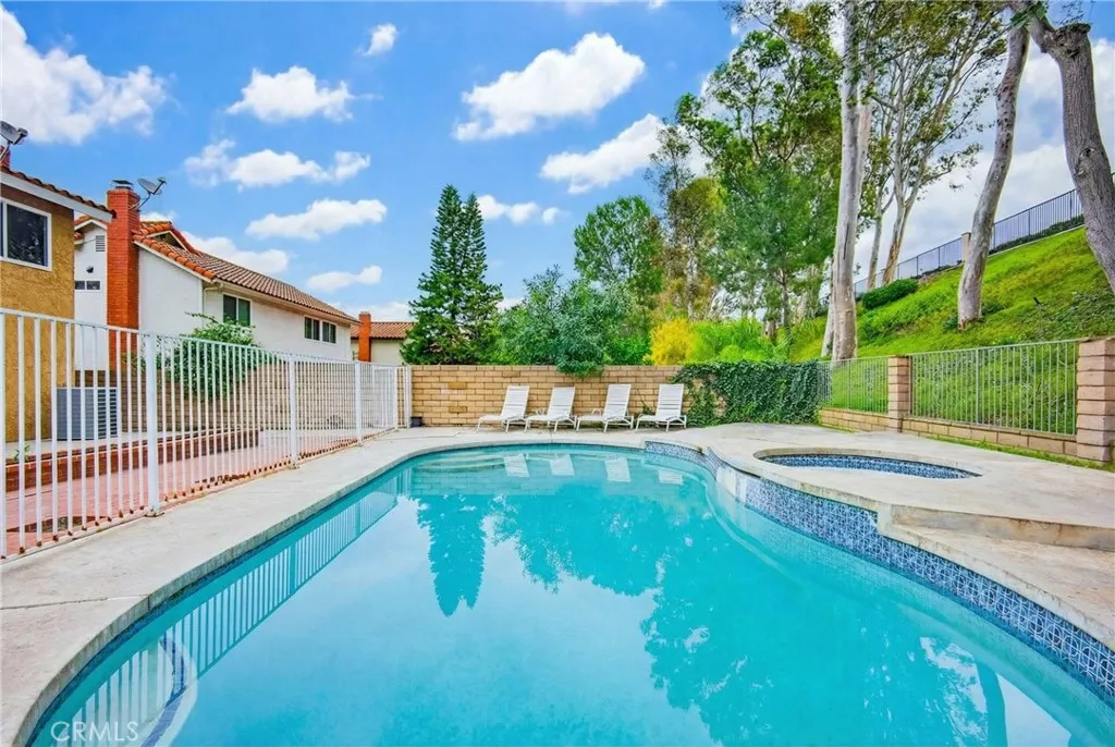 Welcome to this spacious four-bedroom, three-bath home located in the highly sought-after neighborhood of Anaheim Hills. Freshly updated with new carpet and new paint throughout, this residence offers a bright and inviting atmosphere from the moment you enter. Soaring ceilings enhance the open floor plan. The main level features a spacious living room, and a kitchen which opens nicely to the large family room perfect for entertaining. The formal dining room is currently used as a den/office. In addition, there is a downstairs bedroom with an adjacent full bathroom providing flexibility for guests or multi-generational living. Upstairs, the primary suite features an en-suite bath, large walk-in closet and abundant natural light. Two additional bedrooms share a full bath with both bedrooms having direct access to an exterior deck, perfect for enjoying morning coffee or evening breezes. The oversized backyard is an entertainers dream, featuring expansive space for gatherings along with a sparkling pool and spa. Whether hosting friends or enjoying peaceful outdoor living, this yard is ready for it all. Additional highlights include dual-pane windows and doors throughout, new pool equipment installed within the last three years, and newer major systems including the air conditioning unit and water heater. A solid opportunity for buyers seeking comfort, functionality, and peace of mind. This home is ready for its next owner to add the finishing touches and make it their own. HOA Maintains all the tall trees and lush landscaping behind fence in the backyard. Complete with an attac