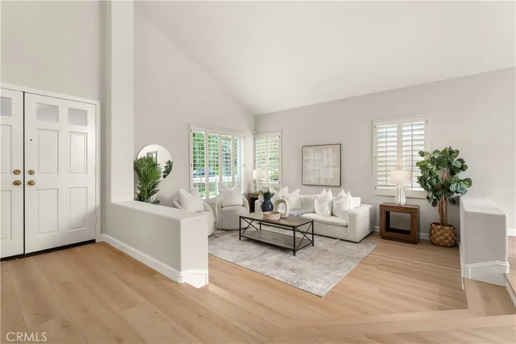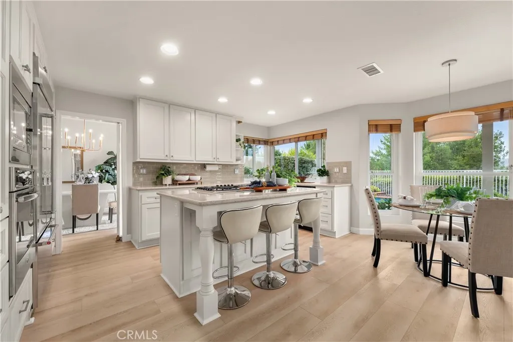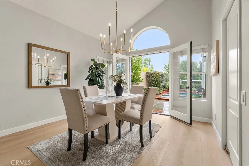 This stunning 5-bedroom, 4-bath pool home offers breathtaking city-light and mountain views across approximately 2,863 sq. ft. of beautifully upgraded living space. Enter through double doors into a grand foyer crowned by a sparkling chandelier, where luxury vinyl floors flow seamlessly throughout the main level. To the left, a formal living room with soaring cathedral ceilings and plantation shutters sets a dramatic tone, while the adjacent formal dining room features a striking chandelier and French doors that open to the backyard oasis with pool, spa, and panoramic views. The remodeled chefs kitchen impresses with an expansive center island featuring a 5-burner range and breakfast bar, antique-style soft-close cabinetry, granite countertops, stainless steel appliances including a built-in KitchenAid refrigerator, and a sunny breakfast nook framed by newer windows that capture the scenery. The inviting family room boasts a warm fireplace, built-in cabinetry, and French doors leading to the patioperfect for entertaining. A main-floor bedroom with custom closet shelving and an adjacent remodeled bath with quartz countertops provides convenience for guests or multigenerational living. A stylish laundry room with sink completes the first level. Upstairs, the luxurious primary suite features double-door entry, a cozy fireplace, new carpet, newer windows, and a private deck showcasing sweeping mountain and city-light views. The spa-inspired primary bath includes a Jacuzzi tub, separate shower, and updated finishes. Three additional bedrooms complete the upper levelone with an