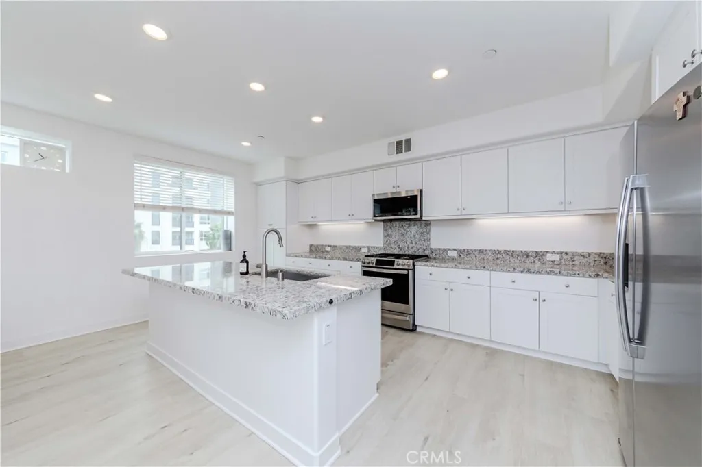 Experience upscale comfort in this elegantly crafted 3-bedroom, 2-bath home, perfectly situated just minutes from Disneyland and Angel Stadium. This spacious 1,691 sq. ft. residence features an open and inviting floor plan on the second floor of a secure, gated community with elevator access. As a quiet end unit, it offers peaceful views and abundant natural light throughout. The entire home has been upgraded with beautiful synthetic hardwood flooring installed just two years ago, adding warmth and modern appeal. Enjoy the convenience of a private 2-car garage and the tranquility of a prime location that blends accessibility with a serene atmosphere.