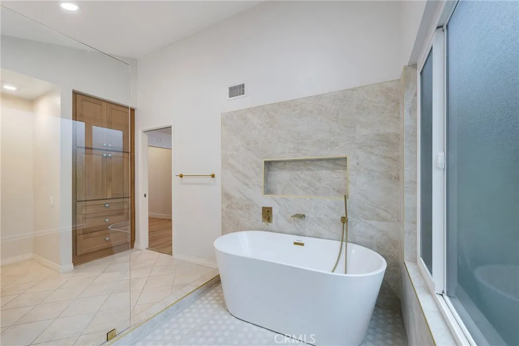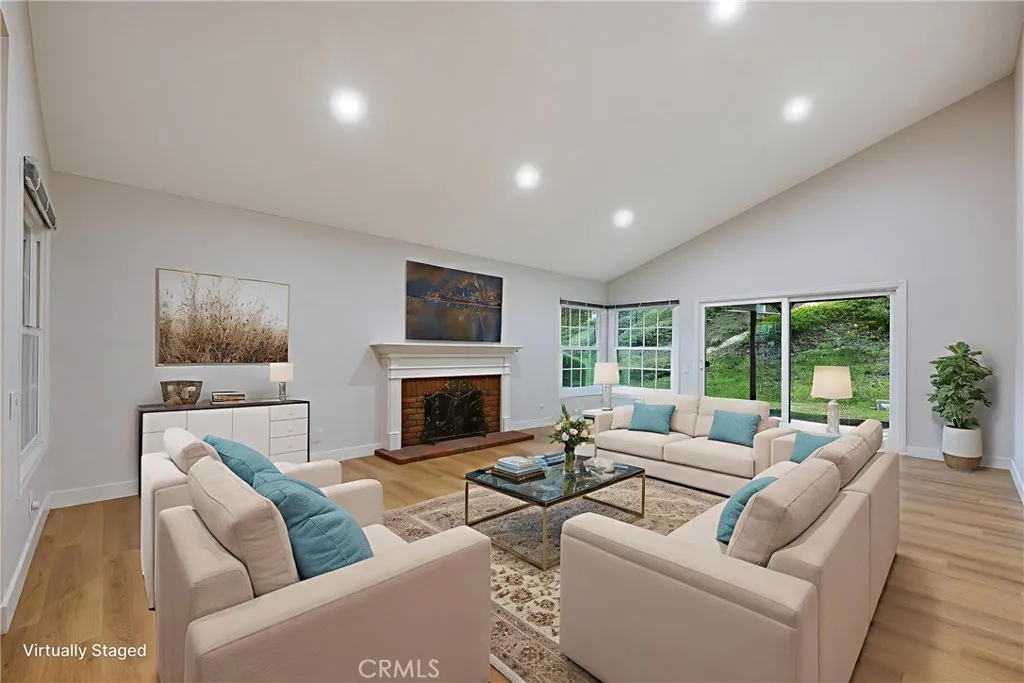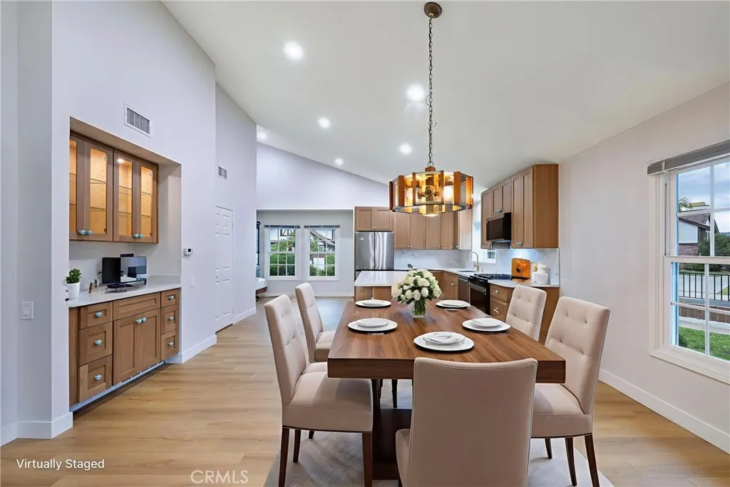 Beautifully updated and thoughtfully redesigned, this Anaheim Hills home offers more than $100,000 in recent improvements and a fresh, open feel throughout. The kitchen is the centerpiece of the renovation, where the original low ceiling was raised to a vaulted design, giving the space a bright, airy atmosphere that immediately transforms the heart of the home. The wall between the kitchen and dining room was removed as part of a well-planned interior update that expands the kitchens footprint and creates an easy, open connection between the main living areas. Just off the dining area, a charming atrium brings natural light into the home and creates a peaceful spot for morning coffee, plants, or outdoor relaxation. The remodeled kitchen features new custom cabinetry, striking gold-vein quartz countertops, updated fixtures, and an enlarged layout ideal for cooking, gathering, and entertaining. New wide-plank flooring, soft neutral paint, updated lighting, and refreshed finishes throughout contribute to the homes warm, cohesive style. The primary suite has been reimagined into a comfortable retreat with a beautifully upgraded bath that includes a custom double vanity, a walk-in shower with updated tile, a freestanding soaking tub, a private water closet, and a calm, spa-inspired atmosphere. The secondary bathroom has also been refreshed with a new wood vanity, gold-vein quartz countertop, and updated light fixture, providing a clean and inviting space that complements the homes overall design. Additional improvements include improved interior flow, enhanced sightlines between