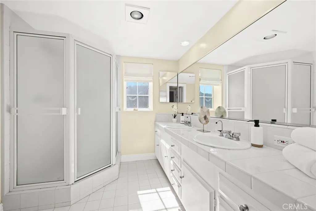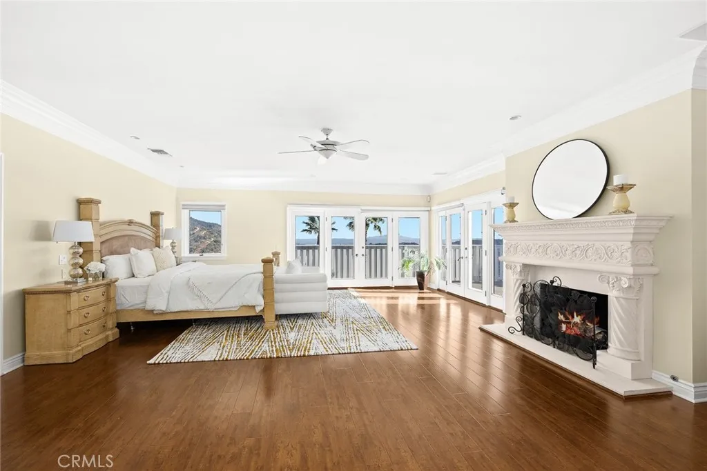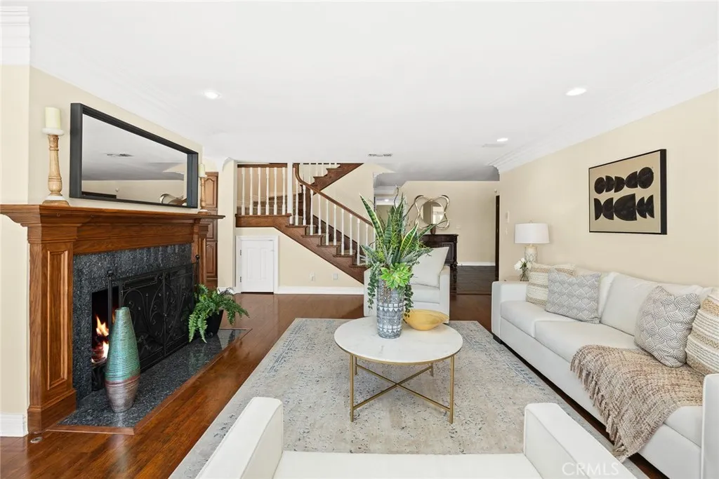 This spectacular view home, nestled in Arcadia's highly desirable Highland Oaks neighborhood, is part of the prestigious Arcadia School District and exemplifies Southern California living with expansive panoramic views of the gardens, mountains and city lights. Situated on a hilltop, this beautifully updated estate offers the perfect combination of serenity, breathtaking views and privacy. As you approach the home you're welcomed by a meticulously landscaped front yard and a paved circular driveway leading to an elegant entry. The artistry of marble inlay flooring graces the entry and living room, which seamlessly integrates indoor and outdoor spaces through walls of glass windows framing the stunning landscapes. The bright family room, with views of the pool and canyon, opens onto a large outdoor patio, perfect for entertaining. Anchored by two gas fireplaces, one in the living room and another in the family room, this home exudes warmth and comfort. The formal dining room and breakfast room, both featuring walls of glass, continue showcasing gorgeous scenic canyon views. Additional features include a large recreation room and beautiful wood floors throughout the living areas, enhancing the home's natural charm. Originally built in 1959 then rebuilt in 1991, this expansive 6,103 sq. ft. estate offers 8 bedrooms, 7.5 bathrooms, with 5 en-suite bedrooms upstairs and 1 en-suite downstairs. The primary suite elevates luxury with a fireplace, direct access to a sun-deck patio, two large walk-in closets, and a spa-like bathroom with a soaking tub offering incredible canyon views