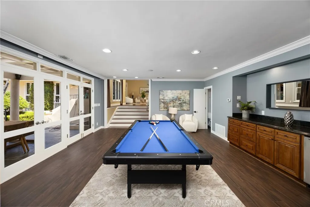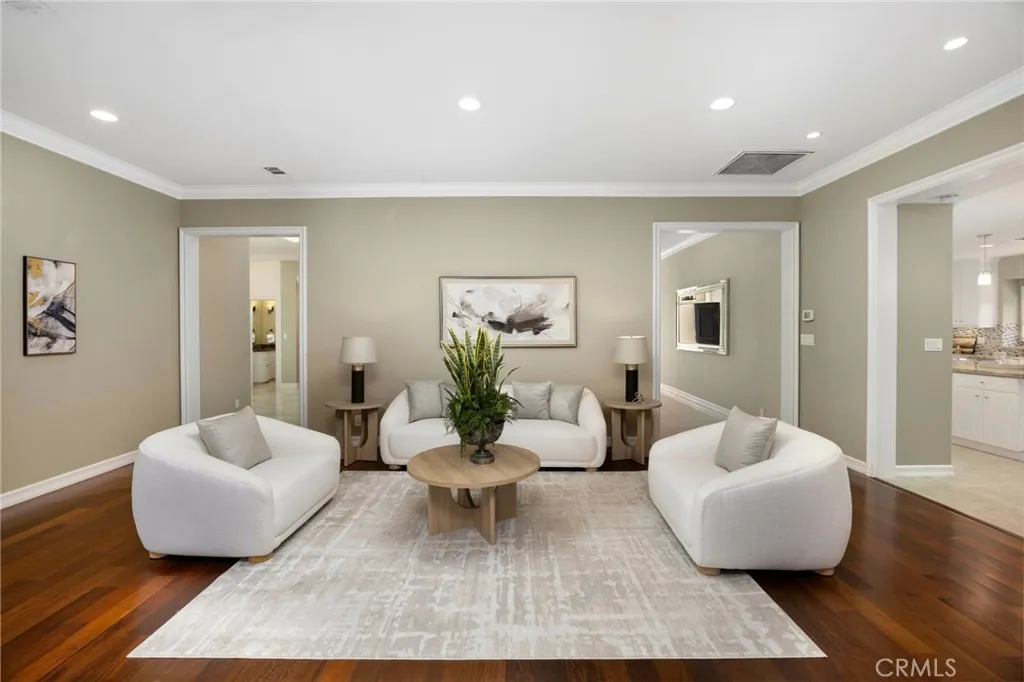 Situated in Arcadia's prestigious Upper Rancho neighborhood, this spectacular estate-property is located on one of Arcadia's most coveted streets, Singing Wood Drive. The sprawling 6,336 sq ft floorplan is primarily on a single level w/ 6 bedrooms (all suites) + an office and 8 total bathrooms. Upon arrival, you will be greeted by lushly landscaped grounds and mountain views. As you enter into this remodeled home with upgrades galore, there is a formal living room with high ceilings, recessed lights, wood floors, a cozy fireplace, and picture windows. Across the hallway is the large formal dining room, which leads to the gourmet kitchen w/ breakfast nook. The open-concept kitchen, which opens to the family room, features a large center island, built-in gas range, oven, microwave, 2 dishwashers and refrigerator, along with abundant cabinetry. This home is truly an entertainer's dream with both the family room and adjacent entertainment room opening to the backyard & patio. The entertainment room has a wet bar, along with a powder room. The main-level of the home also features a spacious office w/ built-in cabinetry. Down the main hallway are 3 bedrooms, including the spacious primary suite w/ retreat area. The primary suite has 2 walk-in closets, including one with extensive built-in cabinetry, a large retreat/sitting area w/ a cozy fireplace, French doors leading to a private patio area, and a large ensuite bathroom with dual sinks, and separate tub & shower. Off of the kitchen, there is a laundry/utility room w/ laundry hookups and guest quarters with a separate entrance o