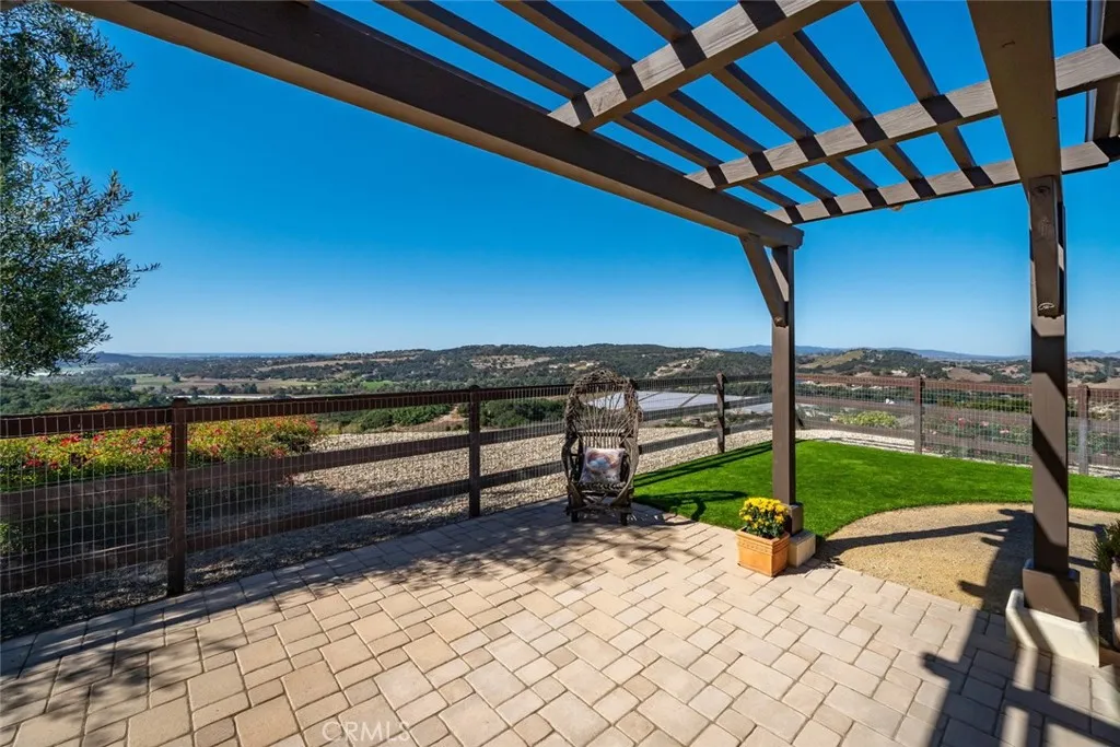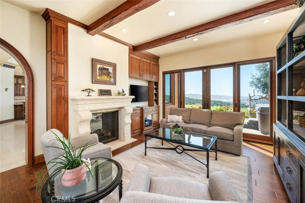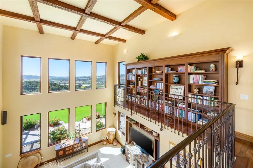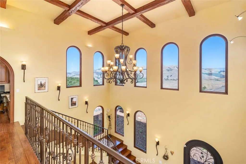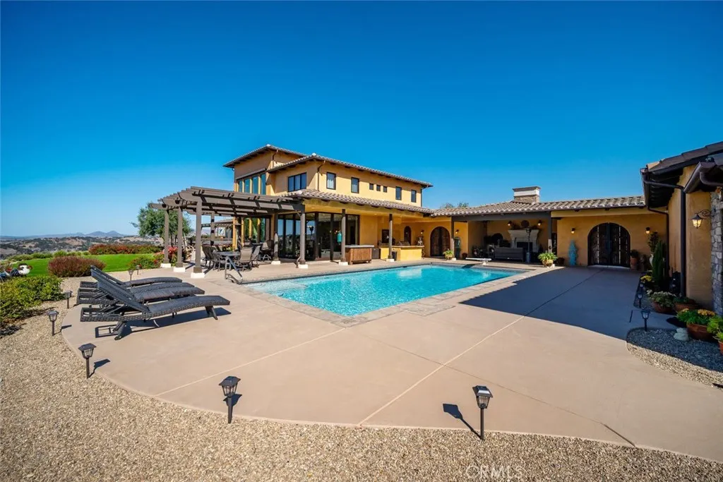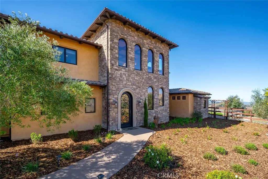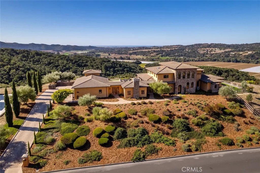 Mediterranean Ridge-Top Retreat with Breathtaking Views and Unmatched Privacy | Perched atop a scenic ridgeline, this stunning Mediterranean estate offers sweeping ocean, mountain, and valley views from nearly every room. Located in the gated, Certified Fire-Wise enclave of Las Ventanas and surrounded by over 4,000 acres of protected open space, the home combines the serenity of nature with the convenience of being just six miles from town. Spanning 4,085 square feet, this energy-efficient residence features 5 bedrooms, 4.5 bathrooms, and a detached 302 sq. ft. guest casita, perfect for hosting or quiet retreat. Sustainability meets luxury with two owned solar arrayscovering 95% of the homes energy needsincluding heating for the Pebble Tec pool, complete with a diving board, hydraulic safety cover, and solar heat. Step inside to soaring 25-foot ceilings, exposed wood beams, and a dramatic two-story wall of windows that flood the great roomwith natural light and frame picture-perfect views. Radiant-heated limestone floorsand custom wrought-iron accentsenhance the architectural richness throughout. The main-level primary suiteis a sanctuary all its own, featuring a cozy fireplace, private patio, and immediate access to a Bullfrog spafor stargazing soaks. A connected sitting room provides flexibility as a private office or lounge space. At the heart of the home is the chefs kitchen, outfitted with cherry cabinetry, striking Mascarello granite, a dedicated prep island, top-tier appliances, and a walk-in pantry. It flows effortlessly into a spacious dining area, where dual slidi