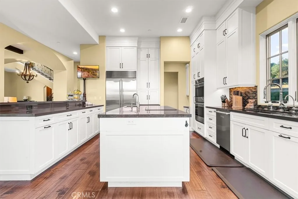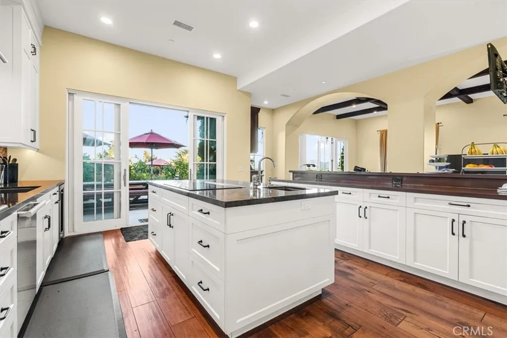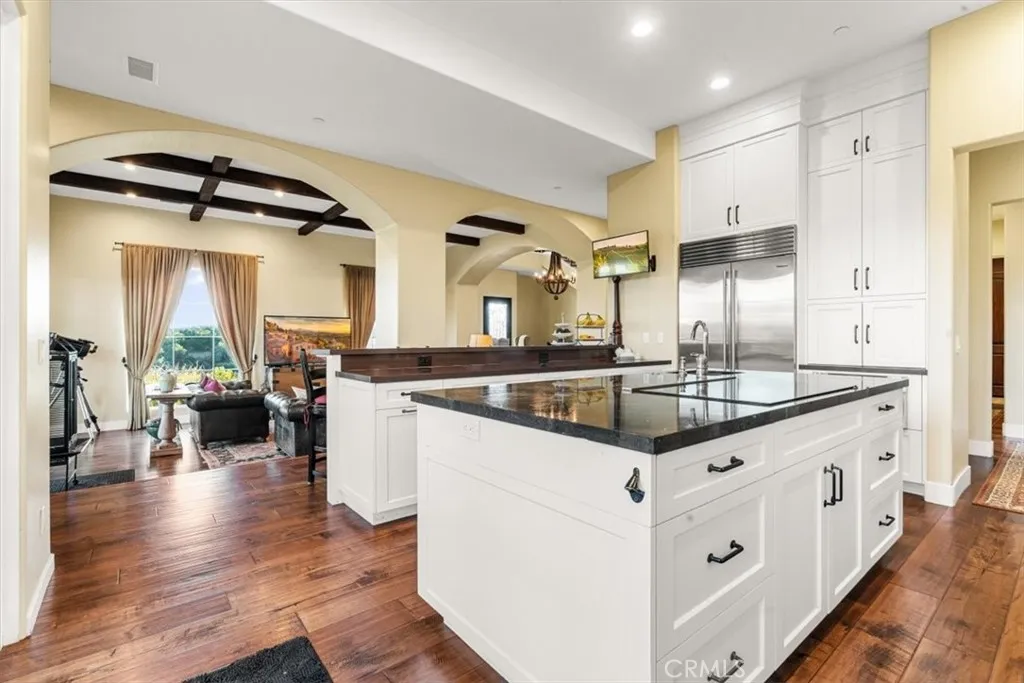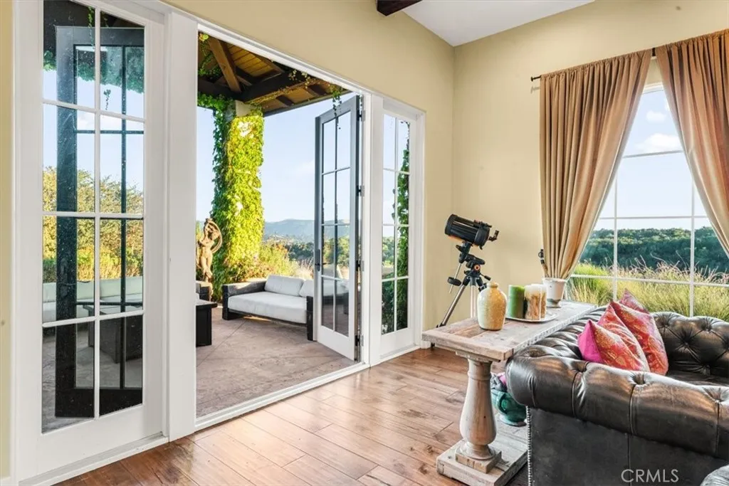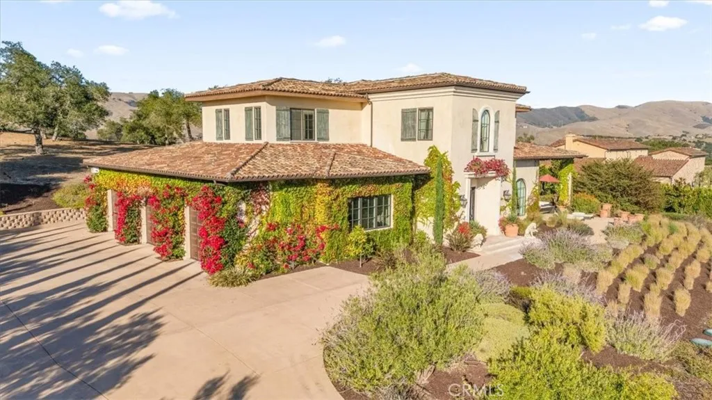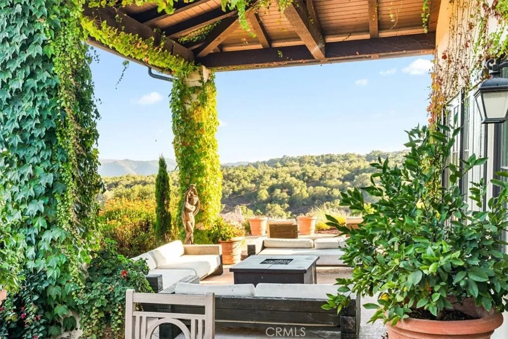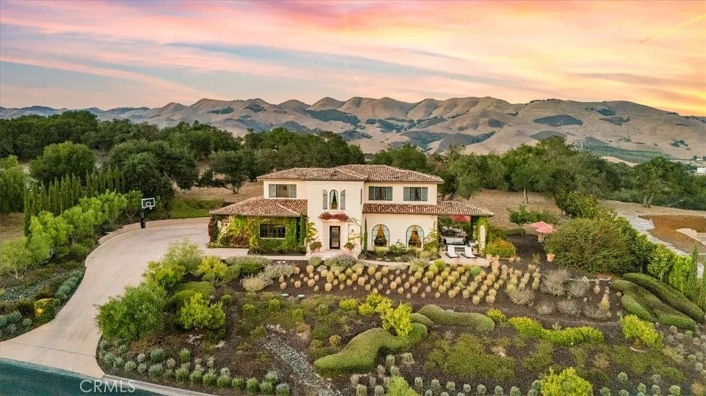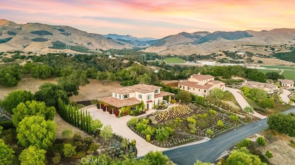 Set near the crest of the prestigious, gated community of Monte Sereno Estates, this refined custom residence showcases sweeping, unobstructed views of the rolling hills and valleys. Completed in 2015, the home was designed to embrace both everyday comfort and effortless entertaining, with seamless indoor-outdoor living at its heart. Step inside the impressive foyer, where soaring two-story ceilings set the tone for the light-filled, open floor plan. Expansive windows and cathedral ceilings invite natural light throughout, highlighting timeless architectural details like arched passageways, wrought iron accents, exposed wood beams, and rich wood floors. The gourmet kitchen is a centerpiece, featuring abundant custom cabinetry, extensive granite counters, high-end appliances by SubZero, Wolf, and Miele, plus a spacious pantry designed for the modern chef. The kitchen and living spaces flow to a vast outdoor space with covered patio, perfectly oriented for lounging or entertaining against a backdrop of breathtaking vistas. Four spacious bedrooms, each with its own en-suite bath, provide comfort and privacy, while a dedicated office offers flexibility for work or study. The primary suite is a true retreat, complete with a spa-inspired bath featuring dual vanities, a large walk-in shower, and a clawfoot soaking tub with views of open space. Sitting on 1.4 usable acres, the property is enhanced by Magnolias and Ficus trees for added privacy, complemented by vibrant bougainvillea and mature olive trees. Additional features include a newer AC unit, all solid-core doors, and an ove