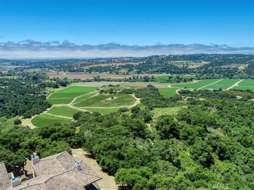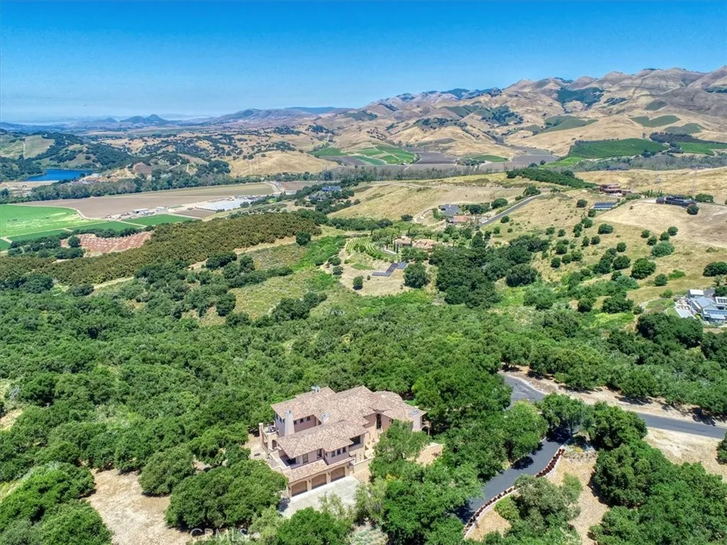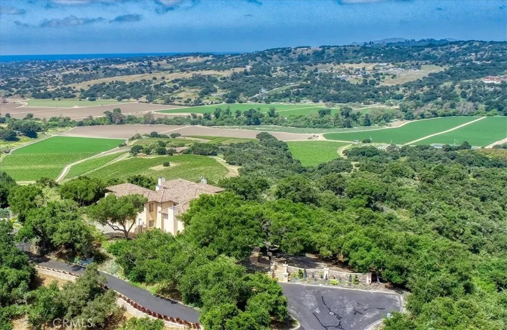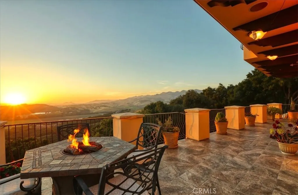 Enjoy the elegance and serenity of this magnificent Tuscan inspired villa that creates a sophisticated yet relaxing atmosphere. Absolutely incredible panoramic views stretch to the Pacific Ocean, the Edna Valley and beyond to the peaks of San Luis Obispo. Entering the home, you will find a welcoming foyer with elevated beam ceiling and beautiful custom wood and iron staircase. The versatile and thoughtfully designed floorplan includes elegant engineered wood flooring throughout the main level and natural wood beamed ceilings. Five fireplaces throughout create an intimate atmosphere. Numerous JeldWen windows provide abundant natural light and outdoor views. On the main level a gourmet kitchen features beautiful natural wood cabinetry with convenient sliding pull out drawers in each cabinet, a Wolf cooktop with custom hand-crafted vent hood, built-in refrigerator, wine fridge, spacious granite counters, and more. The adjoining great room with wood burning fireplace offers access from both sides to outdoor spaces making it ideal for entertaining. On one side, picturesque vistas of the valley, vineyards and ocean await you from the view deck that is over 50 in length. While on the other side is a protected courtyard with its own fireplace creating a relaxed ambiance to enjoy more views and sunsets. In addition to these amazing outdoor spaces is another courtyard at the southside of the residence that is a perfect place for morning coffee or breakfast as the sun rises above the oak trees. The owners suite with its elevated ceiling, fireplace and view deck is a tranquil place to