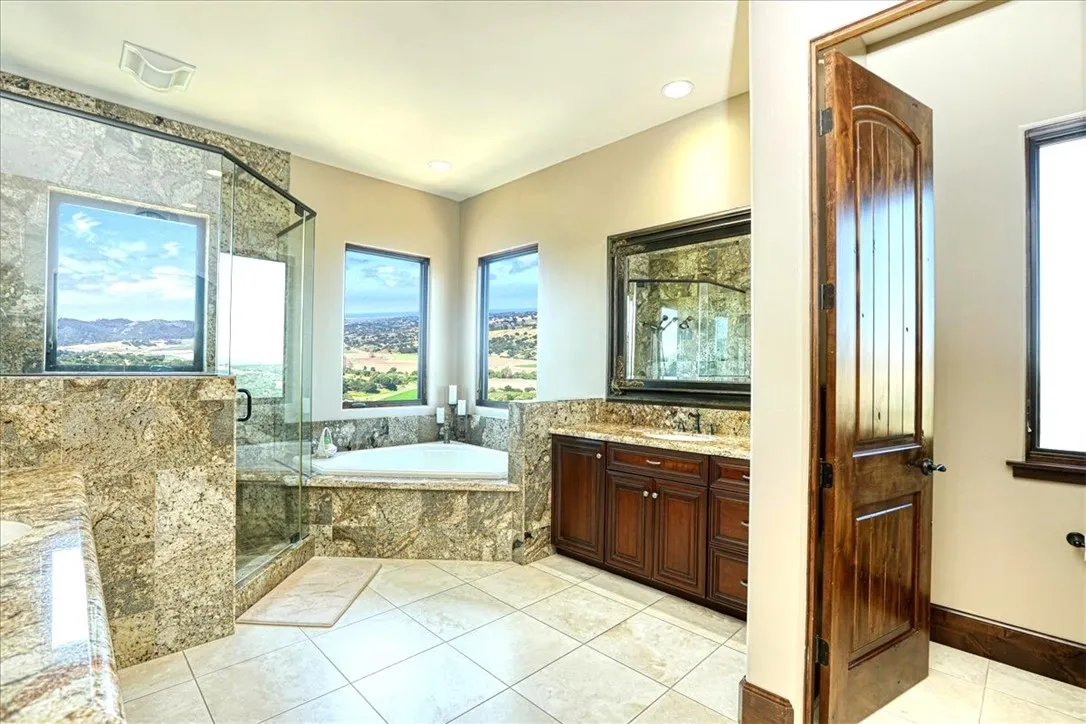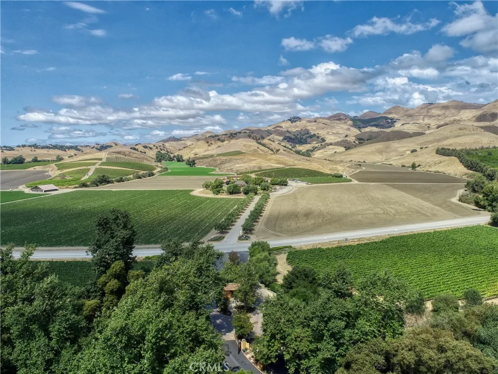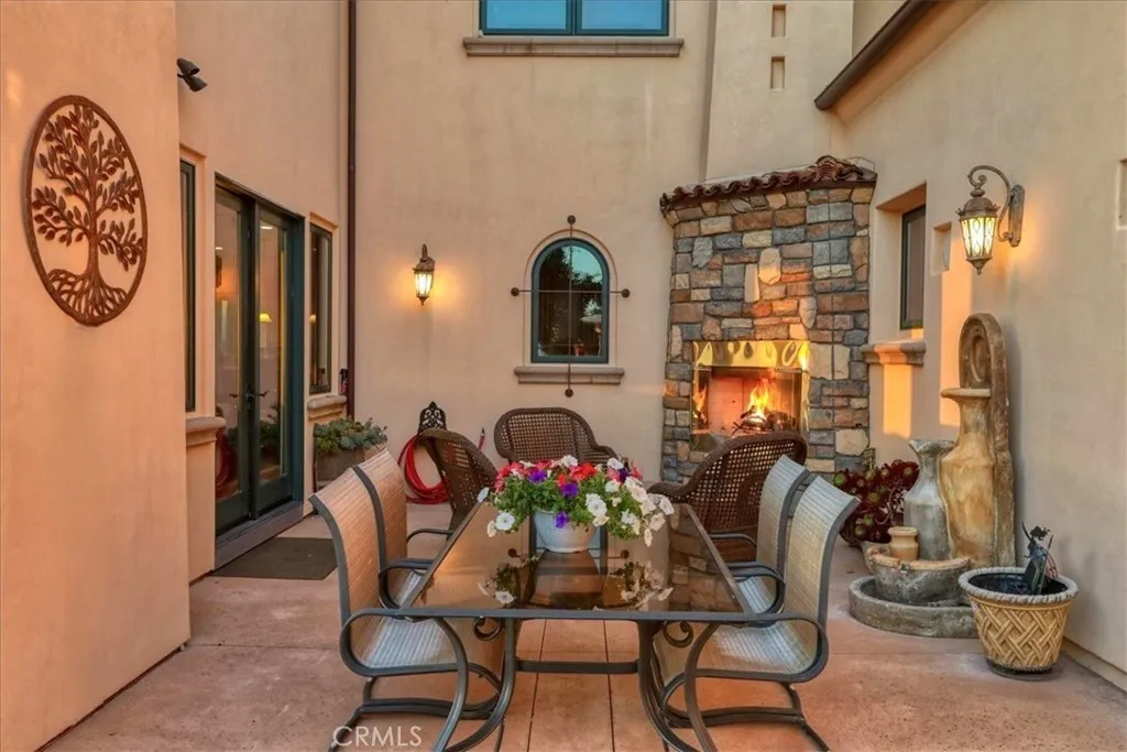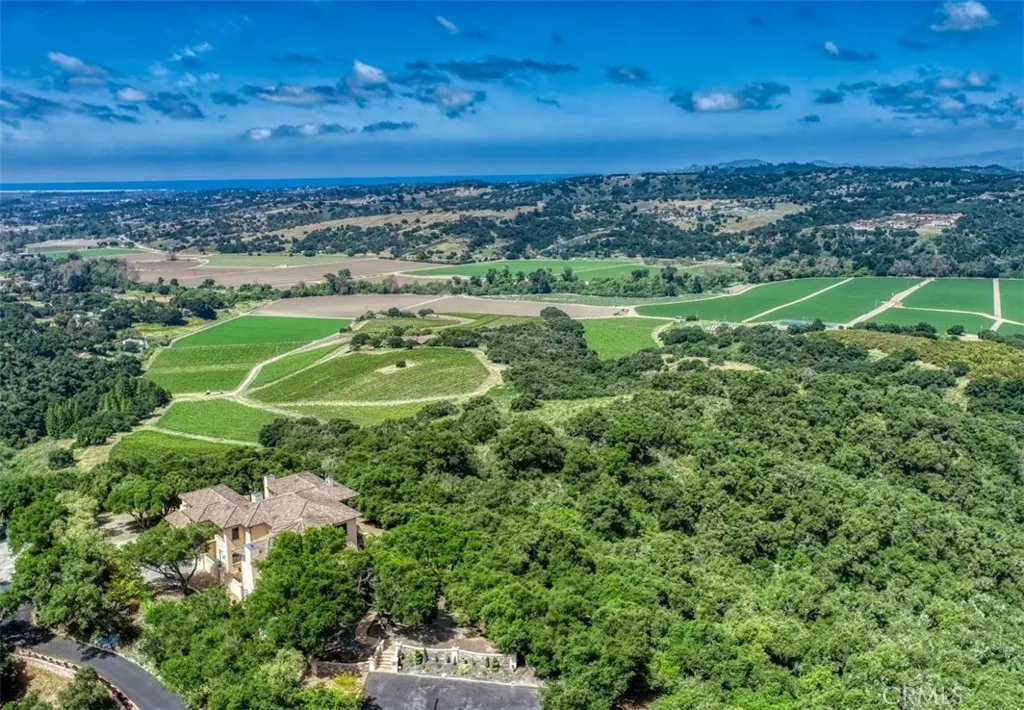 Perched to capture sweeping coastal and valley vistas, this magnificent Tuscan-inspired villa creates a sophisticated yet relaxing atmosphere. Absolutely incredible panoramic views extend to the Pacific Ocean, the Edna Valley, and beyond to the peaks of San Luis Obispo. A welcoming foyer features an elevated beamed ceiling and a beautiful custom wood and iron staircase. The thoughtfully designed floor plan offers elegant engineered wood flooring throughout the main level, complemented by natural wood-beamed ceilings. Five fireplaces throughout the home create a warm and intimate ambiance, while numerous Jeld-Wen windows provide abundant natural light and showcase the surrounding views. The main level includes a gourmet kitchen featuring custom cabinetry with sliding pull-out drawers, a Wolf cooktop with hand-crafted vent hood, built-in refrigerator, wine fridge, spacious granite countertops, and walk-in pantry. The adjoining great room with a wood-burning fireplace offers access on both sides to outdoor living spaces, making it ideal for entertaining. One side opens to a view deck over 50 feet in length, where picturesque vistas of the valley, vineyards, and ocean await. The opposite side leads to a protected courtyard with its own fireplace, creating a relaxed setting to enjoy sunsets and sweeping views. An additional south-facing courtyard is the perfect spot for morning coffee or breakfast as the sun rises above the oak trees. The owners suite is a tranquil retreat featuring an elevated ceiling, fireplace, and private view deck. The en-suite bathroom includes a separate