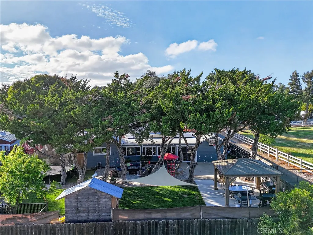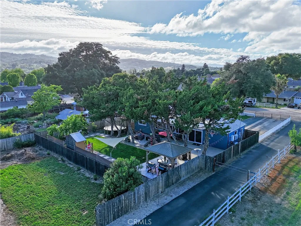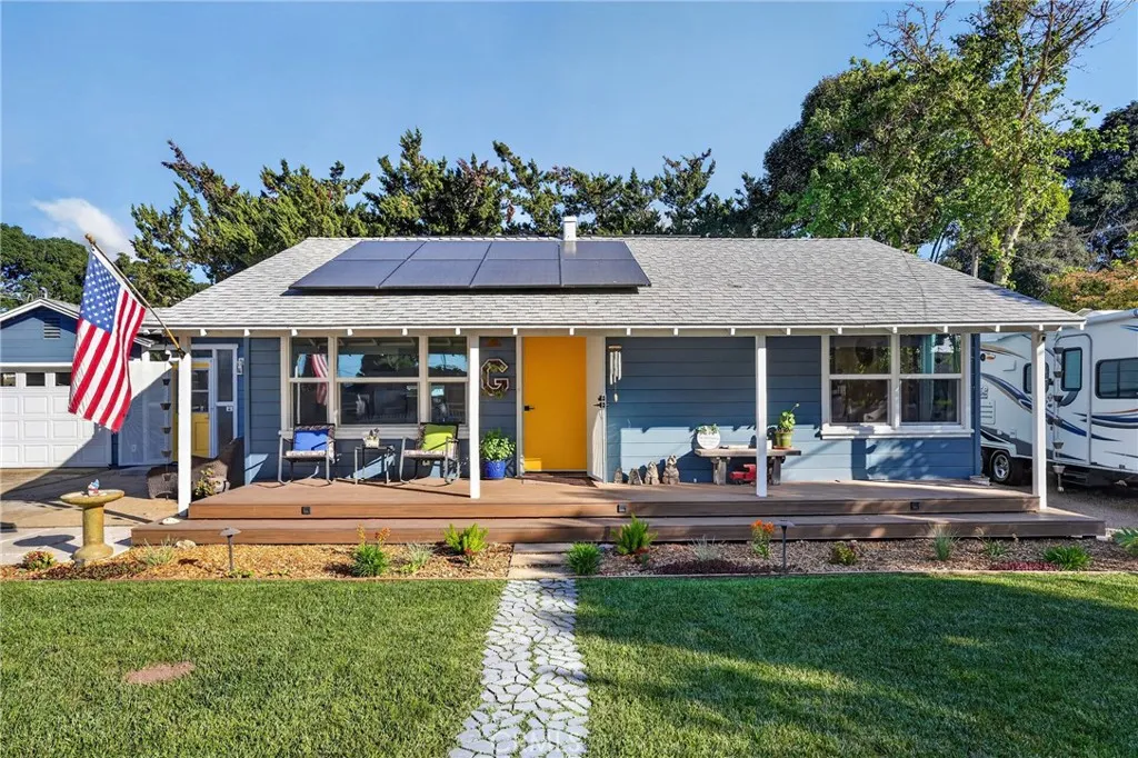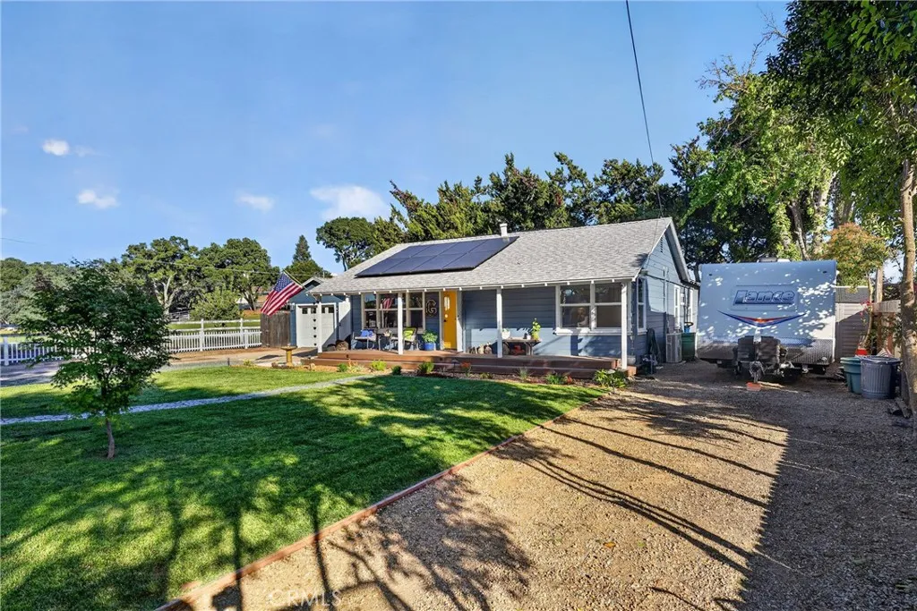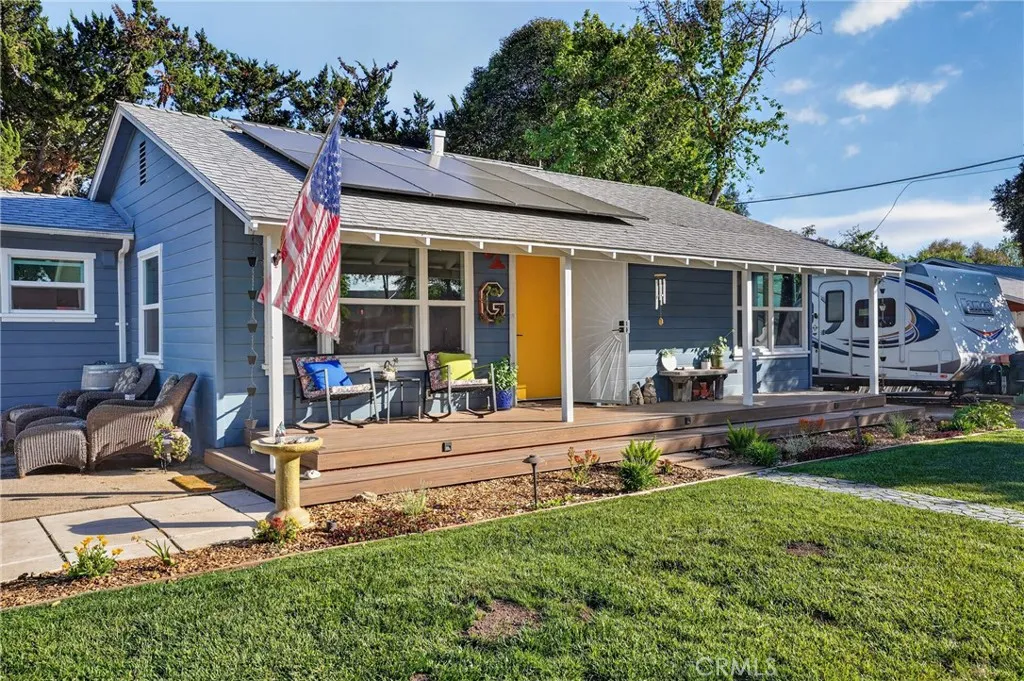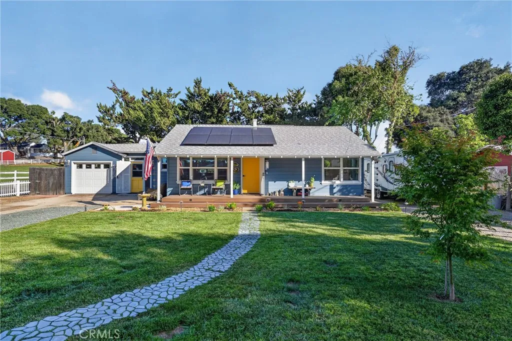 Style, comfort, and thoughtful upgrades come together at 5303 Carrizo Road in Atascadero, just minutes from town, Trader Joes, and convenient 101 access. A cobblestone pathway leads to the front door, where a charming composite porch, sprawling lawn, and gated entry with automatic gate create a welcoming first impression. The property is level and offers abundant parking, including RV parking with full hookups. Inside, the home features a warm and inviting layout with real hardwood flooring, updated lighting, and well-designed living spaces. The living room showcases stylish tile flooring, ceiling fans, and a wall of windows with sliders opening to the backyard for seamless indoor-outdoor flow. The kitchen has been tastefully updated with quartz countertops, shaker cabinetry, stainless steel appliances, a 5-burner stove, tile backsplash, and open shelving, all opening to the main living area. The dining space features updated lighting, while the hall bathroom has been renovated with solid surface counters, shaker cabinetry, and a tub/shower combination. Two guest bedrooms offer hardwood flooring and ceiling fans. The primary suite is a comfortable retreat with vaulted ceilings, ceiling fan, views of the backyard, and an updated en suite featuring custom tile, glass shower, quartz countertops, shaker cabinetry, and a private toilet area. The backyard is designed for both everyday enjoyment and entertaining, featuring a covered concrete patio with gazebo, additional paver patio, and caf lighting. Mature trees and a variety of fruit trees, including orange, avocado, apple, lem