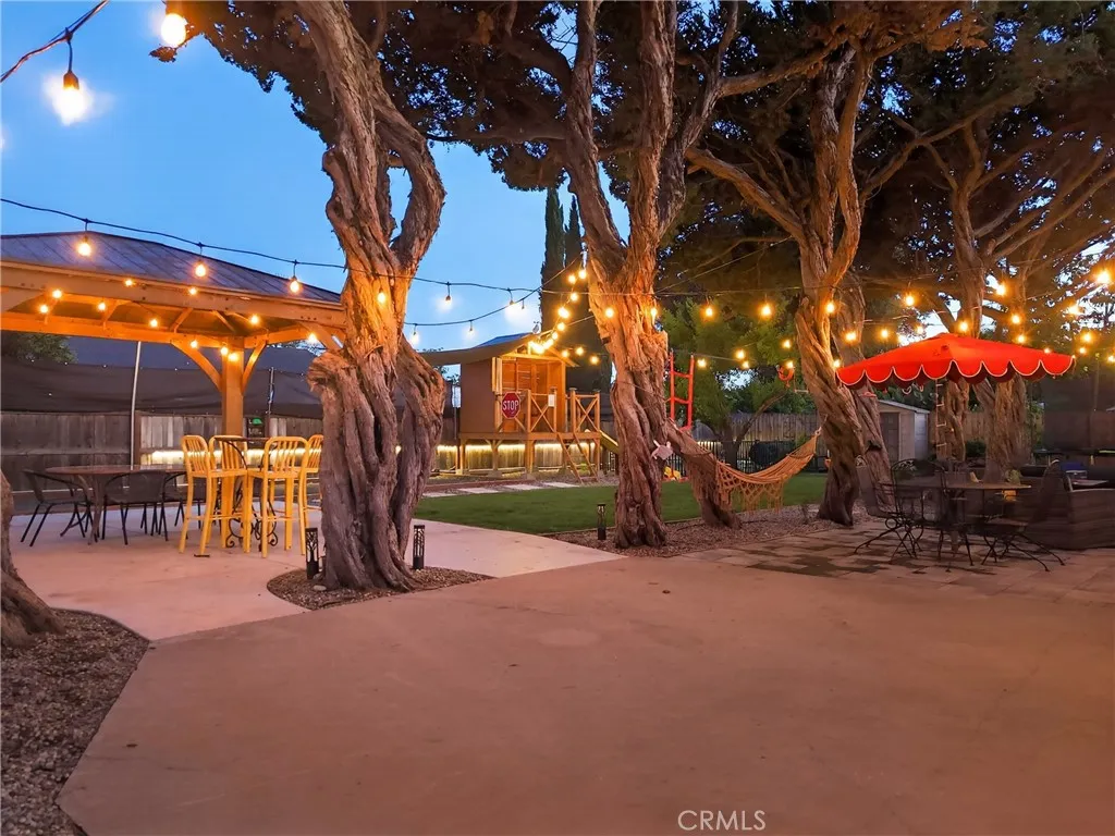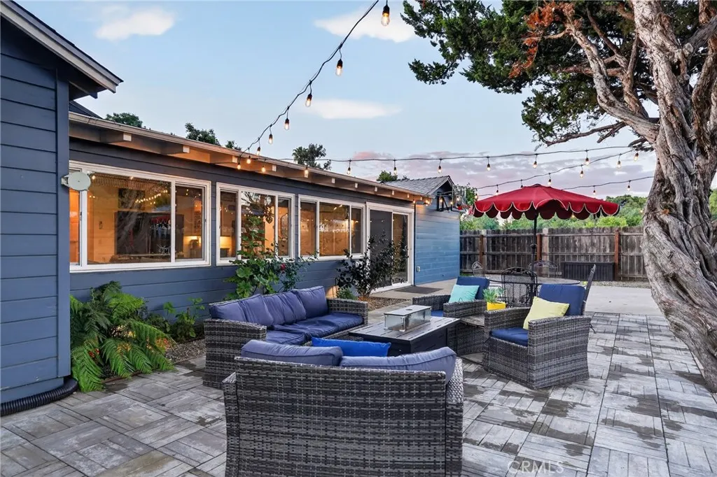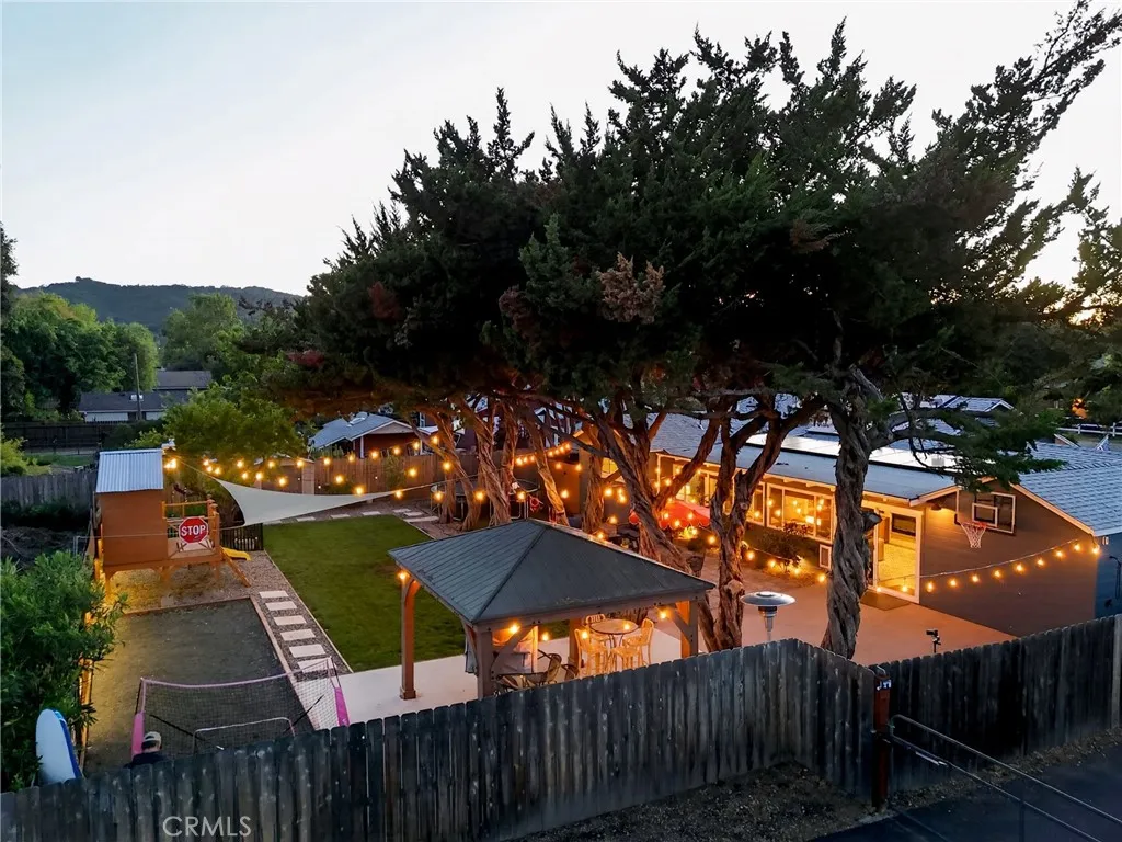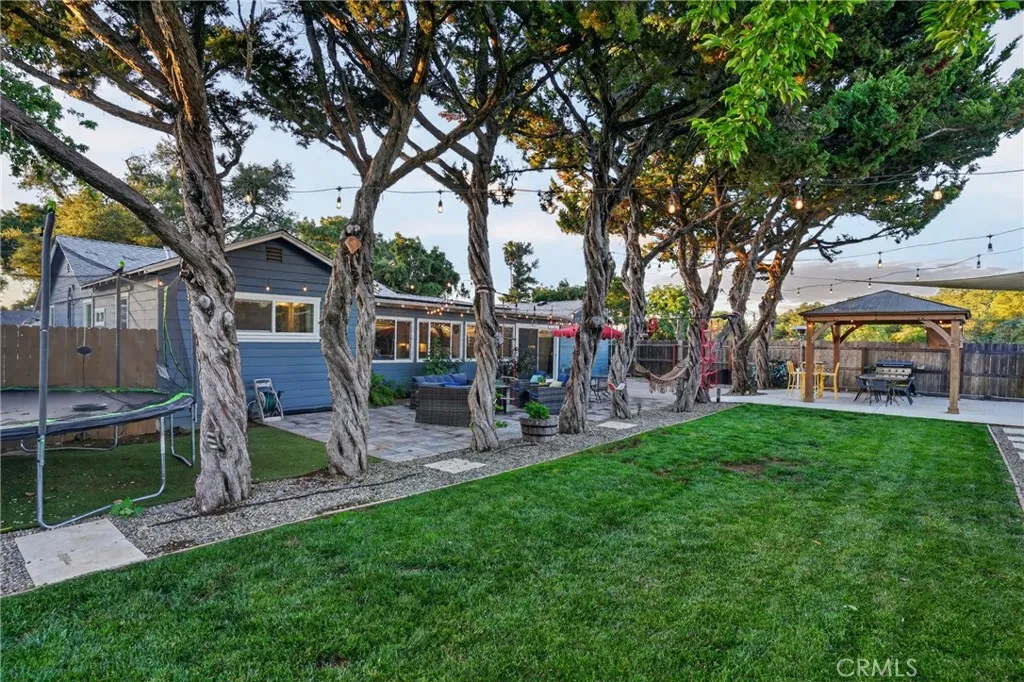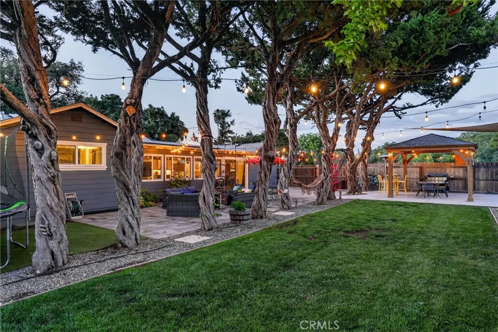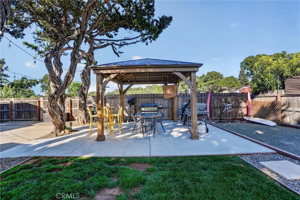 Style, comfort, and thoughtful upgrades come together at 5303 Carrizo Road in Atascadero, just minutes from town, Trader Joes, and convenient 101 access. A cobblestone pathway leads to the front door, where a charming composite porch, sprawling lawn, and gated entry with automatic gate create a welcoming first impression. The property is level and offers abundant parking, including RV parking with full hookups. Inside, the home features a warm and inviting layout with real hardwood flooring, updated lighting, and well-designed living spaces. The living room showcases stylish tile flooring, ceiling fans, and a wall of windows with sliders opening to the backyard for seamless indoor-outdoor flow. The kitchen has been tastefully updated with quartz countertops, shaker cabinetry, stainless steel appliances, a 5-burner stove, tile backsplash, and open shelving, all opening to the main living area. The dining space features updated lighting, while the hall bathroom has been renovated with solid surface counters, shaker cabinetry, and a tub/shower combination. Two guest bedrooms offer hardwood flooring and ceiling fans. The primary suite is a comfortable retreat with vaulted ceilings, ceiling fan, views of the backyard, and an updated en suite featuring custom tile, glass shower, quartz countertops, shaker cabinetry, and a private toilet area. The backyard is designed for both everyday enjoyment and entertaining, featuring a covered concrete patio with gazebo, additional paver patio, and caf lighting. Mature trees and a variety of fruit trees, including orange, avocado, apple, lem