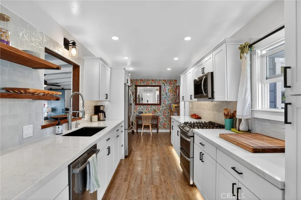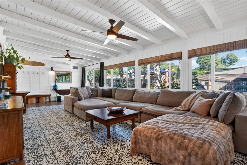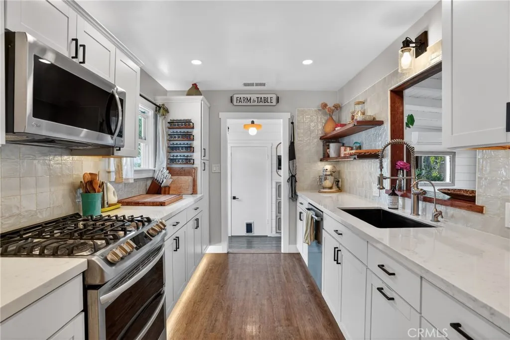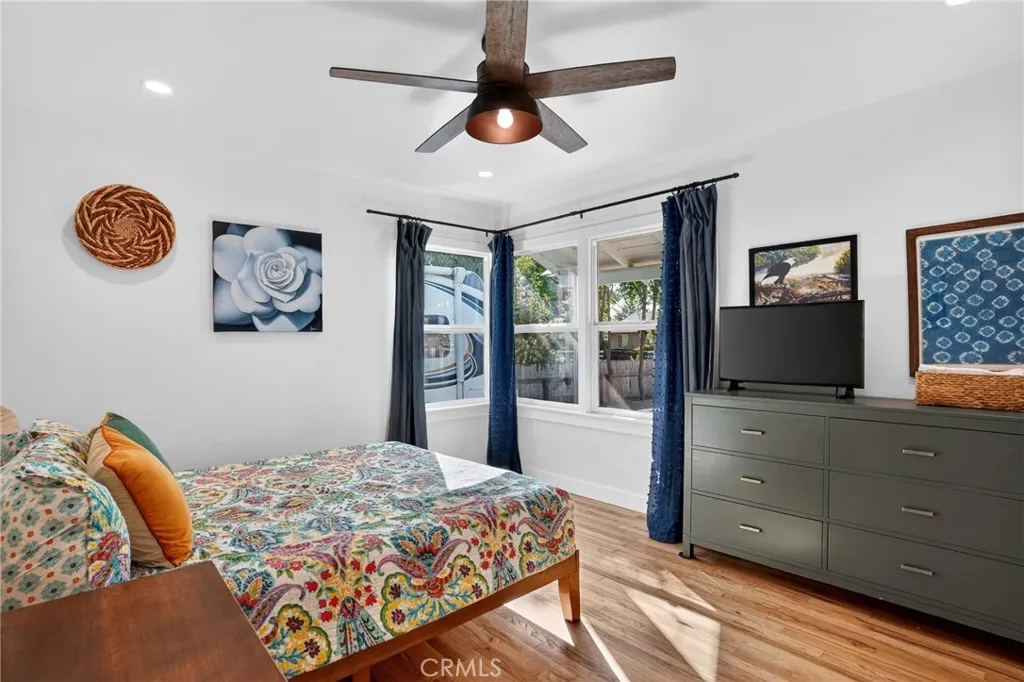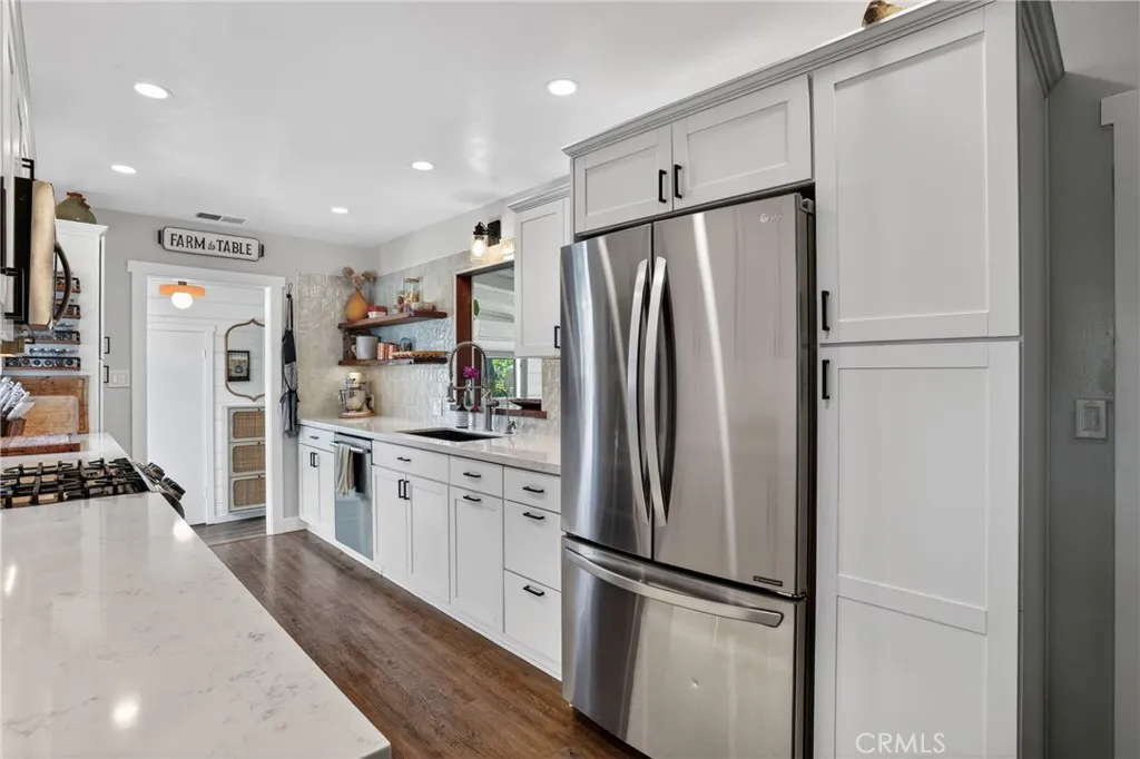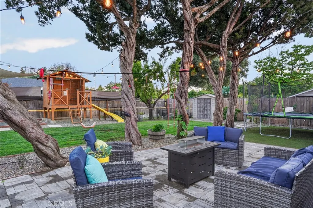 Style, comfort, and thoughtful upgrades come together at 5303 Carrizo Road in Atascadero, just minutes from town, Trader Joes, and convenient 101 access. A cobblestone pathway leads to the front door, where a charming composite porch, sprawling lawn, and gated entry with automatic gate create a welcoming first impression. The property is level and offers abundant parking, including RV parking with full hookups. Inside, the home features a warm and inviting layout with real hardwood flooring, updated lighting, and well-designed living spaces. The living room showcases stylish tile flooring, ceiling fans, and a wall of windows with sliders opening to the backyard for seamless indoor-outdoor flow. The kitchen has been tastefully updated with quartz countertops, shaker cabinetry, stainless steel appliances, a 5-burner stove, tile backsplash, and open shelving, all opening to the main living area. The dining space features updated lighting, while the hall bathroom has been renovated with solid surface counters, shaker cabinetry, and a tub/shower combination. Two guest bedrooms offer hardwood flooring and ceiling fans. The primary suite is a comfortable retreat with vaulted ceilings, ceiling fan, views of the backyard, and an updated en suite featuring custom tile, glass shower, quartz countertops, shaker cabinetry, and a private toilet area. The backyard is designed for both everyday enjoyment and entertaining, featuring a covered concrete patio with gazebo, additional paver patio, and caf lighting. Mature trees and a variety of fruit trees, including orange, avocado, apple, lem
