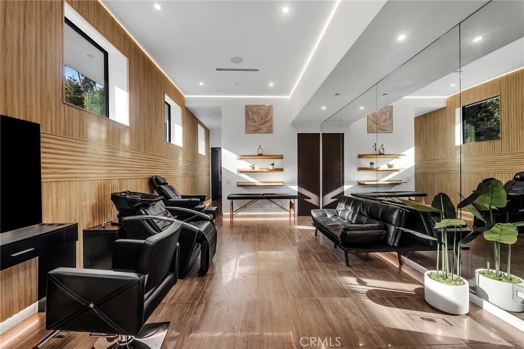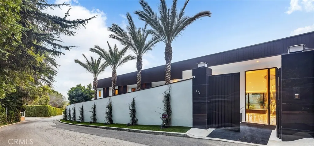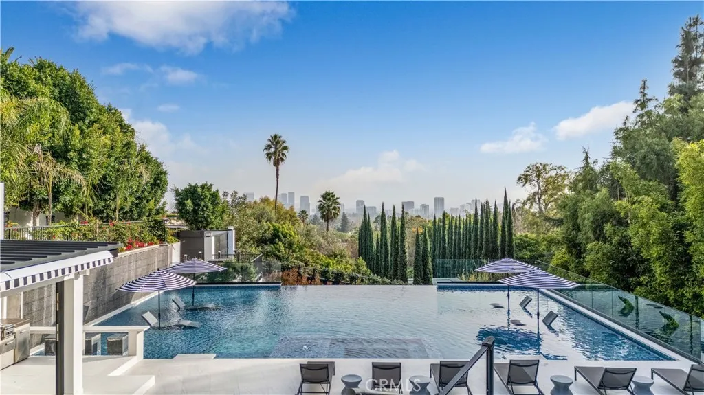 A breathtaking expression of sleek, modern architecture and elevated luxury, this newly constructed gated estate rests along Bel Air's prestigious Billionaire's Row. Beyond the impeccably landscaped courtyard is an extraordinary 20,000 square foot interior, masterfully designed to capture sweeping unobstructed views surrounded by some of the world's most valuable real estate. Created for grand scale entertaining, the seamless multi-level floor plan reveals expansive living spaces defined by dramatic linear fireplaces, soaring ceilings, and walls of automated glass that effortlessly merge indoor and outdoor living. Floor to ceiling windows flood the home with natural light while framing spectacular vistas; by evening, designer pendants, contemporary chandeliers, and refined recessed lighting create an intimate, sophisticated ambiance. All three levels are accessed by a statement staircase or commercial grade elevator and are appointed with premier amenities. Five sumptuous bedroom suites each with bespoke finishes, spa-inspired baths, generous walk-in closets, and private balconies, offer exceptional comfort. The primary suite is a retreat unto itself, showcasing vaulted ceilings, an elegant fireplace and expansive wraparound balcony, dual boutique style closets, and two lavish spa baths featuring oversized waterfall showers and a sculptural soaking tub. Additional highlights include a state-of-the art theater, fully equipped fitness center, wet and dry saunas, and a private salon/spa room. Outdoors, a striking infinity edge pool commands dazzling city views. A truly unique