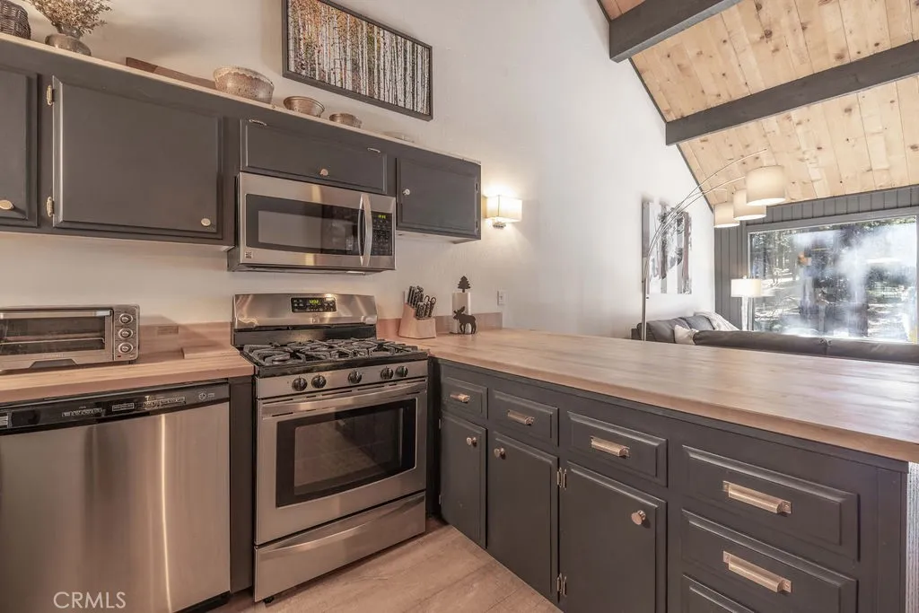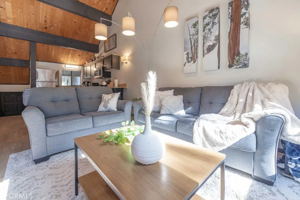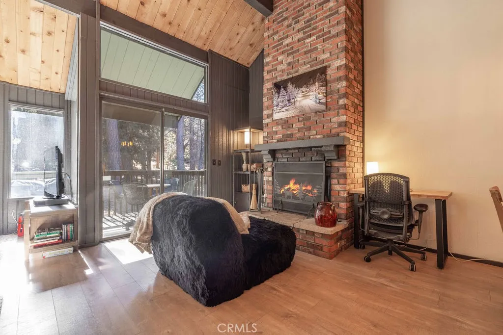 Dont miss your chance to own this slopeside escape. With direct access to Snow Summit while perfectly situated against the National Forest, you will appreciate the peaceful views and easy access to the slopes. With a private hot tub and this turnkey mountain condo offers the ideal combination of location, comfort, and investment potential. Step outside to access year-round adventureskiing, snowboarding, hiking, and biking are all just minutes away. The spacious floor plan features 2 bedrooms, 2 baths, and a bonus sleeping area with bunk beds. Upstairs, vaulted ceilings and a wood-burning fireplace create a warm, inviting atmosphere, complemented by an open kitchen and dining area perfect for gatherings. With newer flooring, indoor laundry, upper and lower decks, this property is ready for your next mountain adventureor to continue as a successful vacation rental.