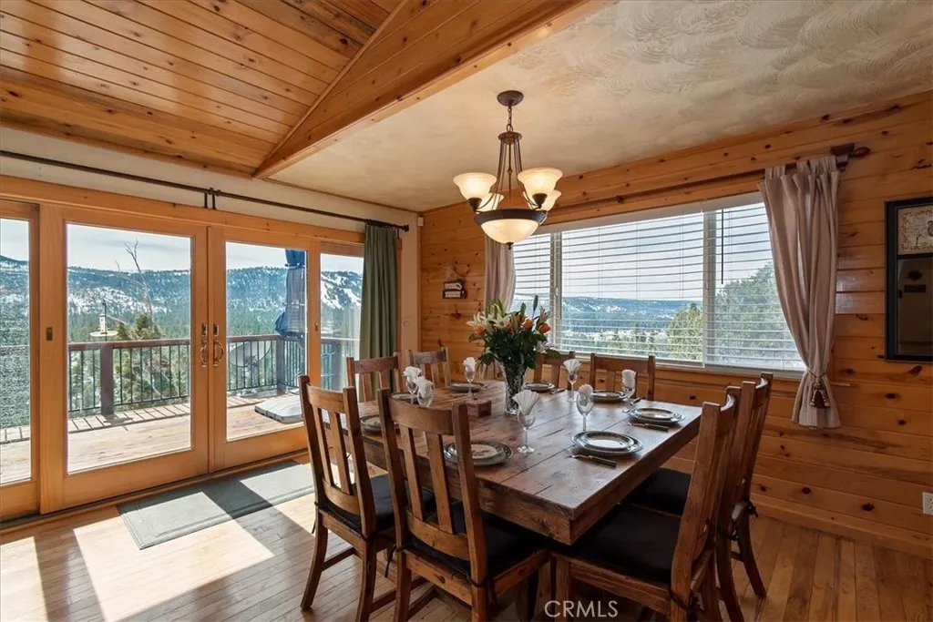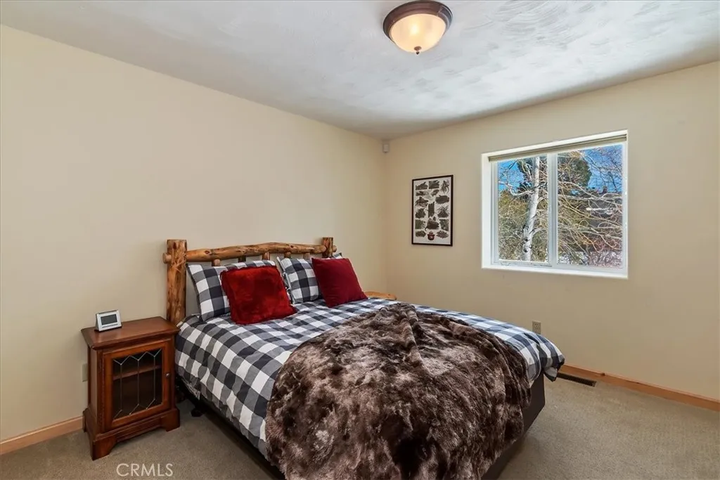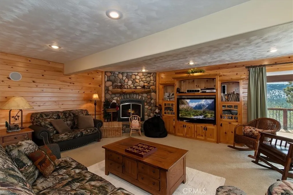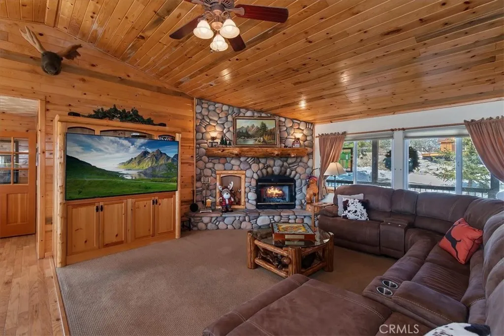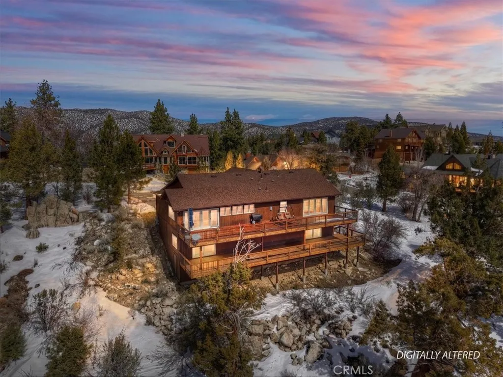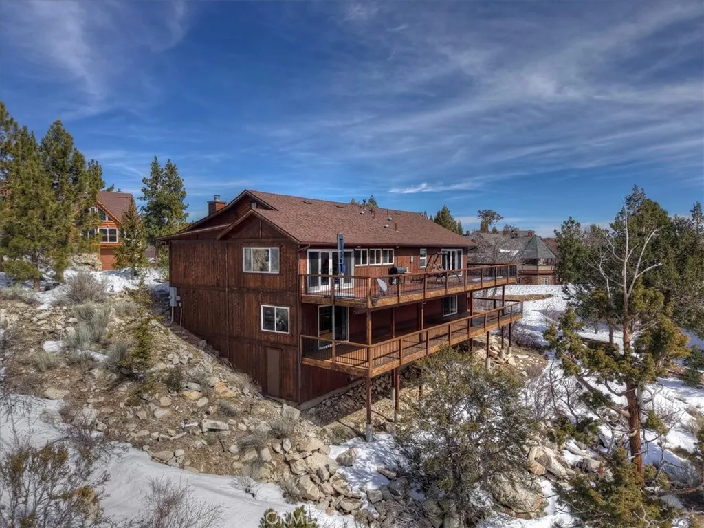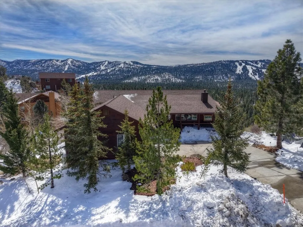 Perched at the top of prestigious Castle Glen on Pegasus Way, this luxury retreat captures breathtaking ski slope views of both Bear Mountain and Snow Summit. Designed with a reverse floor plan to maximize the scenery, the home features vaulted tongue-and-groove ceilings and expansive upper and lower decks overlooking unbuildable forest with a peek of the lake. Offering 5 bedrooms plus an additional office and 4 full bathrooms, the layout is ideal for hosting and privacy alike. The main level includes 3 bedrooms and 2 baths, while the lower level offers 2 bedrooms, an office, and 2 baths. Two spacious primary suites feature walk-in closets and direct deck access. Each level is complete with its own living room, fireplace, and laundry room. Dual forced-air heaters and dual water heaters provide comfort and efficiency year-round. The kitchen is appointed with granite countertops and stainless-steel appliances. Turn-key and thoughtfully designed, this mountain estate also includes a way oversized two-car garageperfect for vehicles, toys, and gear.