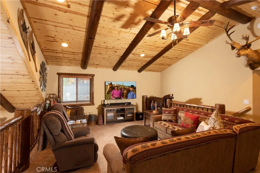 OWNER FINANCING AVAILABLE! Escape to this stunning 3-bedroom, 2.5-bath log-style cabin in picturesque upper Moonridge with ski slope views. Nestled amidst nature and close to Bear Mountain, this unique home features vaulted tongue-and-groove ceilings, an open-concept floor plan, a spacious loft area perfect for entertaining, a gourmet kitchen with granite counters, breakfast bar, and stainless appliances. The large private master suite on the main level boasts a beautiful en-suite bathroom with a separate shower, jetted soaking tub, and walk-in closet. With multiple entertaining areas and plenty of space both inside & out, you will love spending time with family and friends. Enjoy relaxing in the spa under a million stars! Additional amenities include an attached garage ensuring easy access and a separate laundry room for added convenience. Enjoy serene sunsets and outdoor adventures from this impeccably appointed retreat! Call today to learn more about owner financing options!