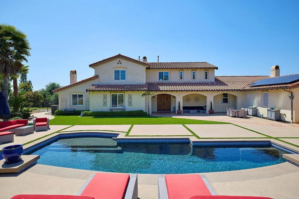 Tucked within the gentle rolling hills of Bonsall, this distinguished estate embodies the perfect balance of rural tranquility and refined sophistication. Set at the end of a peaceful cul-de-sac on 2.01 acres, the property enjoys panoramic vistas, coastal breezes, and an enduring sense of calm rarely found in North County. Here, the only sounds are the rustle of leaves and the distant hum of nature, yet you are just 12 miles from the ocean, Michelin-star dining, and the vibrant coastal lifestyle of Encinitas, Carlsbad, and Oceanside. The residence unfolds with graceful architecture and timeless comfort, offering 4 spacious bedrooms and 3.5 baths. Sunlight filters through soaring ceilings, accentuating warm tones and three stately fireplaces that invite relaxation. The primary suite is a serene retreat of its own, featuring a spa-inspired bath with a jetted tub, custom shower, and expansive walk-in closet. Perfect for gatherings large or small, the gourmet kitchen blends form and function with a generous island, dual ovens, and seamless connection to outdoor living spaces. Step outside to enjoy wide-open views, vivid sunsets, and the soft hush of evening settling across the hills. A sparkling saltwater pebble tech pool with Baja shelf, spa, and cascading fountains anchors the resort-style grounds, surrounded by patios designed for quiet morning coffee or elegant twilight entertaining. The acreage offers endless possibilities, whether envisioning a workshop, guesthouse, or hobby vineyard. Additional features include a second story loft adjoining the fourth bedroom, dual-zoned
