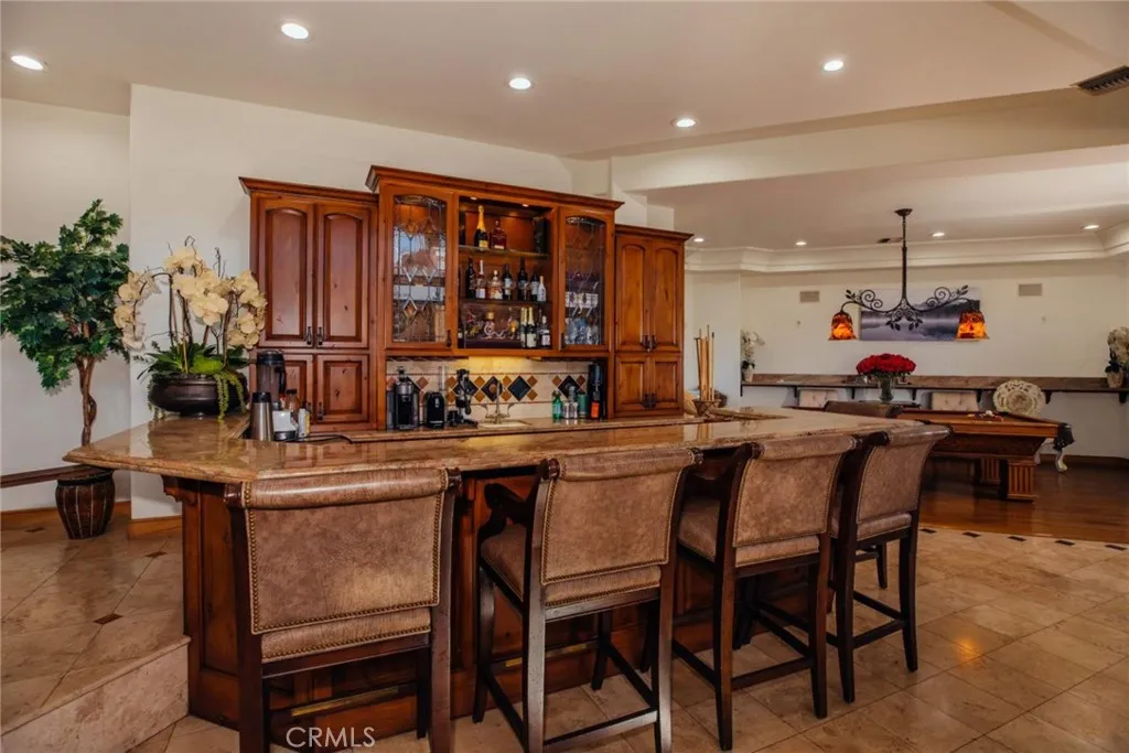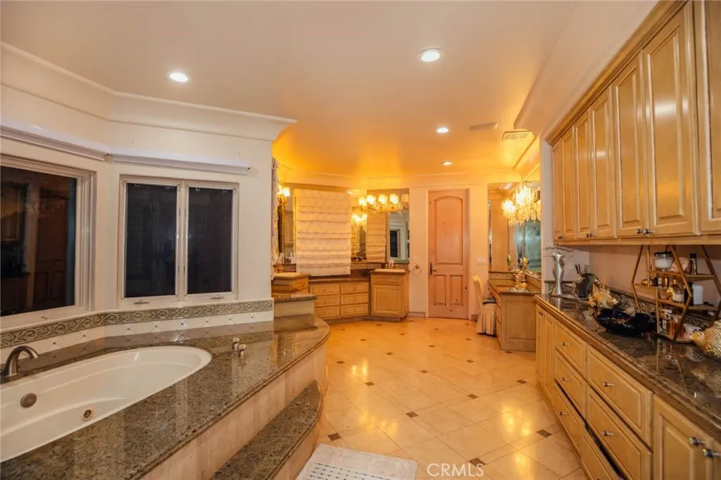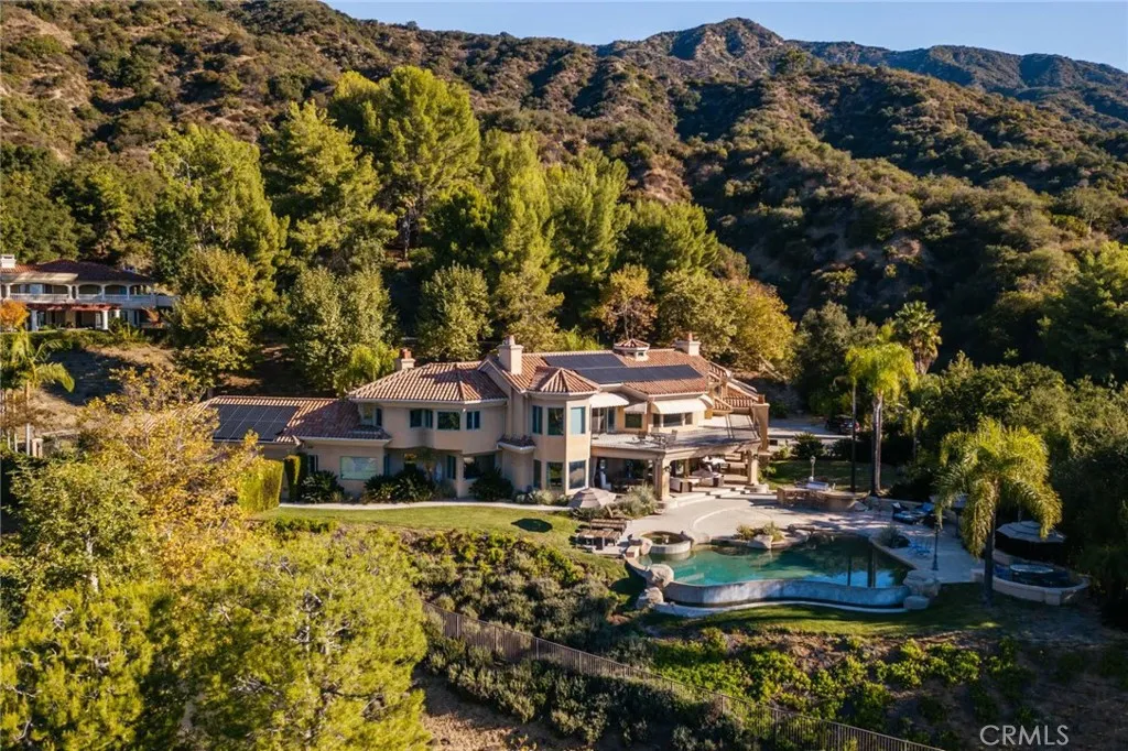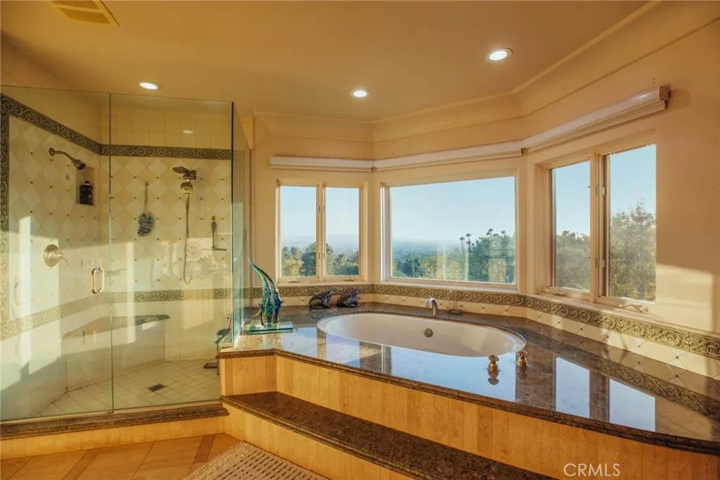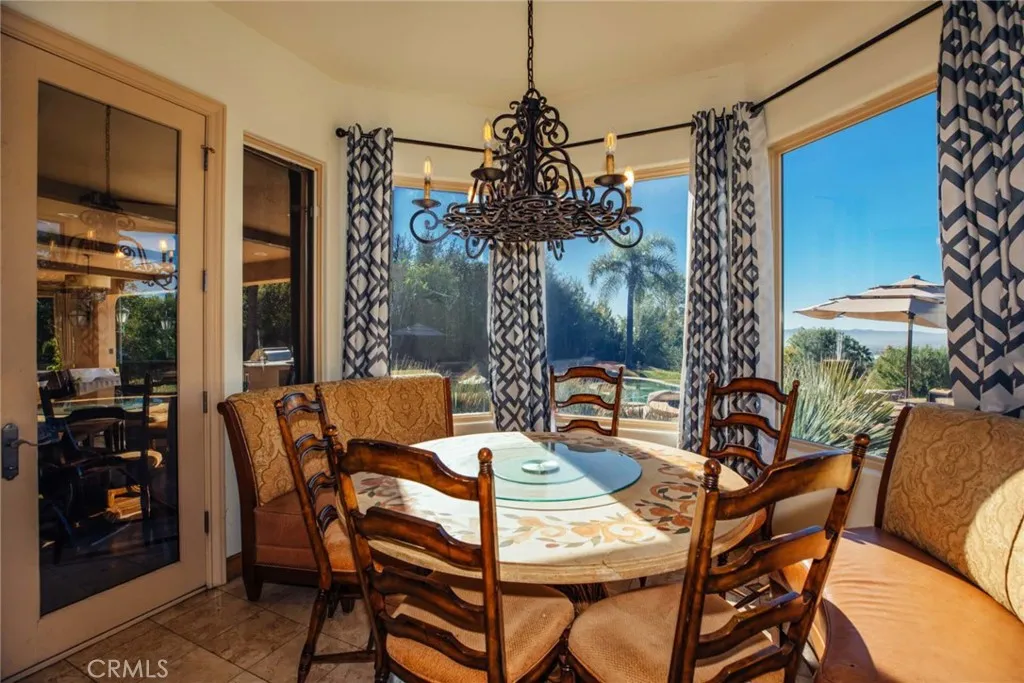 Custom built estate located at the top of the exclusive 24-hour guard gated community of Bradbury Estates on a 5+acres lot. 2nd time on market, this home offers spectacular panorama city lights & mountain views. No expense was spared when this custom home designed by J Don Crenshaw, one of the most revered architects in the area, was built by Mur-Sol Construction. With magnificent tall open beam ceilings, custom built knotty alder cabinets & doors, this beautiful Mediterranean style home features a spacious gourmet kitchen with Thermador Professional stainless cook top 6 burners & griddle, 2 convection ovens, warming drawer, 2 dishwashers, refrigerator, large island with sink, abundance of granite counter tops & walk-in pantry. Open floor plan with huge great room with soaring ceiling & large walkup wet bar with back bar aside billiard room. Immense outdoor living area with fireplace, open beam ceiling, gas lamps-overlooking beautiful infinity pebble tech pool & spa with beach entry. Viking BBQ bar, Viking refrigerator, Perlick draft beer disp. & sink, next to poolside fire pit. Perfect for the Car enthusiast or collector is a 3-car garage plus an 8-car garage with tall doors & high ceilings-can accommodate a motor home & car lifts. It has heavy power & plumbed with airlines. Pre-plumbed for 2 baths, could be converted into 2-bedroom suites & theater adding 1,652 square feet. A wonderful opportunity to entertain friends and family in this beautiful home in the exclusive Bradbury Estate.