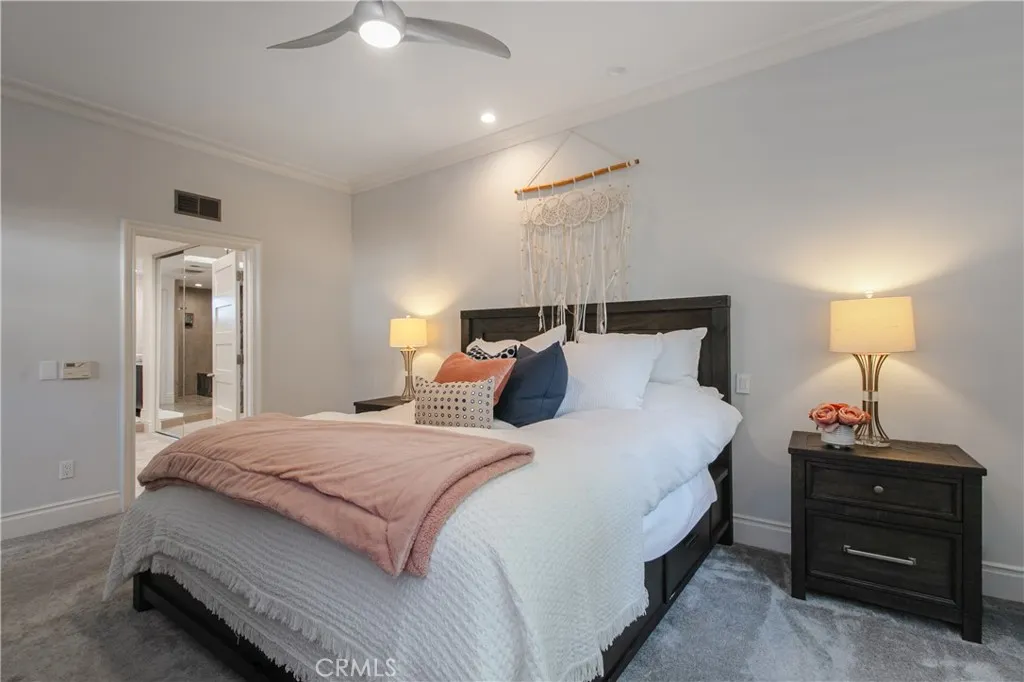This beautifully updated unit offers three bedrooms and two-and-a-half bathrooms within the prestigious, gated Creekside community. An open-concept layout is highlighted by soaring vaulted ceilings and abundant natural light. The newly remodeled chefs kitchen features a spacious refrigerator, a professional five-burner range and cooktop, and views to the backyard and family room, all seamlessly flowing into the main living areas. The family room is anchored by a striking glass-burning fireplace, creating a warm yet modern focal point. A bright downstairs bedroom provides flexibility as a guest room or an ideal home office, complemented by an elegant powder room for guests. Upstairs, the primary suite is a true retreat, featuring a spa-inspired en-suite bathroom with a generous dressing area and an expansive open walk-in shower. The second upstairs bedroom, with its own luxurious en-suite bathroom, is generously sized and offers comfort, privacy, and versatility, making it ideal for guests or family members. French doors open to a private and serene backyard patio with an outdoor firepit, perfect for relaxing or entertaining. Additional highlights include a two-car garage with direct access, a separate laundry room, and a prime location just minutes from The Commons at Calabasas and Calabasas Lake. A rare opportunity to own a refined, turnkey residence in one of Calabasas most desirable communities.