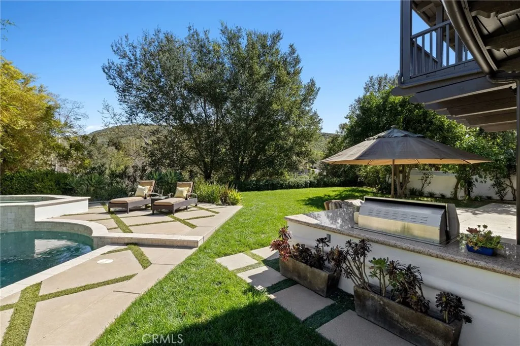 Privately positioned at the end of a quiet cul-de-sac in The Oaks of Calabasas, 3850 Prado De Las Uvas offers over half an acre of resort-style living with approximately 7030 square feet, 5 ensuite bedrooms - 1 down and 4 up, and a flexible modern floor plan seamlessly designed for ease and flow. This Mediterranean estate features warm wood floors, beam ceilings, a dramatic great room with fireplace, and a perfectly located chefs kitchen equipped with premium stainless appliances, double ovens, oversized island, and custom cabinetry. Downstairs the well designed flow is built around access to the desired and vast multiple outdoor spaces. Perfect for large gatherings or intimate nights. The upstairs primary suite complete with separate sitting area, delivers privacy and scale with its own fireplace, covered veranda, and remodeled spa-inspired bath with soaking tub and oversized shower. Upstairs has the sizable laundry room, office/ theater space, and gym overlooking the backyard. Designed for entertaining, the oversized backyard showcases a sparkling pool, waterfall, and spa, built-in BBQ with seating, covered patio lounge with fans and heaters, full-size sport court, and mature landscaping for exceptional privacy. Residents enjoy exclusive access to The Oaks 24-hour guard-gated security, clubhouse, tennis and pickleball courts, fitness center, basketball court, and resort-style pool. Located just minutes from Malibu The Commons at Calabasas and within the award-winning Las Virgenes School District. Luxury, privacy, and location all in one of Calabasas most sought-after com