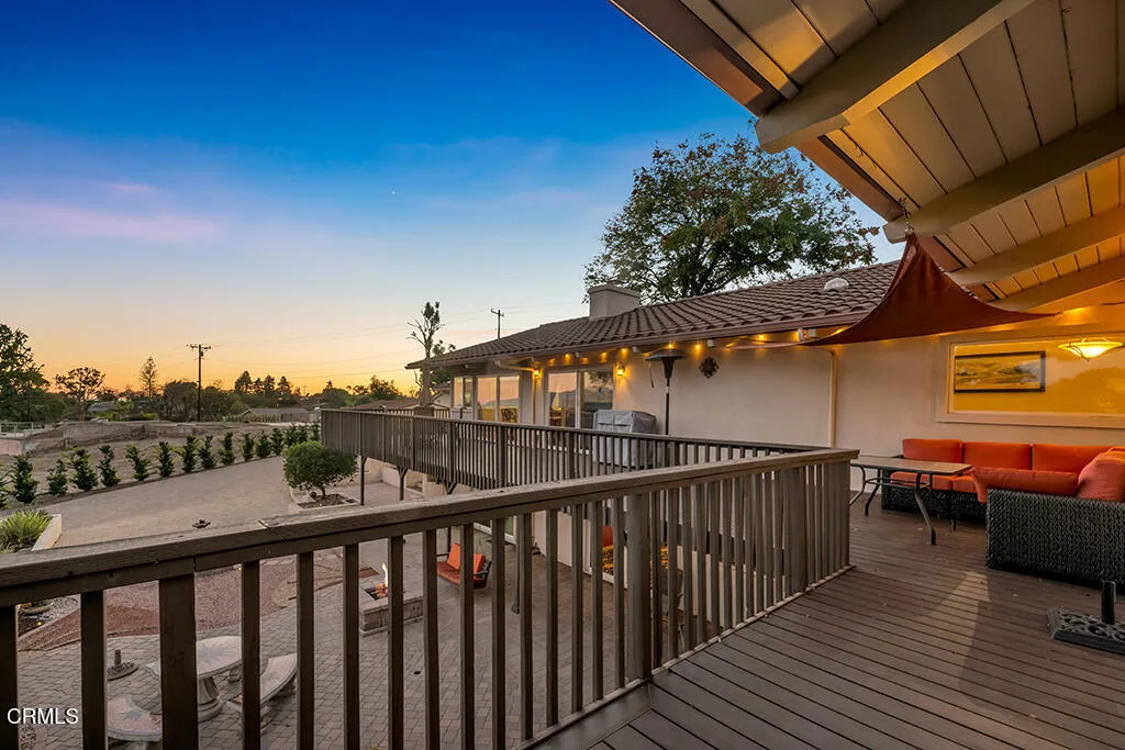 Perched in the prestigious Las Posas Estates, this remarkable hillside residence captures sweeping views of the city, mountains, and ocean--creating an entertainer's paradise in an atmosphere of tranquility and sophistication. Nestled on a quiet cul-de-sac street, this custom-designed home seamlessly blends refined elegance with effortless comfort. The main level features three spacious en-suite bedrooms, with the primary bedroom designed to take advantage of the home's stunning vistas. The gourmet kitchen is a culinary dream, showcasing a commercial-sized refrigerator and freezer, professional-grade gas range, walk-in pantry, granite countertops, and an inviting eat-at counter. Morning light pours through expansive windows, illuminating the open-concept living and dining areas that flow effortlessly to wrap-around decks--ideal for indoor-outdoor entertaining. The primary suite is a serene retreat with vaulted wood beam ceilings and dramatic picture windows framing the breathtaking views. Downstairs, a stylish speakeasy bar with tin ceiling plus bonus room with a dedicated powder room set the stage for memorable gatherings, while sliding glass doors open to a spacious patio complete with a firepit and outdoor lounge. Downstairs also includes a fourth bedroom or office plus a 3/4 bath. Film enthusiasts will enjoy the dedicated media room with cozy, oversized theater seating, a 96' screen, and projector. For car collectors and hobbyists, the property offers exceptional amenities--including a generous three-car garage, separate storage/workroom large enough to accommodate anot