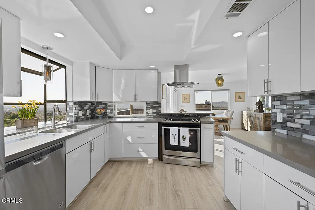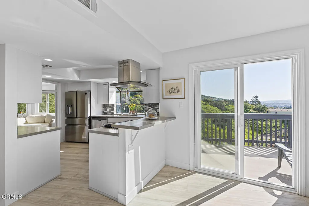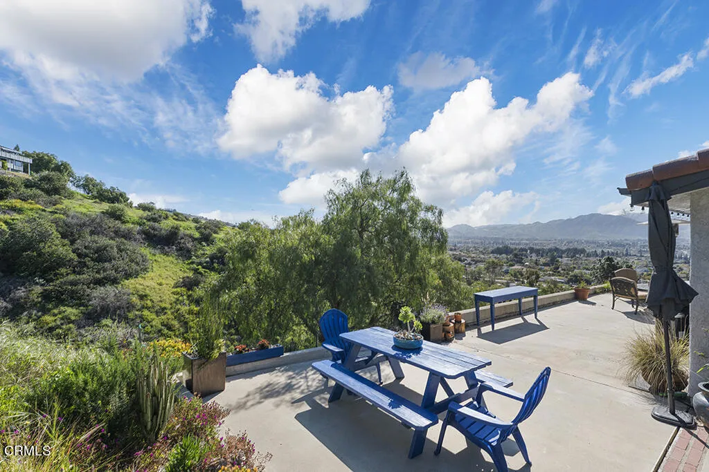 Set on a .89-acre hilltop overlooking the entire Camarillo Valley, this 2,200 sq ft custom three-story home captures the beauty and quiet hillside lifestyle Camarillo is known for. Sweeping 360-degree views of mountains, rolling hills, and ocean glimmers surround the property and create an atmosphere of total peace and privacy.The middle floor is the main living level, featuring an open-plan kitchen and dining area that open directly to a wraparound balcony--perfect for outdoor meals, morning coffee, and enjoying the breeze. A cozy TV/seating area, a separate living room, a bathroom, and a two-car garage with direct access to the middle-deck patio with more dramatic mountain views.The top-floor primary suite feels like a private retreat. Wake up to ocean views, step outside onto your own balcony, and unwind in an en-suite bathroom with a soaking tub framed by dramatic mountain scenery.The lower level includes three additional bedrooms, including one with direct backyard access, plus a full bathroom with a bathtub, a laundry area, and a side-passage door for easy outdoor entry--ideal for guests, family, office use, or multi-generational living.The backyard is a true hillside sanctuary with multiple seating areas designed to take in the panoramic views. Whether you're hosting friends, relaxing at sunset, or enjoying a quiet morning, the setting is peaceful, private, and unlike anything else in Camarillo.Perfect for remote professionals, creatives, LA weekend buyers, or anyone seeking a serene hillside home just an hour from Los Angeles and minutes from the coastal drive towar