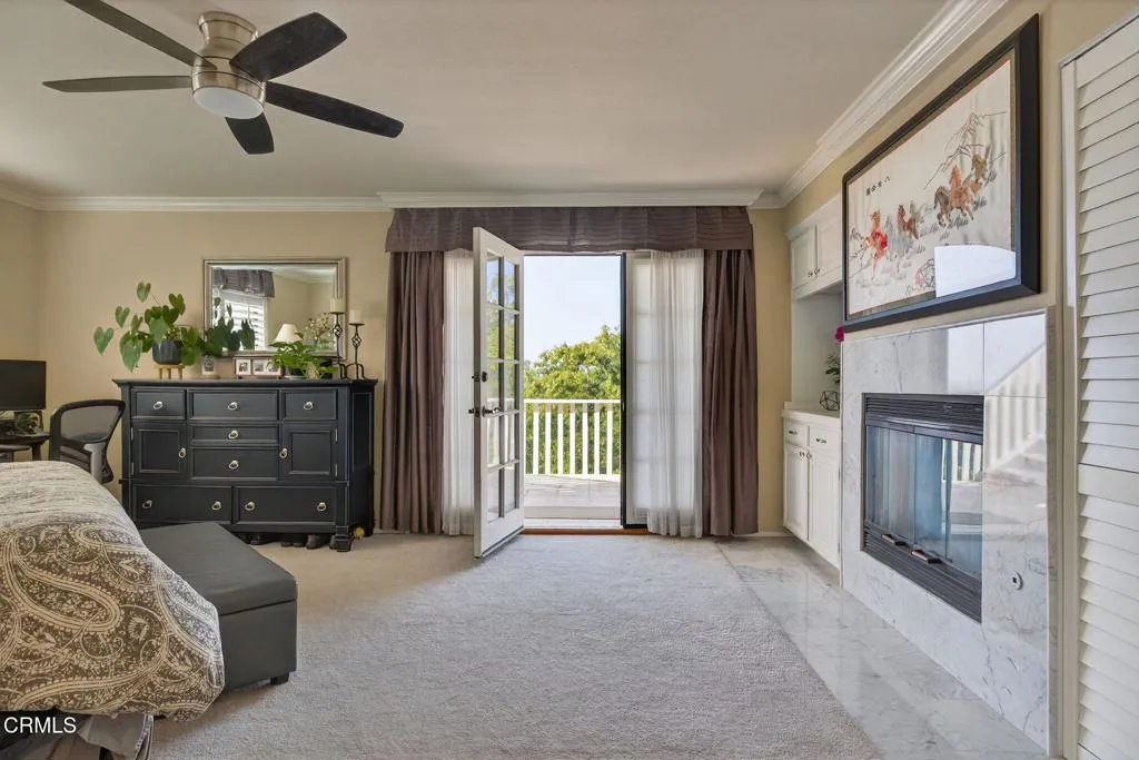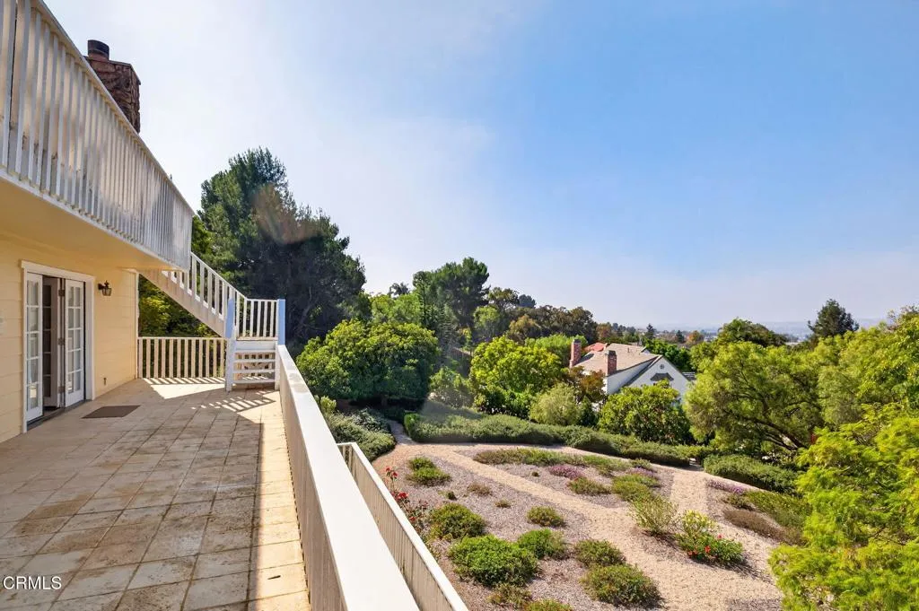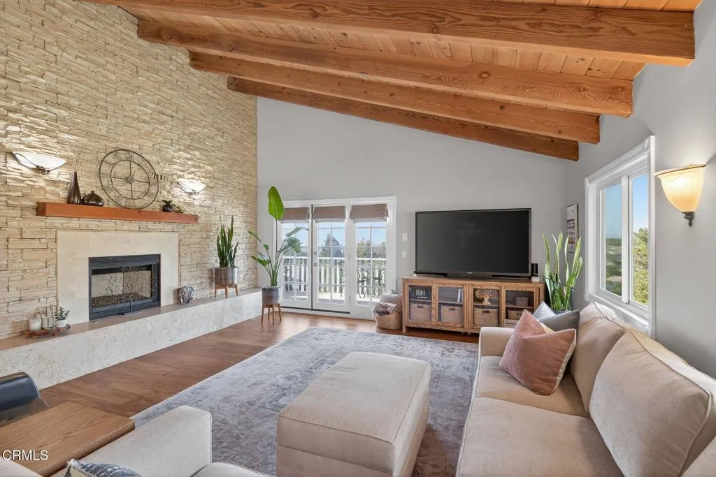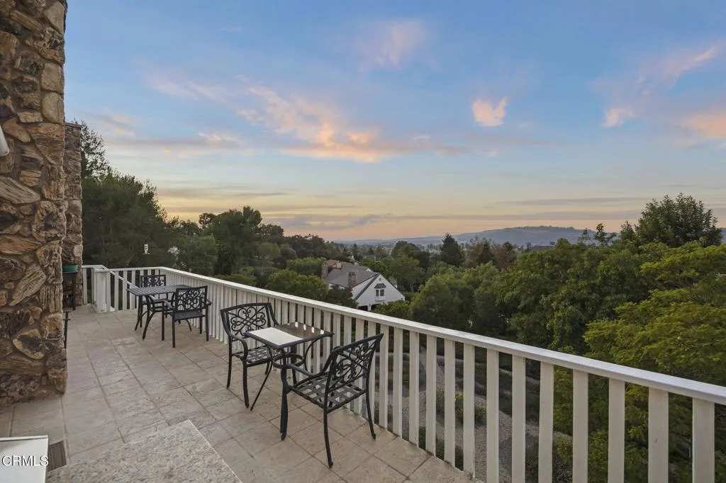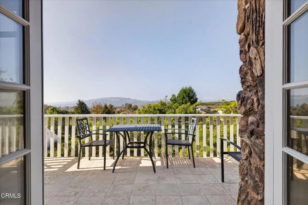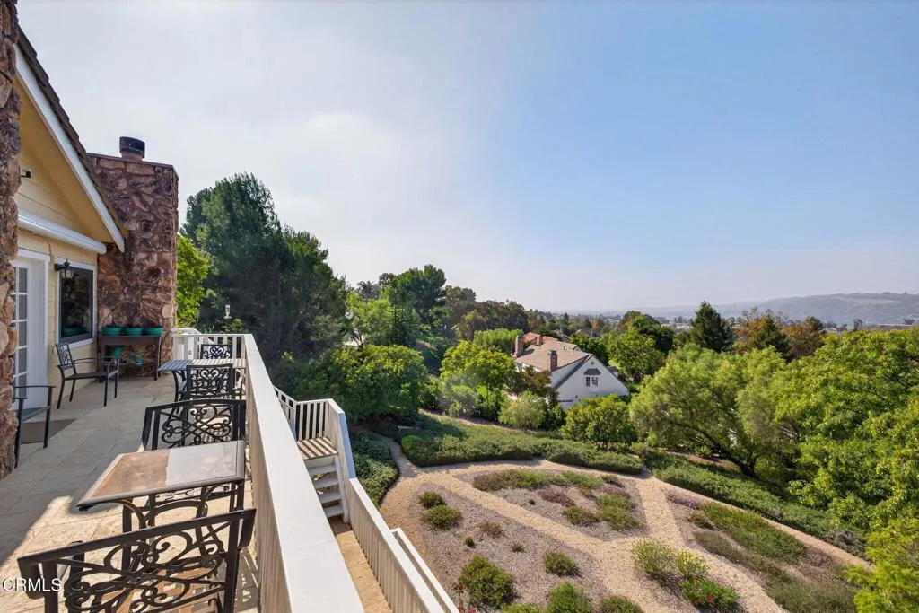 Perched in the Serene Terra Bella Estates neighborhood on a sprawling 1-acre lot, this 3,560 sq ft, 4-bedroom, 4-bathroom architectural stunner offers breathtaking vistas of Camarillo from every room and all three expansive private balconies--your daily dose of coastal-inspired tranquility. With paid solar panels eliminating electricity bills and a Pebble Stone driveway welcoming you home in style, energy efficiency meets effortless curb appeal in this haven of modern comforts and natural beauty. Step inside to vaulted ceilings adorned with exposed natural wood beams and elegant oak woodwork framing every window and door, complemented by newer dual-pane glass for whisper-quiet serenity. Recessed lighting bathes the open living spaces in a warm glow, while crown molding and newer stair railings add refined touches throughout. The heart of the home shines with Acacia engineered hardwood floors flowing seamlessly from the living room to the gourmet kitchen, outfitted with a premium KitchenAid oven and fridge, a built-in wine fridge, a whole-house intercom for seamless communication.Retreat to the primary suite, a true sanctuary featuring an elegant bedroom with a marble accented fireplace and an ample bathroom with mercerized tile floors, a dual-head, upgraded shower with quilted tile walls, a sunken spa tub, a large vanity, and separate makeup area complete with its own sink. Unwind by the versatile wood-and-gas fireplace, slip through French doors to your balcony, or organize in the cedar-paneled walk-in closet. Nearby, see the office (or bedroom) with adjacent full bathroom