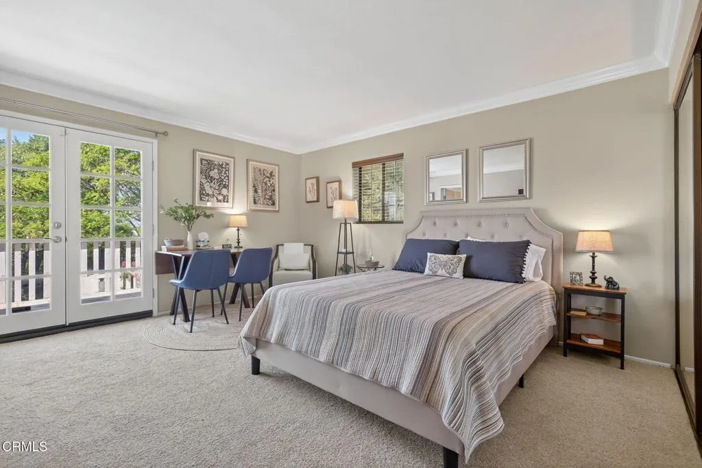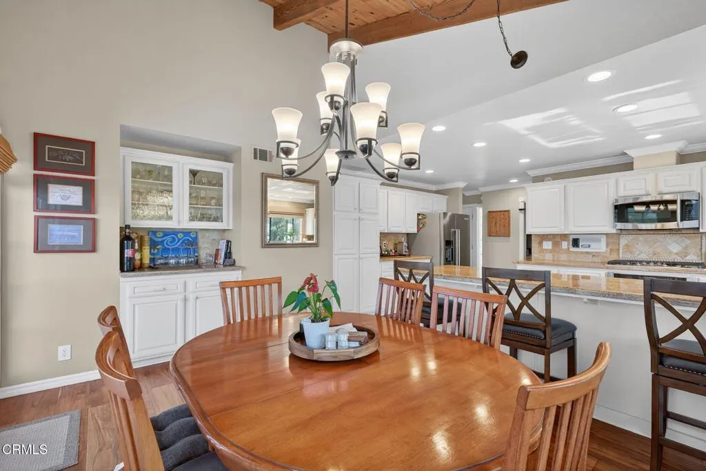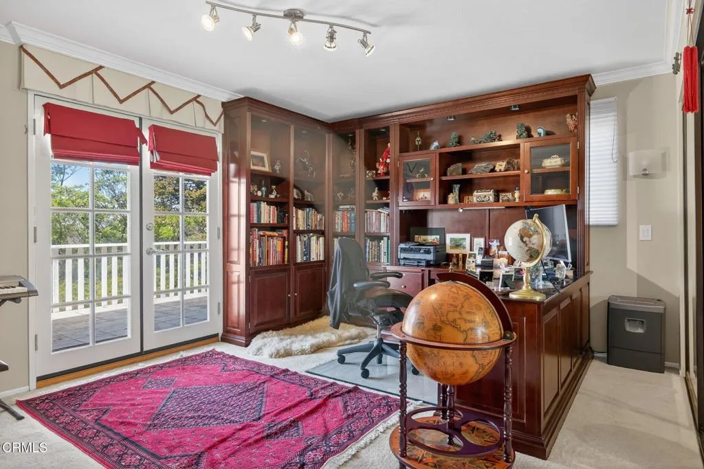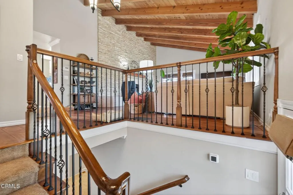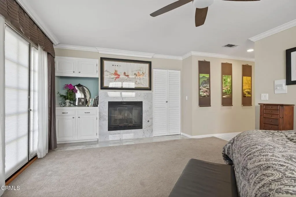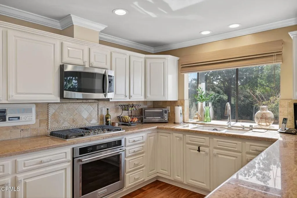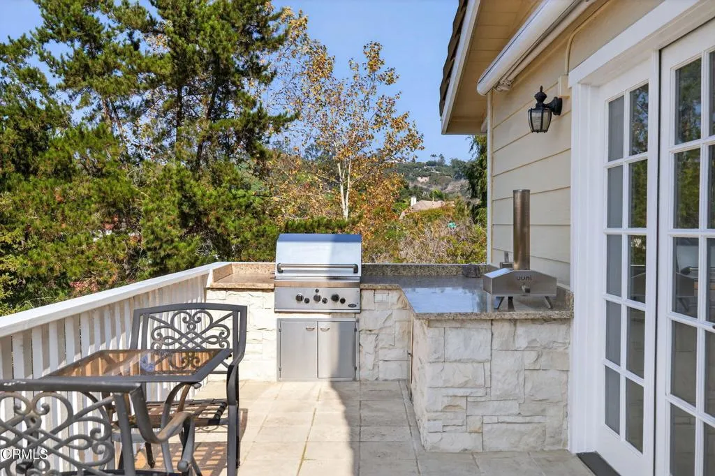 Perched in the Serene Terra Bella Estates neighborhood on a sprawling 1-acre lot, this 3,560 sq ft, 4-bedroom, 4-bathroom architectural stunner offers breathtaking vistas of Camarillo from every room and all three expansive private balconies--your daily dose of coastal-inspired tranquility. With paid solar panels eliminating electricity bills and a Pebble Stone driveway welcoming you home in style, energy efficiency meets effortless curb appeal in this haven of modern comforts and natural beauty. Step inside to vaulted ceilings adorned with exposed natural wood beams and elegant oak woodwork framing every window and door, complemented by newer dual-pane glass for whisper-quiet serenity. Recessed lighting bathes the open living spaces in a warm glow, while crown molding and newer stair railings add refined touches throughout. The heart of the home shines with Acacia engineered hardwood floors flowing seamlessly from the living room to the gourmet kitchen, outfitted with a premium KitchenAid oven and fridge, a built-in wine fridge, a whole-house intercom for seamless communication.Retreat to the primary suite, a true sanctuary featuring an elegant bedroom with a marble accented fireplace and an ample bathroom with mercerized tile floors, a dual-head, upgraded shower with quilted tile walls, a sunken spa tub, a large vanity, and separate makeup area complete with its own sink. Unwind by the versatile wood-and-gas fireplace, slip through French doors to your balcony, or organize in the cedar-paneled walk-in closet. Nearby, see the office (or bedroom) with adjacent full bathroom