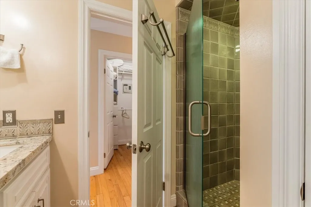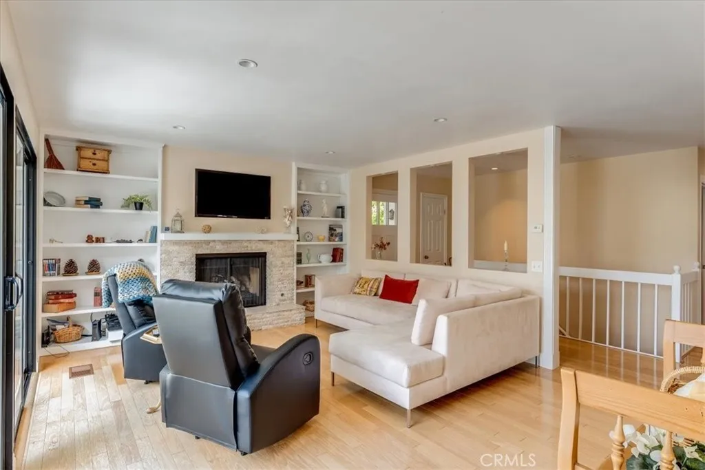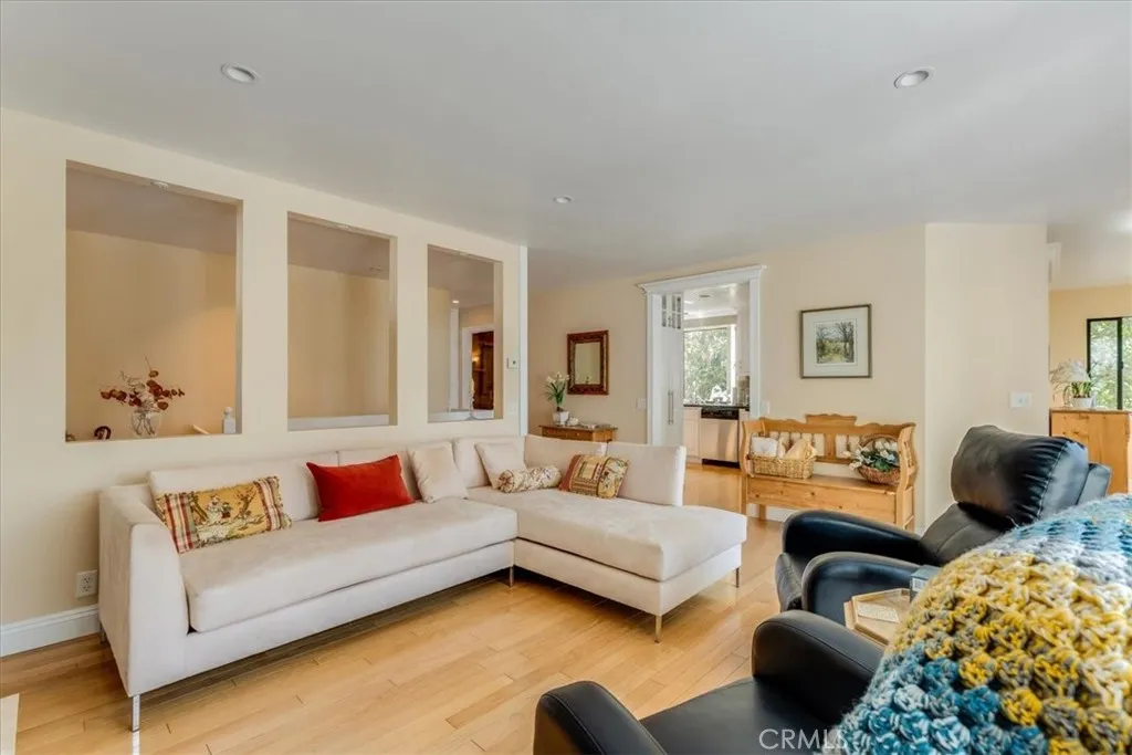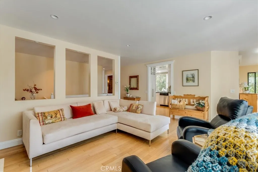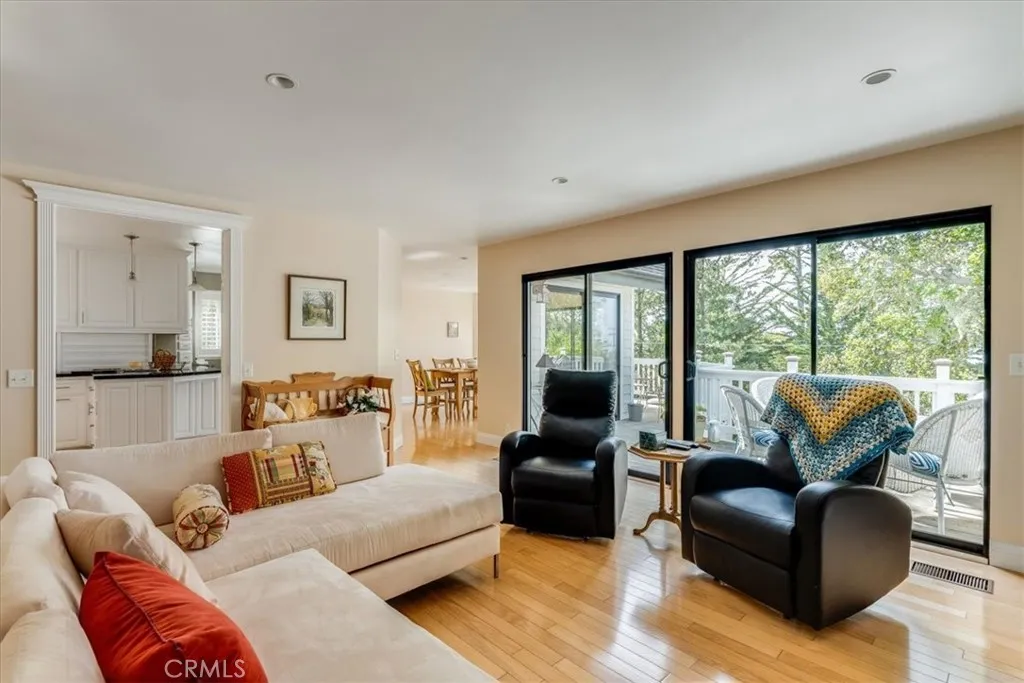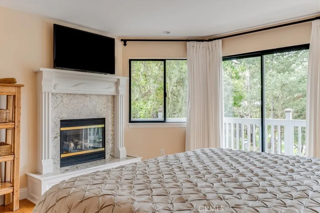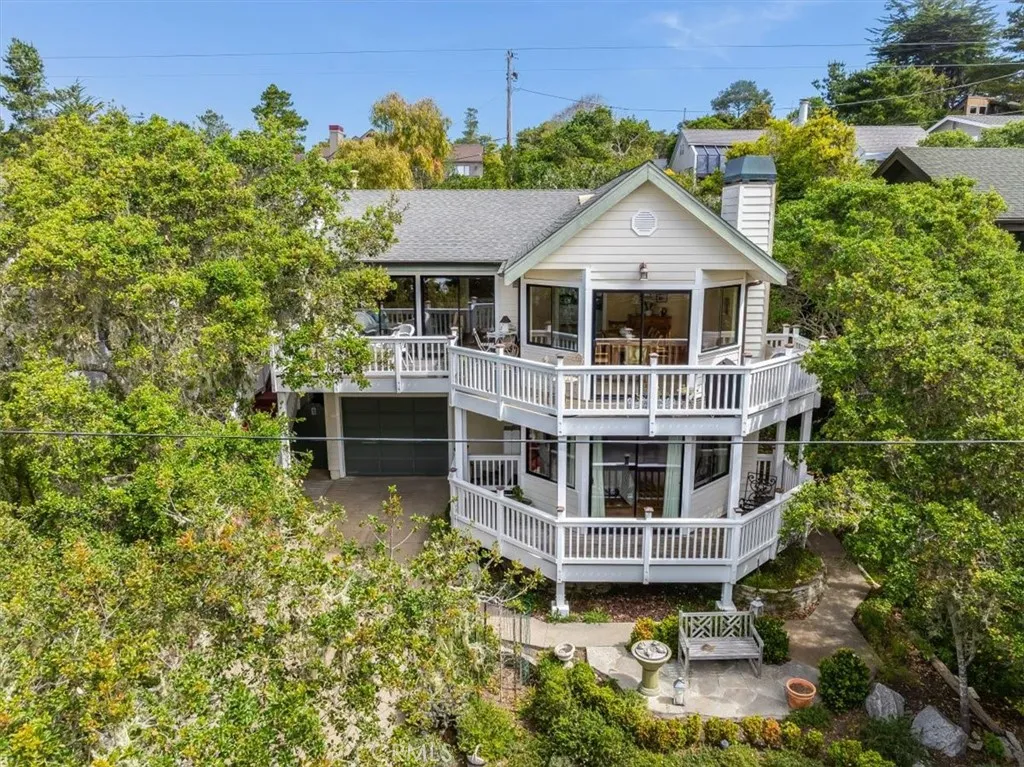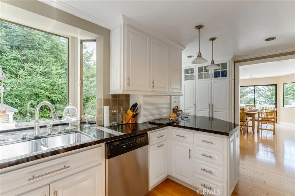 Situated in a premier Lodge Hill location, this elegant Colonial-style home offers sweeping views of the Pacific Ocean and refined living both inside and out. Featuring three bedrooms and three bathrooms, the home is thoughtfully updated and exudes timeless charm with modern conveniences. Hardwood floors run throughout all main living areas, while the bathrooms are finished with tile for a clean and polished look. The kitchen is a chefs dream, fully upgraded with granite countertops, ample cabinetry including a built-in appliance garage, a six-burner cooktop, double oven, wine cooler, and a walk-in pantry. Recessed and ceiling-mounted lighting highlights the sleek, modern design, creating a bright and functional space. The dining area comfortably fits a large table and opens to a deck that showcases beautiful ocean views, perfect for dining al fresco. In the living room, built-in cabinets and shelving offer stylish storage and display options, while a gas fireplace adds warmth and ambiance. This space seamlessly flows out to the deck, extending the living area outdoors and capturing the natural beauty that surrounds the home. A full bathroom and one bedroom are also located on this level, providing flexibility for guests or. Downstairs, the en-suite guest bedroom has access to the outdoors. The primary bedroom includes its own gas fireplace and opens to a private deck where ocean views create a peaceful retreat. During the most recent remodel, the home was thoughtfully upgraded with new bathrooms, kitchen finishes, interior doors, trim, and lighting fixtureseach detail cont