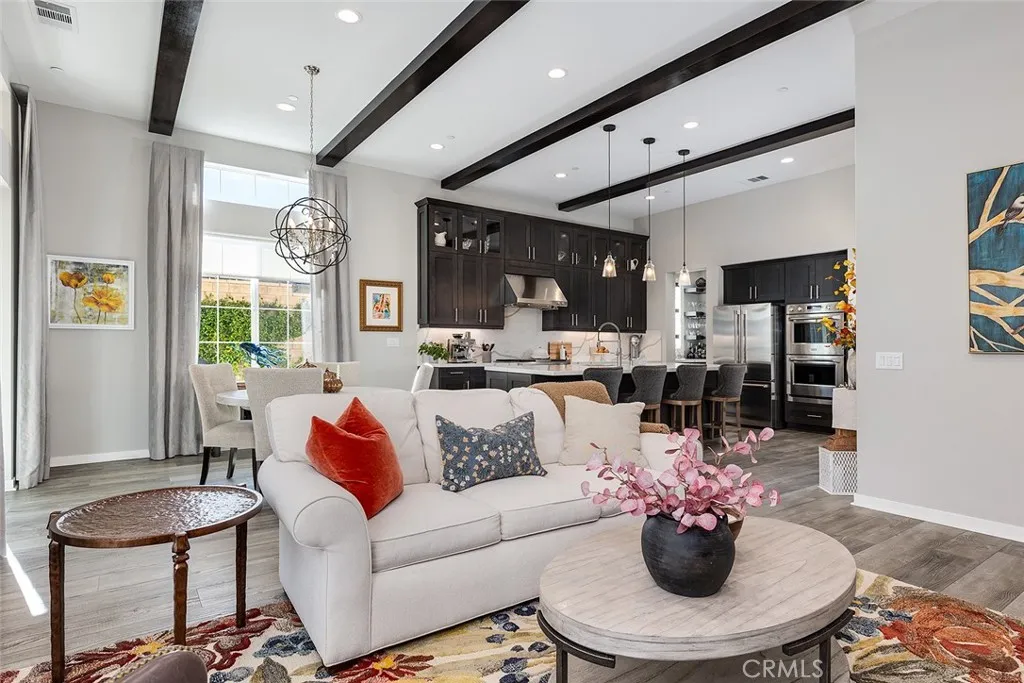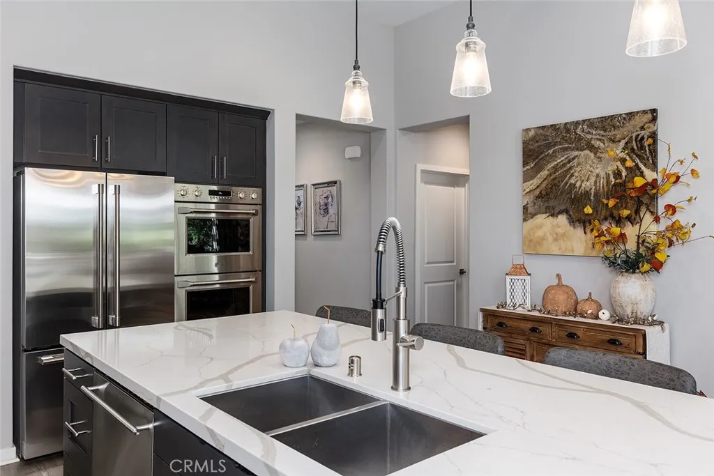 Set on a premier corner lot in the highly desirable Verano at Aliento community of Santa Clarita, this stunning single-level residence combines sophisticated design, luxury upgrades, and effortless indoor-outdoor living! The open-concept floor plan features two private bedroom suites plus an elegant guest powder room. The gourmet kitchen is a chefs dreamupgraded with GE Monogram stainless steel appliances, including a double oven, four-burner gas cooktop with griddle, quartz countertops with matching backsplash, and an artisan Chef Pro sink. Stacked upper cabinets with glass doors, under-cabinet lighting, a butlers pantry, and a walk-in pantry with custom built-ins provide exceptional storage. A spacious quartz center island anchors the kitchen, offering the perfect gathering place for cooking and conversation. The great room showcases dark wood-beamed ceilings, a gas fireplace and custom built-in cabinetry, and transitions seamlessly through a two-panel sliding glass door to a very private professionally landscaped backyardideal for entertaining or relaxing in style! Extra outdoor details include professionally installed Trimlights, drip irrigation and two separate gas lines for a firepit and BBQ.Nestled adjacent to the Golden Valley Open Space, Verano at Aliento celebrates the best of the California lifestyle with miles of scenic trails, parks, and walking paths. This double-gated, age-restricted community offers residents access to two resort-style community centers, featuring pools, spas, fitness facilities, and clubhouses. This is California living at its finestwelcome