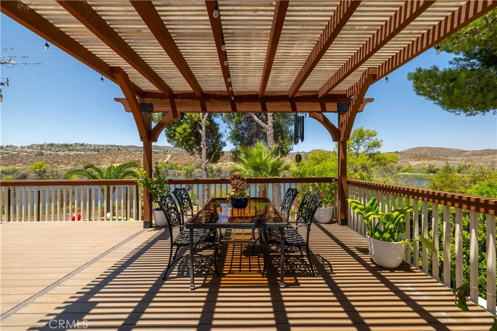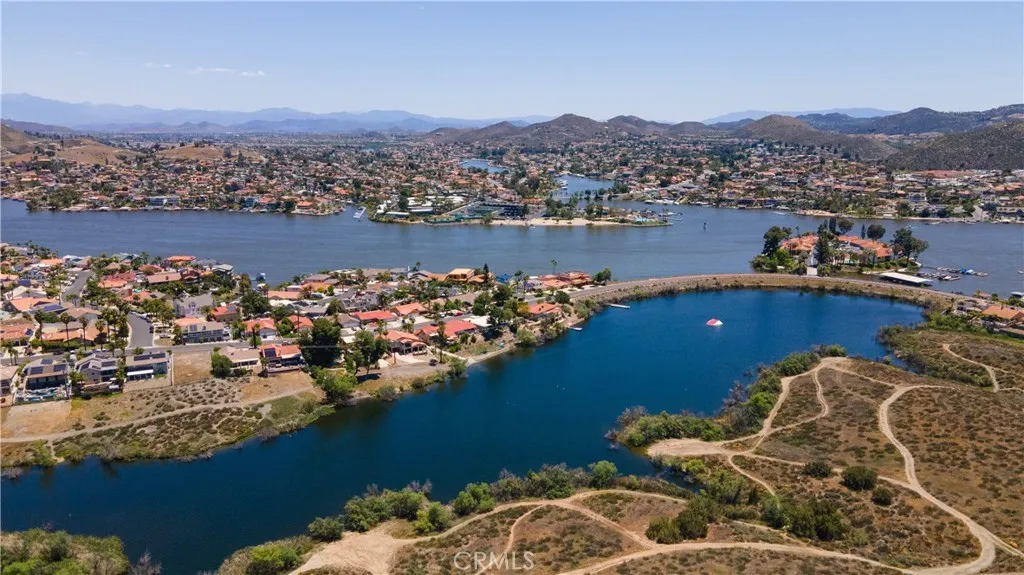 Rare Find! Waterfront Location with plans to expand & exclusive access to the Canyon Lake Ski Jump Lagoon. This home is ready for "Lake Life" Living at its finest, located on the North gate side of the lake & offers flat, 3 Car garage with pull through ability to backyard, paved boat ramp down to the water to launch your boat for secluded fishing, paddleboarding or canoeing. A Formal Entry welcomes you into the open concept living area with bright, energy efficient vinyl windows & wood-look tile flooring throughout the dining room with built in buffet hutch, kitchen with granite countertops with 2 breakfast bars, stainless steel appliances & plenty of storage are adjoined together by a cozy stone fireplace as the centerpiece of the family room. Enjoy California Indoor/outdoor living on the durable Trex decking patio slatted covered pergola to provide shade for perfect sunset views. Upstairs you will find shared bathroom with shower & tub, two ample guest rooms, one offering a slider leading to an East facing rooftop deck for Mountain views & Fourth of July Fireworks. The primary suite will not disappoint, with walk in closet, bathroom with dual sinks in vanity, en suite with recently remodeled luxurious shower. Along with a slider leading out to your private West facing deck of the Ski Jump Lagoon. Canyon Lake " A Little Bit of Paradise" is in Riverside County situated on a 400 acre lake with amenities in the community for all ages Boating & water sports of all kinds, Slalom/Jump Lagoons, Paddleboarding, Basketball, Pickleball, Tennis, Baseball Diamonds,Pump Track,Equestria