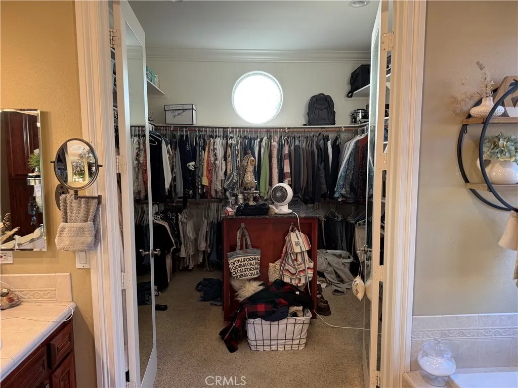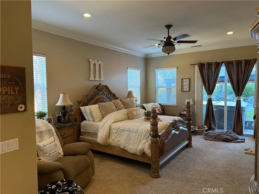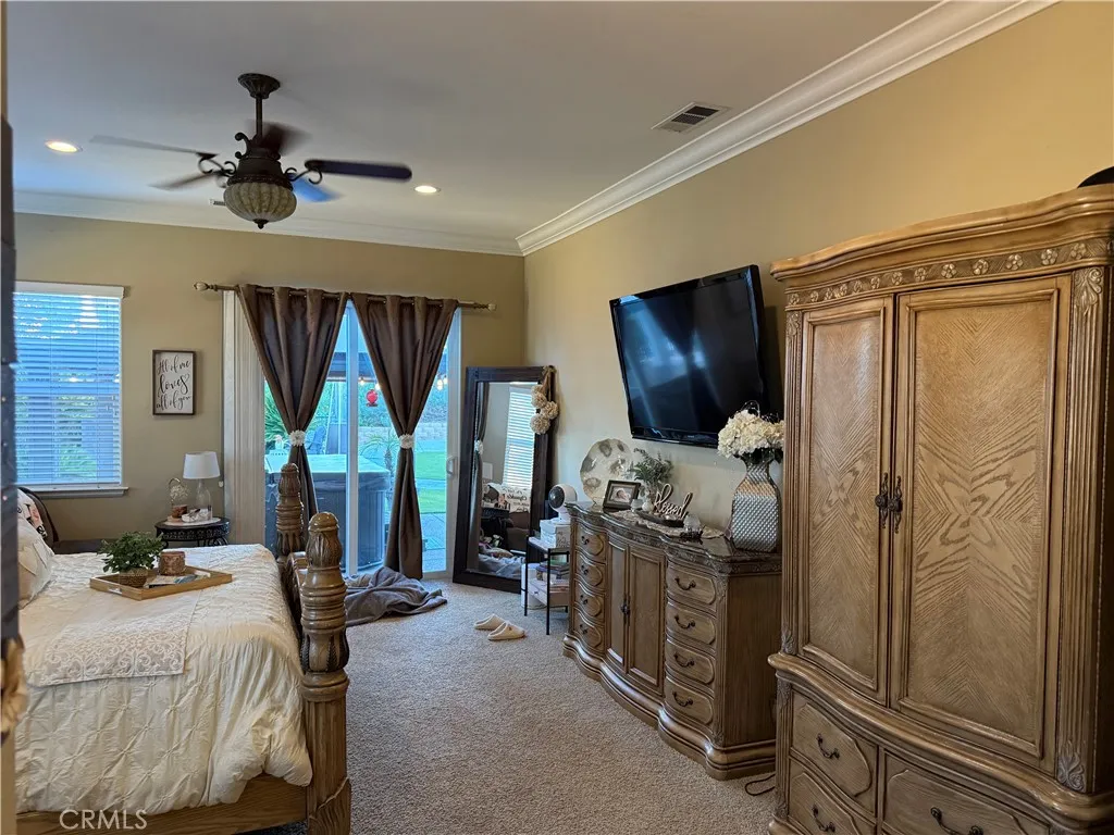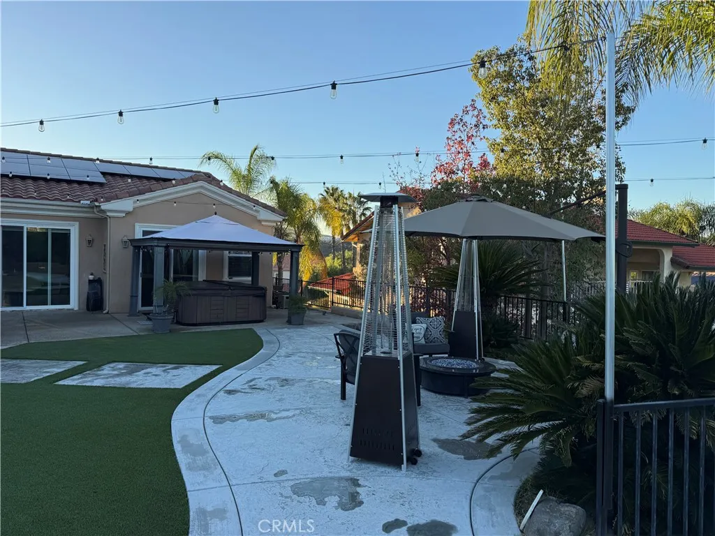 Stunning Custom Build Home in gated community with RV/Boat Parking. 5 Beds/ 4 Bath on the Golf Course! 30610 Early Round Dr, Canyon Lake, CA 92587 Stunningly gorgeous MODEL HOME on the 5th hole of the Canyon Lake Golf Course with amazing views, SOLAR, 5 bedrooms with 2 COMPLETE PRIMARY EN-SUITE BEDROOMS DOWNSTAIRS, 2.5 baths downstairs, and 3 FULL BEDROOMS with another FULL BATHROOM upstairs (last bedroom upstairs has a walk-In closet w/private terrace balcony). 2 SEPERATE DRIVEWAYS, one private back driveway entrance, both with RV PARKING! This house is a show stopper and will take your breath away when you come up the flagstone stairway and see the front travertine stone-covered massive front porch with a fire feature! The charm of the "old world" front wood 10-foot front door, and matching 3-car remote-controlled garage greets you. Upon entering this opulent home with crown molding high ceilings, whole house fan, tile/ wood laminate you are greeted by a distinguished front 2 Wine-refrigerator, Granite Bar/TV area. Show-stopping Kitchen with a granite Island adorned with tea lights, double ovens, mic., refrig., and stainless steel sink complimented by walnut-colored cabinets with granite countertops, and opens to your concrete fireplace Great Room with Views of the Golf Course! The living room currently has a pool table with a glass slider that opens to your darling backyard with 2 Gazebos, fire bowls, a fountain, and Jacuzzi with views of the golf course! Downstairs private laundry room. 3 Car Garage has epoxy-poured flooring/built-in cupboards. Upstairs you will find 3