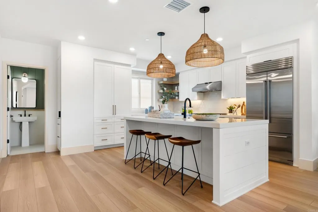 NEW construction, 2 blocks to Tamarack Beach! Experience coastal luxury at The Currentsa brand-new enclave of nine modern townhomes just steps from Carlsbads sunlit Tamarack Beach. Nestled on Chinquapin Avenue, this exclusive community seamlessly blends contemporary design with timeless seaside charm. 312 Chinquapin is move-in ready offering a lock and go lifestyle with 4 bedrooms, 3.5 baths, and 2,265 sq. ft. of thoughtfully crafted living space. Designed for effortless indoor-outdoor living, the home features a private fenced yard, two breezy decks, and an open-concept layout that invites natural light throughout. High-end finishes define the interiors: a chefs kitchen with Wolf and SubZero appliances, quartz countertops, and an oversized island; stylish LVP flooring; designer-selected tile, lighting, and hardware; plus Delta and Kohler plumbing fixtures. The great room extends seamlessly to a deck via stacking Western doors, while the primary suite offers a spa-like bath, expansive walk-in closet, and private deck retreat. Additional highlights include a first-floor guest suite, third-floor laundry, abundant storage, and an attached two-car garage. Smart, sustainable featuresowned solar and integrated home technologyenhance convenience and efficiency. Outdoors, the fenced yard is complete with a paver patio. Ideally situated two blocks from Tamarack Beach, steps from the Agua Hedionda Lagoon, and within walking distance to downtown Carlsbad Village, The Currents offers an unparalleled lifestyle. From morning runs along the coastline to sunset strolls through the Village,