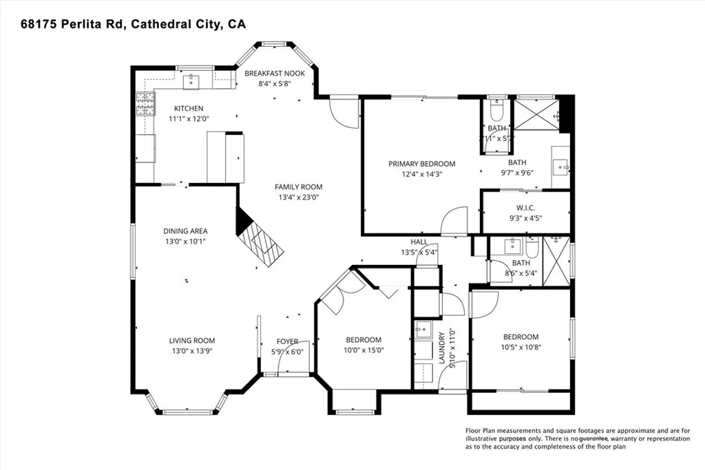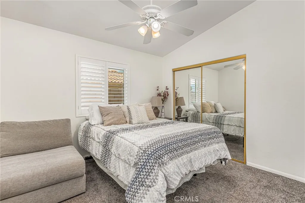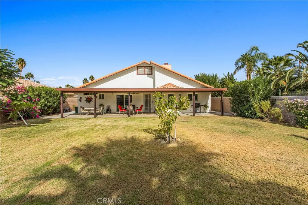 Single-story home in Cathedral City featuring 3 bedrooms and 2 bathrooms with tile flooring throughout the main living areas and carpet in each bedroom. Plantation shutters on every window add a clean, finished look and help control light and temperature. The open-concept kitchen includes granite countertops, white painted cabinets, a breakfast bar and a view into the family roomperfect for everyday living. Upon entry youll find a formal sitting area and dining area that flow into the main space. The primary suite offers a walk-in closet, walk-in shower, and slider door that opens to the patio. Both bathrooms feature walk-in showers with updated tile finishes. Indoor laundry room adds convenience. Outside youll find a covered concrete patio, block wall around the entire yard for privacy, and a storage shed for extra space. The backyard is a mini orchard with mango, pomegranate, orange, and guava trees to enjoy season after season. Located close to Cathedral Canyon Country Club, Panorama Park, local grocery stores, and easy access to Hwy 111. Includes 3D tour, video walkthrough, and interactive floor plan for virtual viewing. This well-maintained property offers comfortable single-level living and proximity to shopping, dining, and desert resorts.
