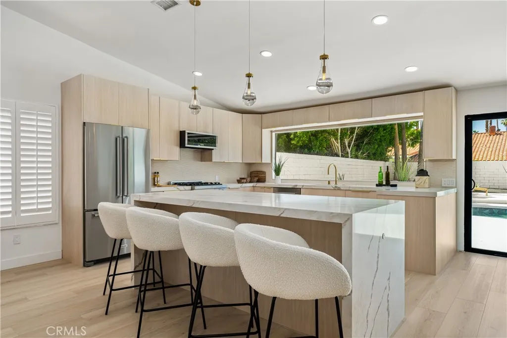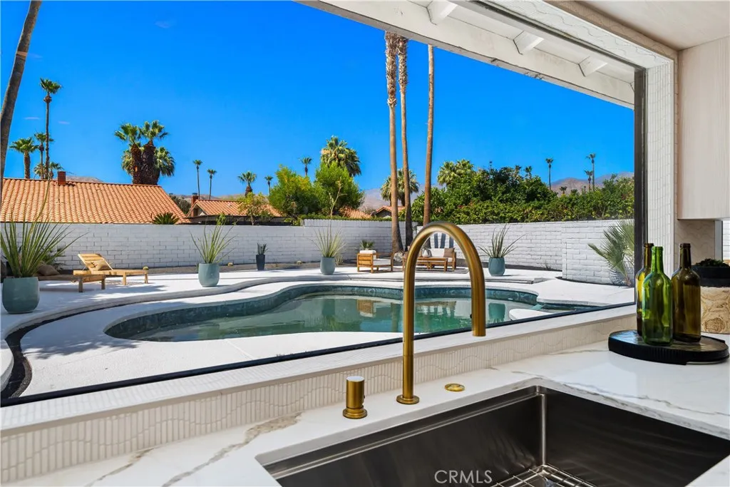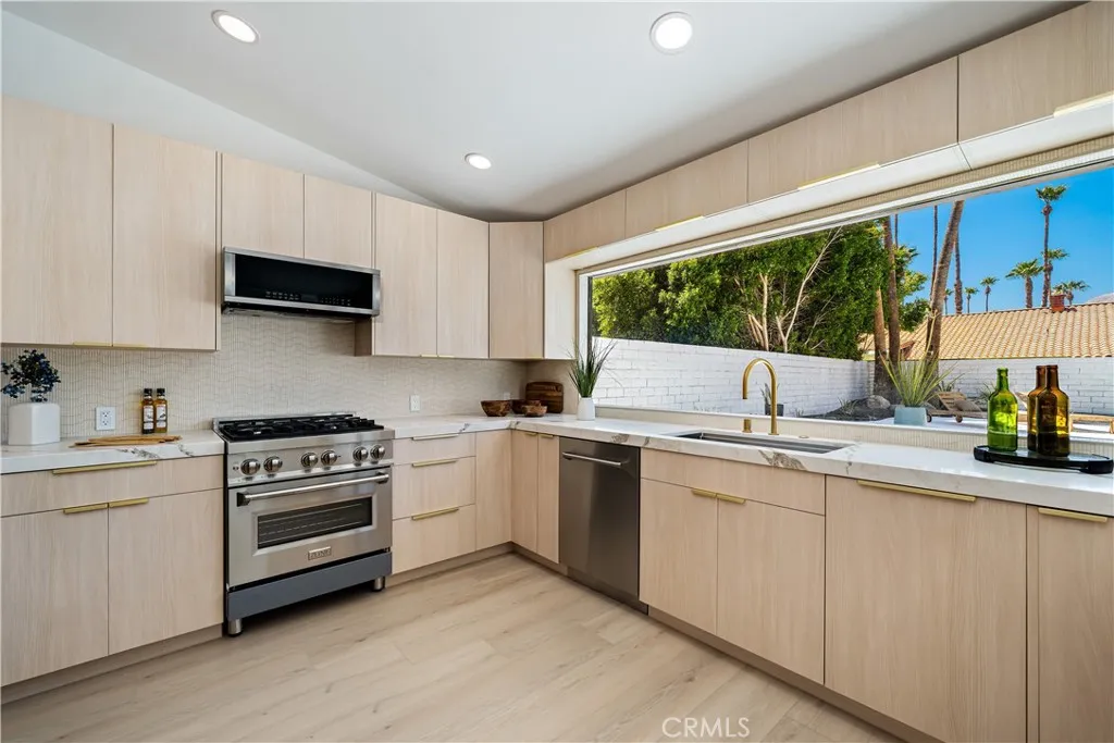 Full home inspection and pest / termite clearance completed and ready for review! Experience desert living redefinedan exceptional renovation where elevated design meets architectural artistry. Every inch of this home reflects premium construction, bespoke finishes, and modern desert sophistication seldom seen at this price point. A fully custom residence in a quiet, no-HOA neighborhood, it offers the perfect blend of privacy and conveniencejust moments from the heart of Rancho Mirage and Palm Springs. A 30-foot marble walkway welcomes you, setting the tone for the homes craftsmanship. Step down into an open-concept living area with vaulted ceilings, smooth-finish drywall, and wide-plank white oak LVP flooring. Perfectly positioned on a large South-facing lot (with plenty of room for an ADU), the space is filled with natural light by day and enhanced by dimmable LED lighting at night. The chefs kitchen is a true centerpiece, showcasing a professional-grade ZLINE dual-fuel range, waterfall-edge island with wine fridge, and a 10-foot architectural window overlooking the backyard. Custom white oak cabinetry with 9-ply birch boxes, luxury quartz by Tile Designs by Fina, European brass fixtures, and a limestone backsplash complete this designer-curated space by local designer Nicholas Lawson. The primary suite features a spa-inspired bath wrapped in designer tile, a walk-in shower with dual solid-brass towers, and a picture window overlooking the private yard. Copper penny tile flooring with copper glass grout adds a refined touch. Both bathrooms include smart toilets with bidet