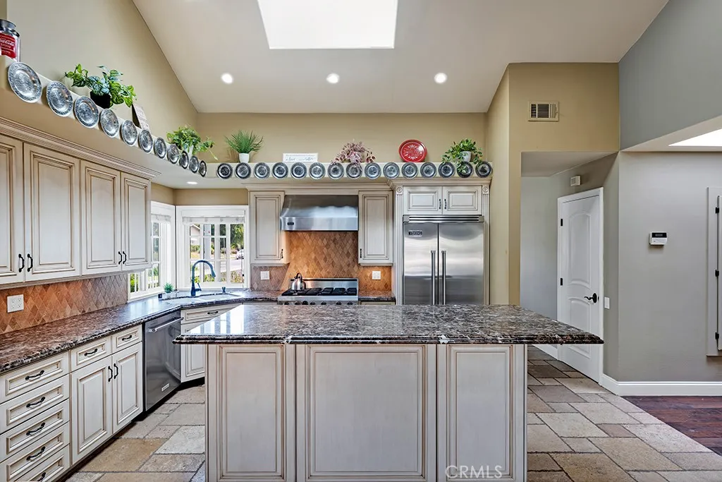 Charming, Updated Chatsworth Home On A Corner Lot! The beautifully remodeled kitchen is a showpiece, with marble counters, kitchen island & breakfast bar, Viking refrigerator/freezer, Viking stove/oven & range hood, plenty of counter top and cabinet space, and a skylight. The kitchen opens to the family room with a vaulted ceiling and French doors leading to the back yard - truly the heart of the home. Formal dining room with a vaulted ceiling. Formal living room with a vaulted ceiling and cozy fireplace and corner windows that make this a light and bright space. The primary suite features two closets & upper cabinets and a vaulted ceiling. The attached primary bathroom features a custom dual sink vanity and a large step in shower. Two additional spacious bedrooms. A remodeled full bathroom in the hallway. Smooth ceilings throughout. Dual pane windows. Recessed lighting. Travertine and engineered hardwood floors. Wired for an alarm system. Large, direct access, two car garage with the laundry and plenty of storage cabinets. Lots of curb appeal with a white picket fence surrounding the drought resistant front yard featuring a turf lawn area and a drip irrigation system for the plants and flowers. Huge back yard with a covered patio, spacious lawn area, and a koi pond with a waterfall feature. A great flow inside and out for gatherings and entertaining! Seller owned solar. Prime Chatsworth location. A definite must see!