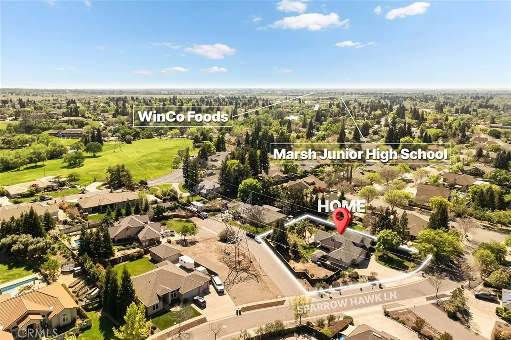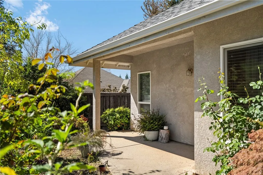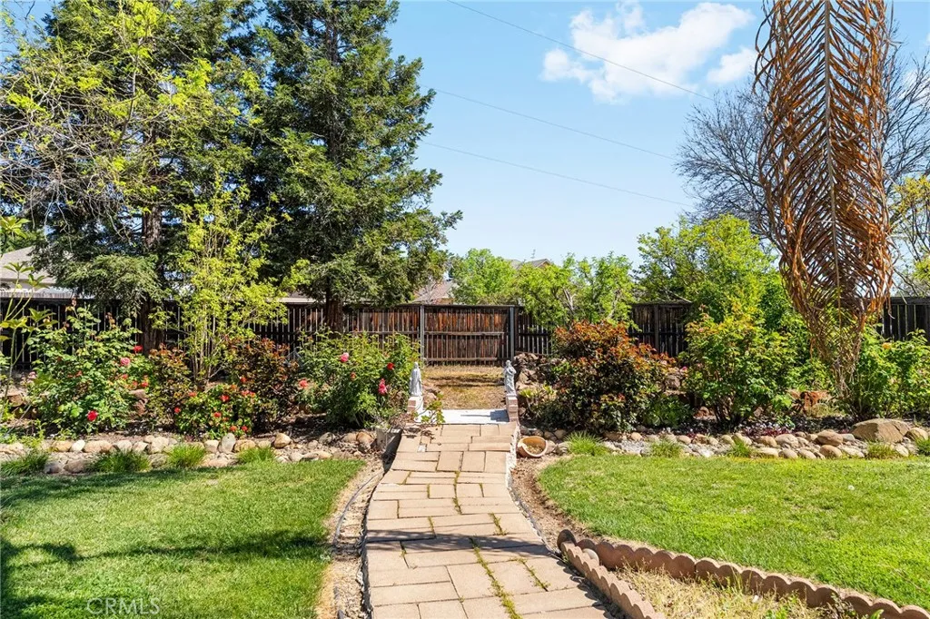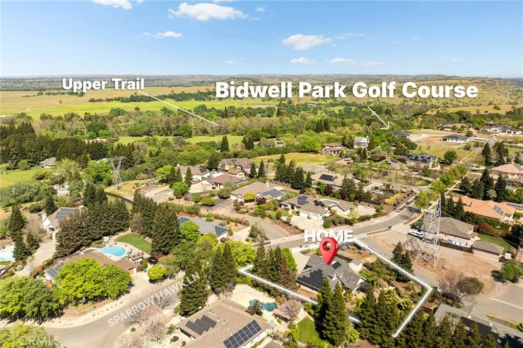 Set in a sought-after neighborhood near Upper Bidwell Park, this 4 bedroom, 2.5 bathroom home with owned solar offers a flexible layout and expansive outdoor space. This spacious 0.54-acre property offers a great outdoor setup with mature trees, roses, a garden area, and a large covered patio with extended flagstone walkwaysplus plenty of room to expand or customize. At the front of the home, French doors open to a flexible den or bonus space that works well as a home office, second living area, or potential 5th bedroom. Inside, the open layout is complemented by 10-foot ceilings, crown molding, and oversized baseboards, creating a comfortable and cohesive feel throughout. The main living and dining areas are anchored by a two-sided gas fireplace and offer nice views of the backyard. The kitchen is spacious and functional, featuring granite countertops, a tile backsplash, double ovens, an extra-large pantry, and a peninsula with bar seating that connects to the dining areaideal for everyday living and entertaining. The downstairs primary suite offers privacy and space, complete with a large walk-in closet and an en-suite bathroom with dual sinks, a jetted tub, separate shower, and privacy door. Also downstairs is a half bath and an indoor laundry room with a sink, counter space, and plenty of storage. Upstairs, youll find three generously sized bedrooms and a full bathroom. Additional features include whole-house sound wiring, a 3-zone HVAC system, a whole house fan, and owned solar for added efficiency. The backyard is expansive and thoughtfully laid out with mature landsc