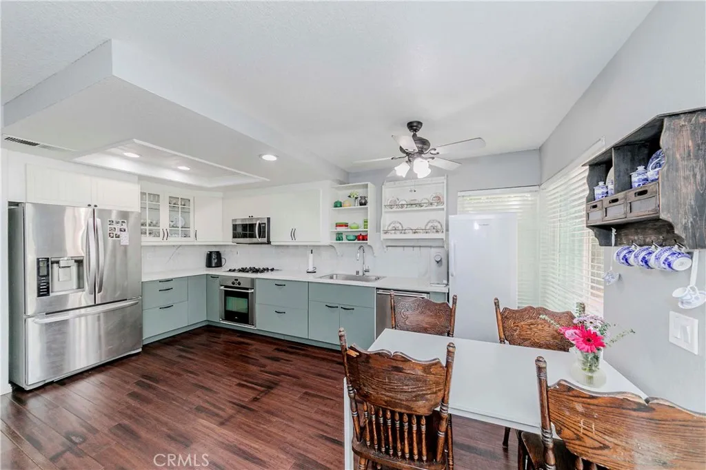 Welcome to this beautifully updated home featuring a remodeled modern kitchen with custom cabinets, quartz countertops, stainless steel appliances, full backsplash, and a single-bowl sink. Seller has replaced the AC/heating system, water heater, dual-pane windows and sliding doors, and fences. The open layout connects the kitchen to the family room and breakfast area, where a cozy fireplace overlooks the backyard. The living room offers cathedral ceilings and flows into the formal dining area, creating a bright and open feel. Additional upgrades include wood-look flooring, dual-pane windows, and fresh interior paint. The fourth bedroom features double doors adjoining the primary suite, offering a flexible space for a nursery, office, or private retreat. The primary bedroom features an en-suite bathroom with an oversized tub, double sinks, a water closet, and a generous walk-in closet. Located on a private lot with no home behind, the property offers a wide 180-degree mountain view. Minutes to award-winning Oak Ridge Elementary and nearby parks. A wonderful place to call home.
