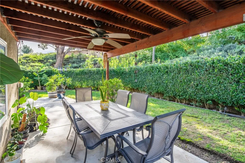 A charming home in one of Chino Hills most desirable neighborhoods with excellent schools by Los Serranos Country Club. Step inside to a beautifully designed 3 bedrooms, 2.5 bathrooms interior featuring, soaring vaulted ceilings, recessed lightings, durable vinyl flooring, fresh paint throughout, and an abundance of natural light streaming through the large double pane windows that brings warmth and air. The spacious living area offers an excellent entertainment wall, while the adjacent modern kitchen is equipped with granite countertops, stainless steel appliances, custom built cabinetry, and dining area with extra pantry storage. A convenient half bath is located near the attached two-car garage. Upstairs, youll find all three bedrooms, including a generous primary suite with a panoramic closet and a remodeled bathroom. Two additional well-sized bedrooms and a full hallway bath complete the upper level. Enjoy outdoor living with a low-maintenance backyard. 9+ feet hedges surround the property providing extra privacy, a covered patio with a beautiful outdoor dining set, a side sanctuary with fruit trees and a large shed that provides more storage for your holiday decorations. This property sits on a larger corner lot, no rear neighbors, long driveway provides extra parking at the turn point. With no HOA, low property taxes, and a short walk to Wickman Elementary, this home offers exceptional value, fitting for first time home buyers, small families or investors for rental income. Youre also just minutes from Chino Hills State Park, scenic hiking trails, shopping, dining, a