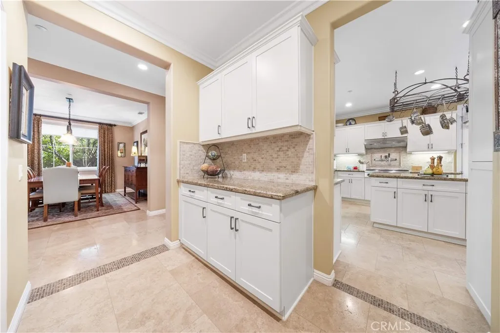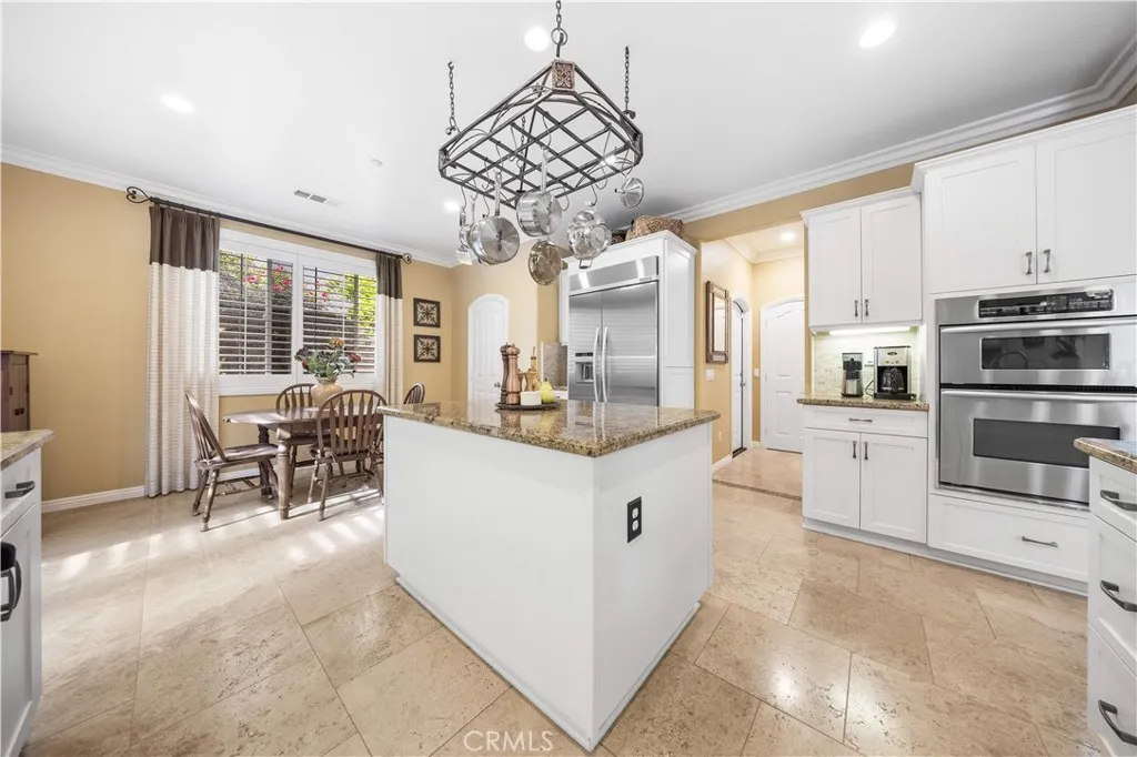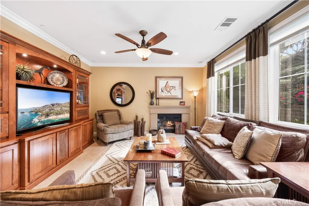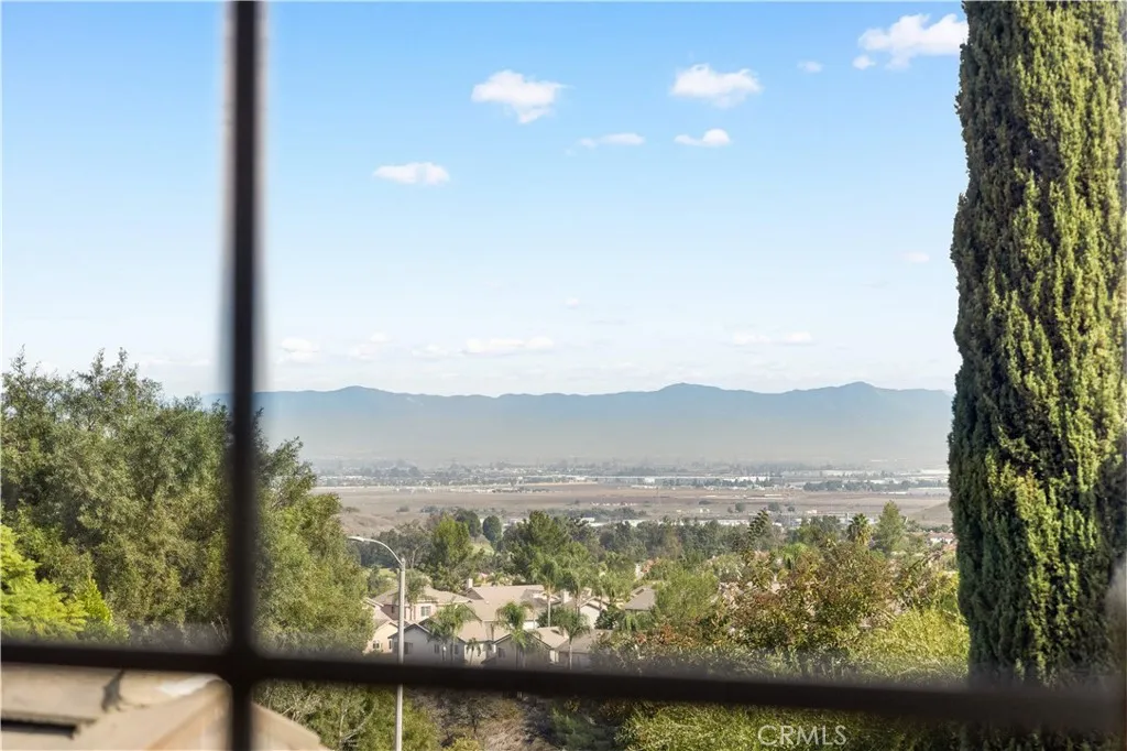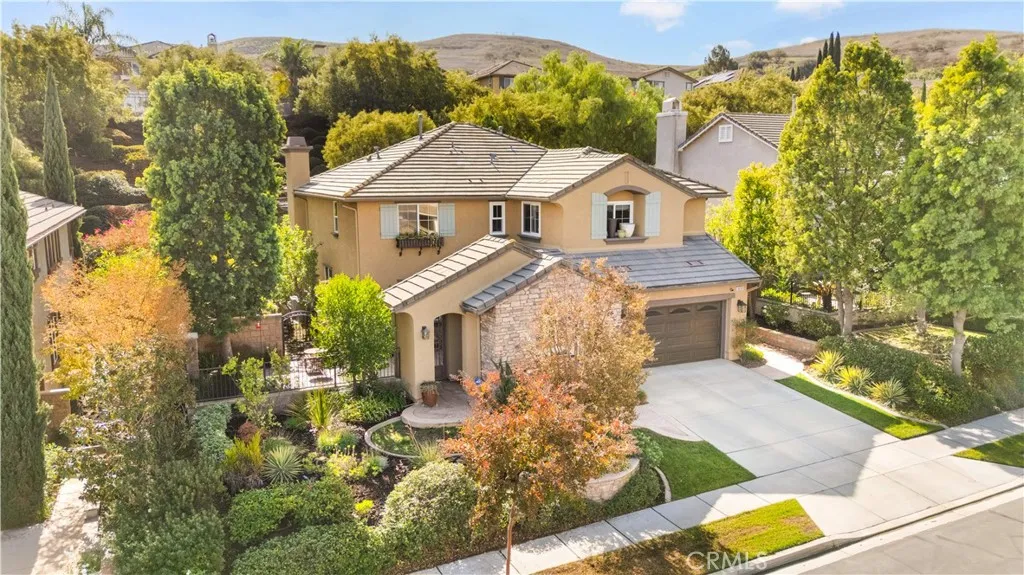 Super well-maintained! Shows like a model home! This beautiful Ridgegate community property features 4 bedrooms plus a home library, 2.5 bathrooms, and a 3-car attached garage. From the wrought-iron gate to the front courtyard, you are welcomed by an elegant water fountain. The large living room is open and bright, and the formal dining room features a custom chandelier. The remodeled kitchen includes granite countertops, a center island, full mosaic backsplash, white shaker cabinets, and stainless-steel appliances including a KitchenAid built-in refrigerator, 6-burner cooktop, hood, built-in microwave and oven, and a walk-in pantryperfect for cooking and everyday use. The family room offers large windows and a cozy fireplace. The unique downstairs home library features wood flooring and built-in bookshelves. A half bathroom on the main floor is ideal for guests. The primary bedroom offers a large walk-in closet with organizers and beautiful views of the hills and greenbelt. The primary bathroom includes dual sinks, a soaking bathtub, and a separate shower with frameless glass enclosures. The additional bedrooms also enjoy city lights and mountain views. Additional features include custom two-tone paint, travertine flooring in the living room, dining room, family room, kitchen, and bathrooms; wood flooring in the bedrooms and library; newer carpet in stairs; custom window curtains; wood shutters; crown molding; recessed lighting; ceiling fans; an upstairs laundry room with sink; a whole-house water filtration system, two new A/C and heating systems, newer water heater, some