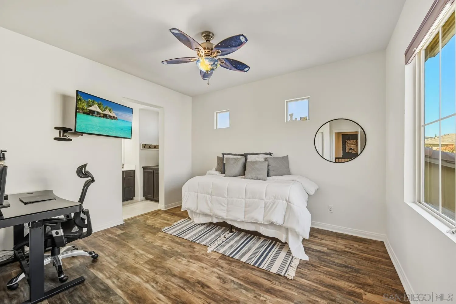 Beautifully upgraded and energy-efficient, this Winding Walk gem in Chula Vista features 22 OWNED solar panels and a newer high-efficiency HVAC system for year-round comfort. The stylish kitchen boasts quartz countertops, a custom tile backsplash, wine fridge, and custom cabinetry, while the home also includes a tankless water heater and updated bathrooms with porcelain tile and a beautifully tiled primary shower. The functional layout offers plank tile flooring on the first level, luxury vinyl plank upstairs, and carpet only on the stairs. Enjoy a full bedroom and bathroom on the first floor, a cozy living room fireplace. Beautiful primary suite features custom barn doors in the primary suite, huge bath, shower and backsplash is Calacata white marble Porcelain herringbone tile. Sound proofed flooring upstairs is an added bonus. The attached 3-car garage pairs perfectly with a long driveway for additional parking. Located near Otay Lakes and the Olympic Training Center, this home sits within the highly desirable Winding Walk community, known for its top-tier amenities, including sparkling pools, a spa, recreation areas, Winding Walk Park with 7.1 acres of open green space, ballfields, barbecue areas, basketball courts, picnic spaces, playgrounds, a skateboard park, soccer fields, tennis courts, and scenic recreational trails. A perfect blend of comfort, convenience, and community living!