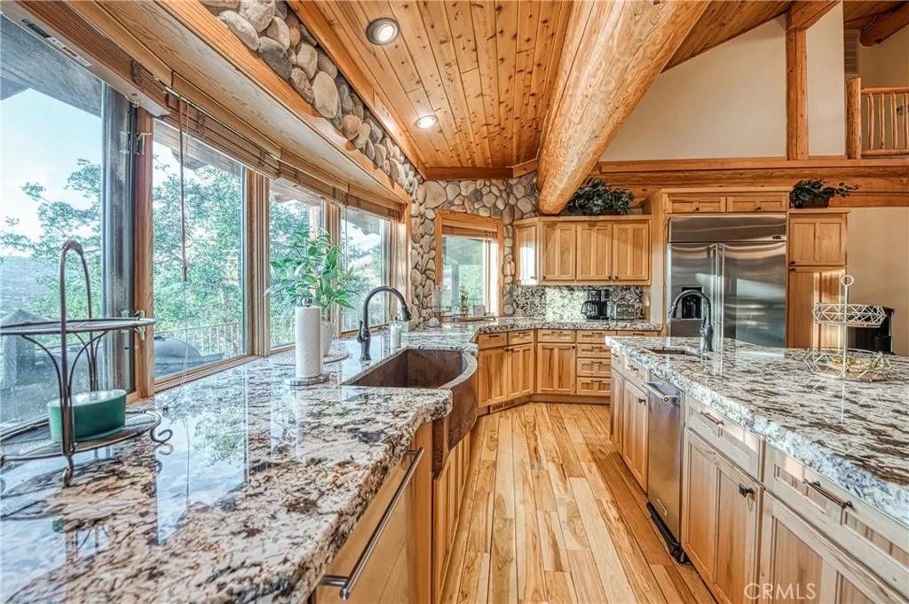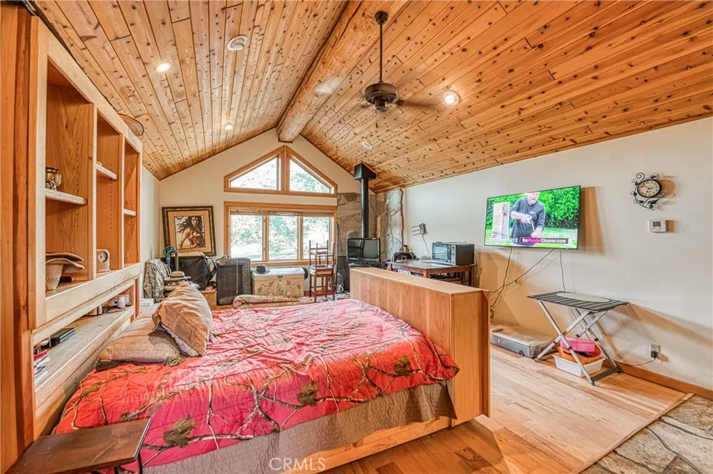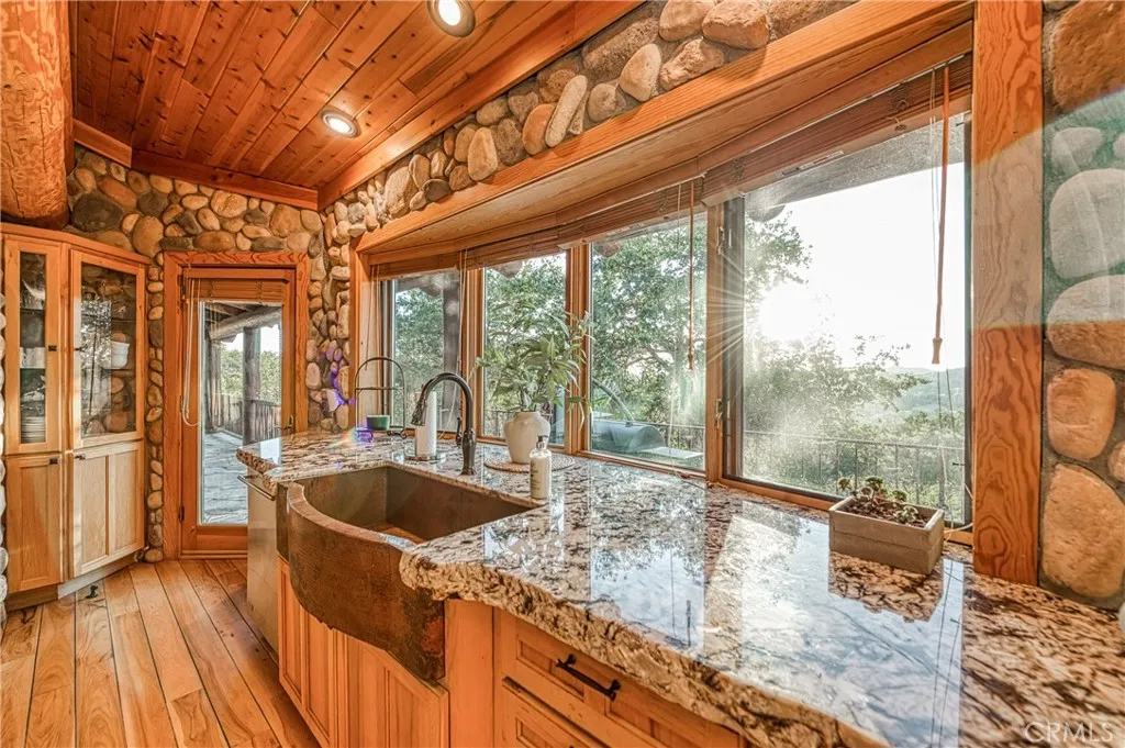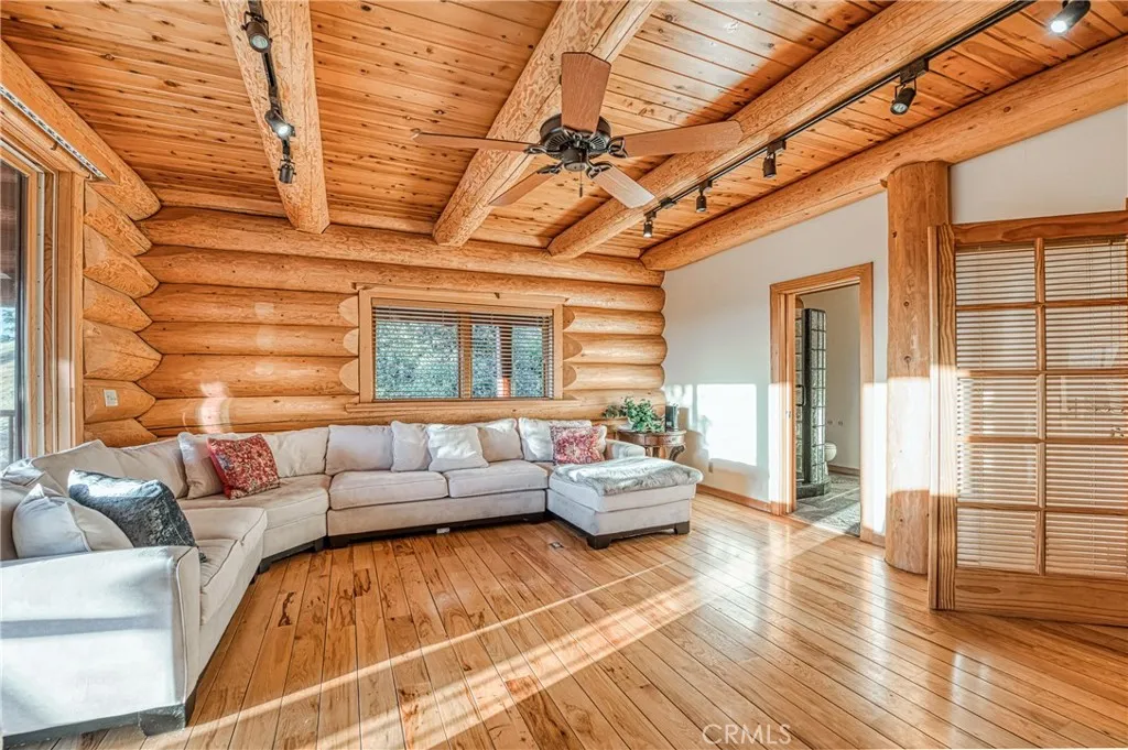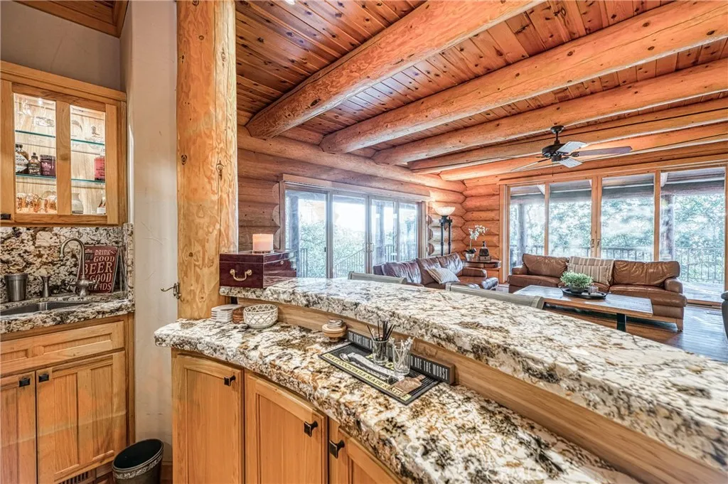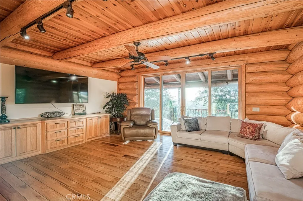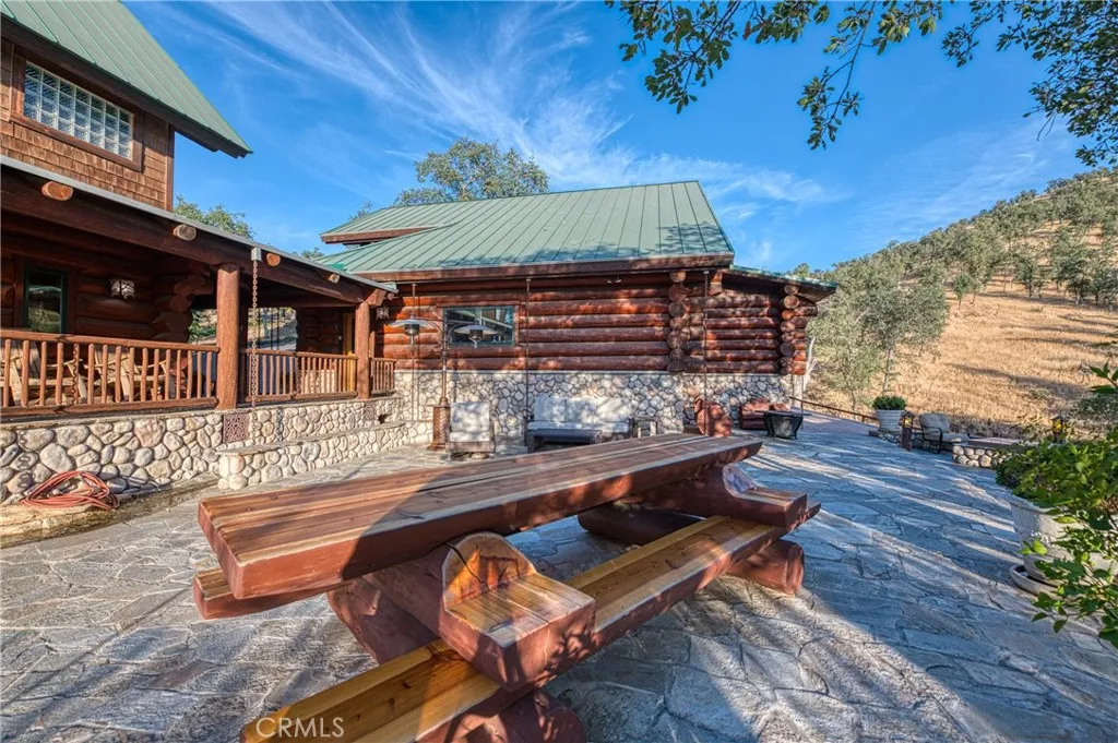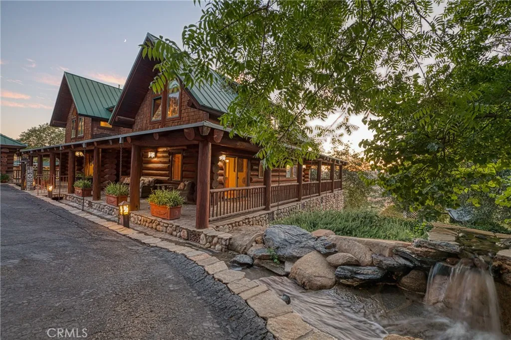 An extraordinary 40+/- ac ranch retreat where Canadian Blue Spruce log construction meets timeless craftsmanship and modern comfort. Tucked inside a private, gated community just 25 minutes from Clovis, this one-of-a-kind estate offers the rare opportunity to live on land without sacrificing luxury. The main residence spans over 4,200 sq. ft., featuring 5 spacious bedrooms and 4.5 baths, plus a detached ADU above the oversized 4-car garage perfect for multigenerational living or guest stays. Soaring wood-beamed ceilings, river rock fireplaces, and handcrafted details throughout evoke the warmth of a mountain lodge. Outdoors, a fully stocked fishing pond, fenced garden with raised beds, and covered livestock barn make this a true rancher's paradise. An inground spa and stone patio with a built-in outdoor kitchen and fire pit invite you to entertain under the stars. With panoramic views of Table Mountain and endless room to roam whether horseback riding, off-roading, or simply enjoying the sunset this property is ideal for hobby ranchers, outdoor enthusiasts, or anyone seeking a peaceful, self-sustaining lifestyle surrounded by natural beauty.