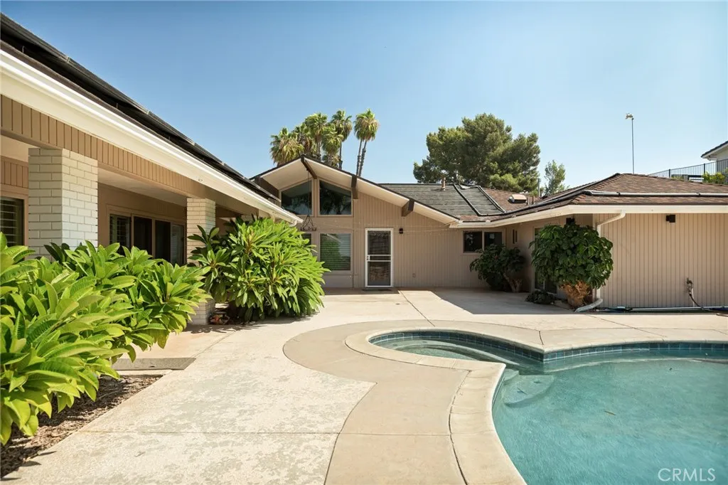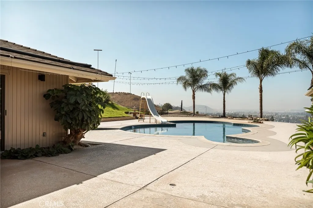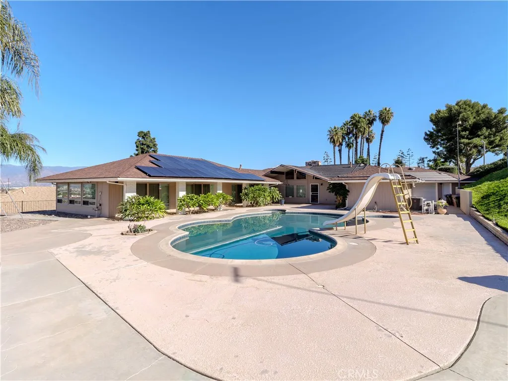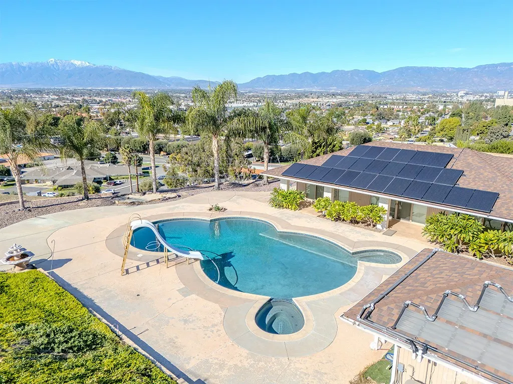 Experience luxury living at its finest in this beautifully updated mid-century modern home. Nestled in the desirable Indian Knolls hillside, just minutes from Loma Linda University, with convenient access to both I10 and the 215 freeways. Step thru the elegant double glass door entry into an expansive living space filled with natural light. The home's open beam ceilings create an airy, architectural feel that perfectly complements its mid-century modern design. The thoughtfully designed floor plan wraps around the stunning backyard pool area, creating a seamless indoor-outdoor flow ideal for entertaining or relaxing in privacy. The spacious living room features a cozy fireplace and large windows framing spectacular views of the mountains and city lights. Down the extra wide hallway, lined with cabinets, large windows overlooking the pool, are three spacious bedrooms and two beautifully remodeled bathrooms, including a luxurious primary suite with a walk-in shower and breathtaking views. Huge closets in the master have cabinetry and are fully mirrored. On the opposite wing, enjoy a family room with a classic rock fireplace and hearth. The gourmet kitchen showcases an 8 burner Kucht professional range, double ovens, a massive granite island with seating, abundant cabinets and desk space. The Dining room is adjacent and overlooks the peaceful, quiet front entrance. A private fourth bedroom and bath are on the South side has both private entry and sliding door to the pool. The large laundry room with sink offer a perfect setup for multi-generational living or guests. Garage acc
