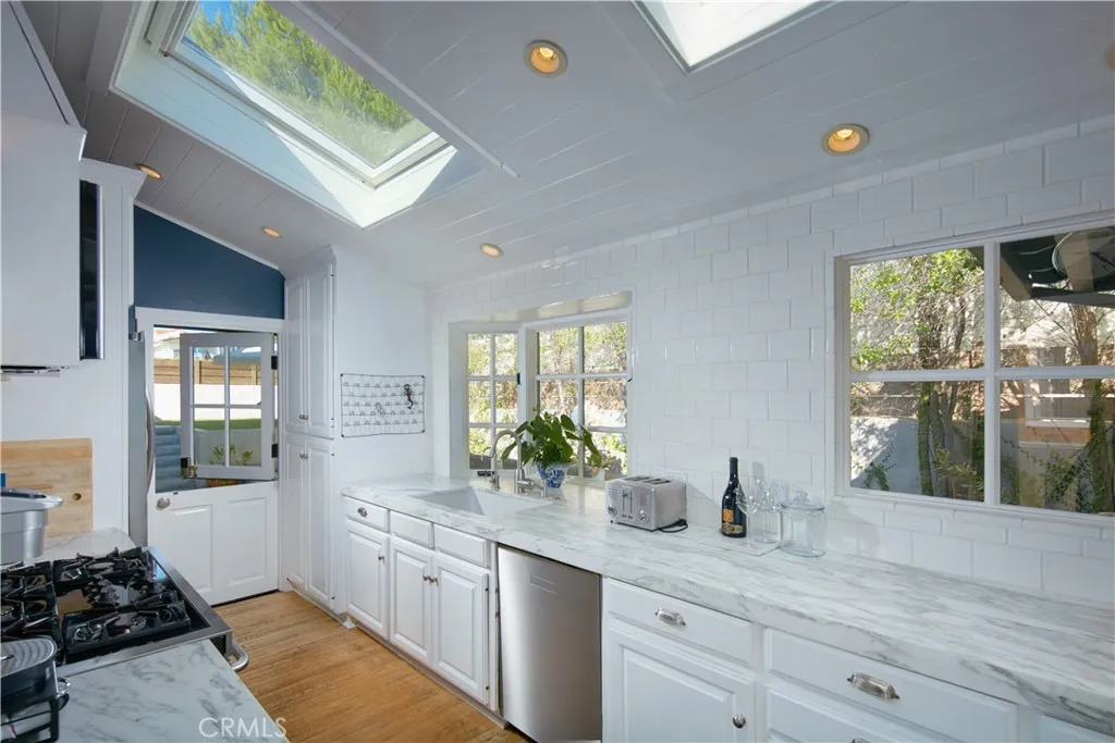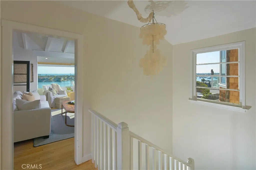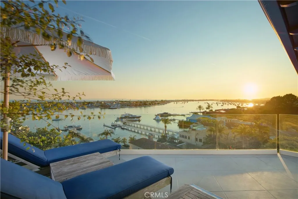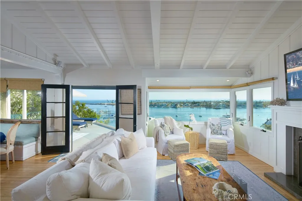 Crowning one of Corona del Mars finest ocean-view homesites, this beautifully updated and maintained coastal cottage offers spectacular unobstructed vistas of the Pacific Ocean, Newport Harbor, Balboa Peninsula, Catalina Island and city lights. The highly coveted and rare lot is desired for its premium blufftop location above Bayside Drive, placing it within minutes of beaches, the water, Fashion Island and Corona del Mars shops and restaurants. Spectacular panoramic views embellish both levels of the three-bedroom, three-bath home, which reveals a classic California beach style with a Dutch entry door, vaulted-open-beam ceilings, private entry patio with enormous shade tree, and large picture windows. Wood flooring adorns the top floor, where a great room with fireplace and built-in dining area opens to an upgraded kitchen with skylight, stone countertops, white cabinetry, stainless steel appliances, a breakfast bar, pantry and open shelving. One bedroom is located on this floor, and two more are featured downstairs, including a split-level bedroom with sitting room, deck access and separate sleeping areas. Unparalleled ocean and harbor views continue in an oversized primary suite that hosts a sitting area, walk-through closet, rain shower, vessel sinks, and view-enriched sun and shade decks with a fire pit and hot tub.