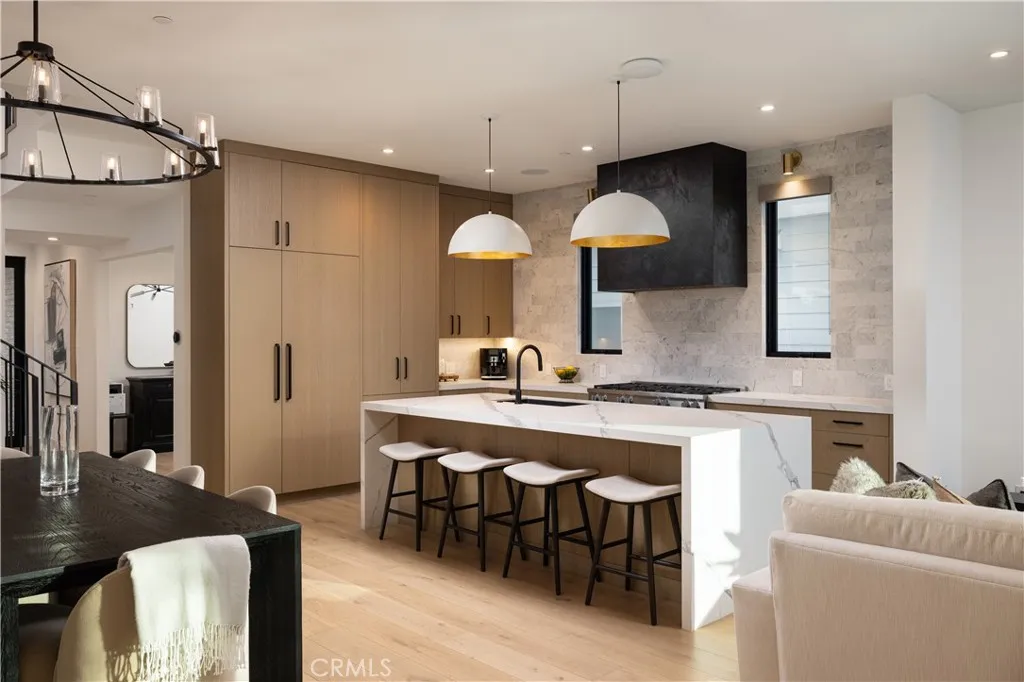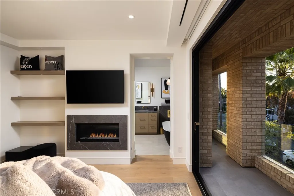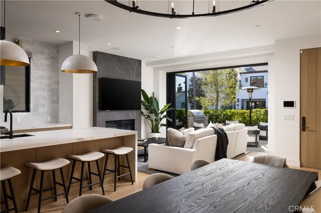 In one of Corona del Mars most coveted enclaves, this coastal retreat captures the essence of luxury village livingwhere curated interiors and seamless indoor-outdoor flow define every space. Completed in 2022, this front-unit residence offers approximately 1,761 square feet of refined living space with three bedrooms and three-and-a-half baths, just four blocks from the beach. A quintessential front patio sets the stage, featuring a built-in BBQ, gas fire pit, and accordion glass doors that open to a warm, inviting great room. Inside, European white oak flooring, abundant natural light, and a statement electric fireplace complete the space with warmth and style. A dedicated dining area connects the living space to a magazine-worthy kitchen, showcasing Miele cooktop and 8-burner range, Liebherr column fridge and freezer, hand-troweled plaster hood, waterfall-edge quartz island, and a striking stone backsplash. Further along, a main-level ensuite bedroom offers flexible use as a guest retreat or home office and opens to a peaceful rear courtyard. Upstairs, the primary suite is a private sanctuary with its own electric fireplace, glass sliding doors to a covered terrace, and a spa-inspired bath complete with dual quartz vanities, soaking tub, and walk-in shower. A secondary ensuite bedroom and full laundry room complete the upper level. Crowning the home, an expansive rooftop deck boasts panoramic views of the ocean, city lights, and iconic palms. Additional highlights include white oak interior doors, custom closet buildouts, Rocky Mountain hardware, and Control4 smart home